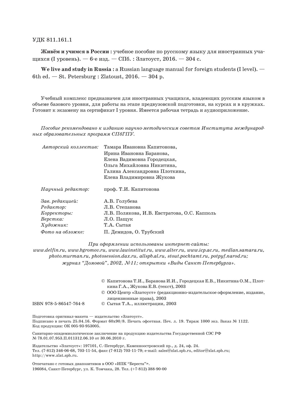 Учебный комплекс предназначен для иностранных учащихся, владеющих русским языком в объеме базового уровня, для работы на этапе предвузовской подготовки, на курсах и в кружках.Готовит к экзамену на сертификат I уровня. Имеется рабочая тетрадь и аудиоприложение.