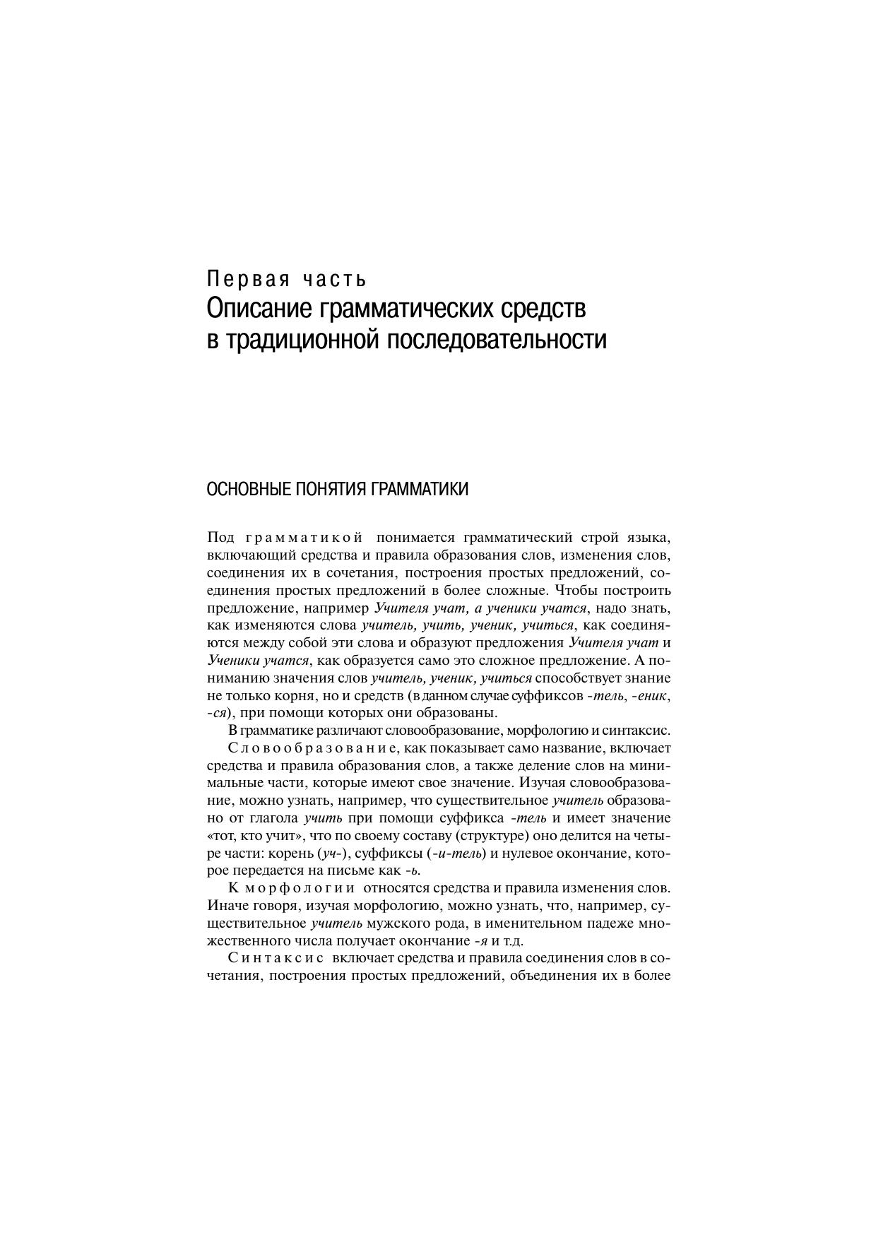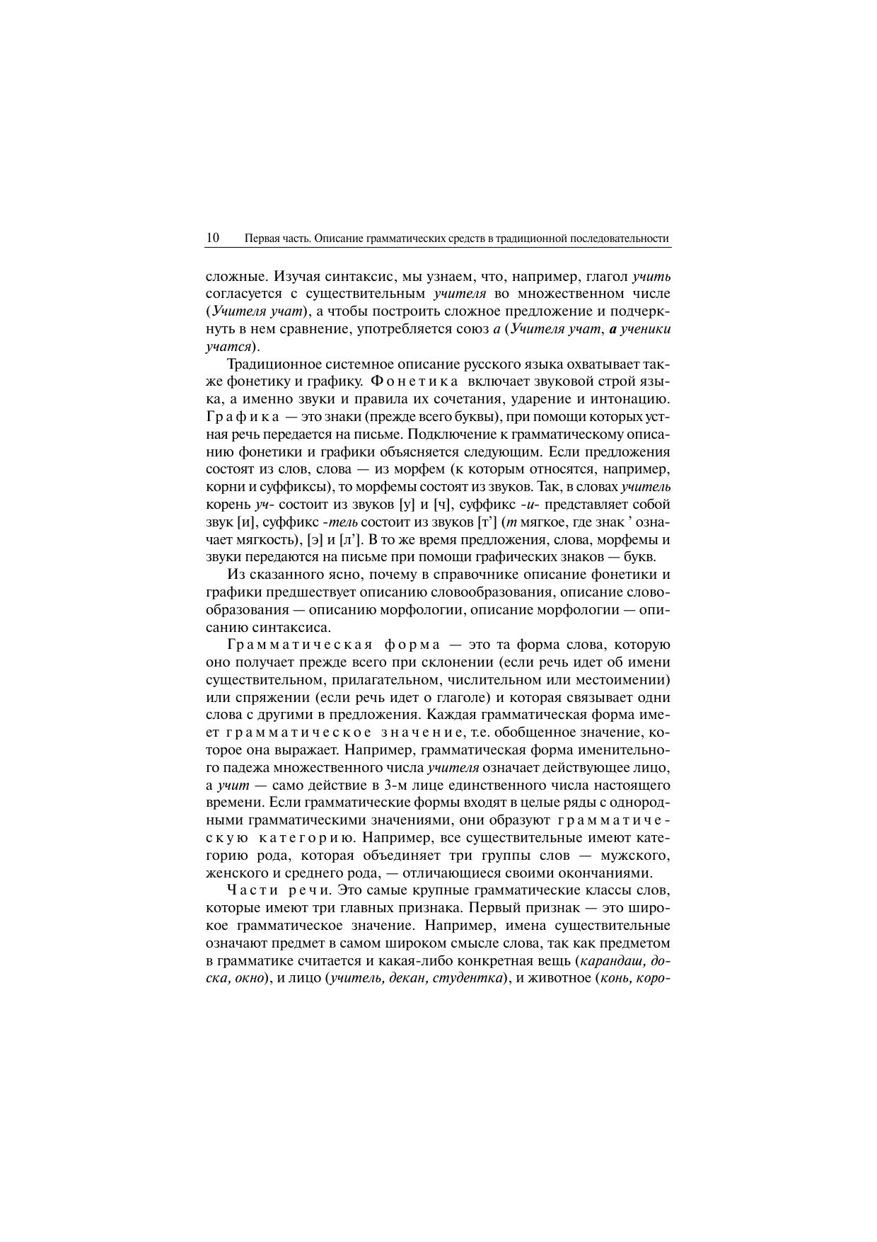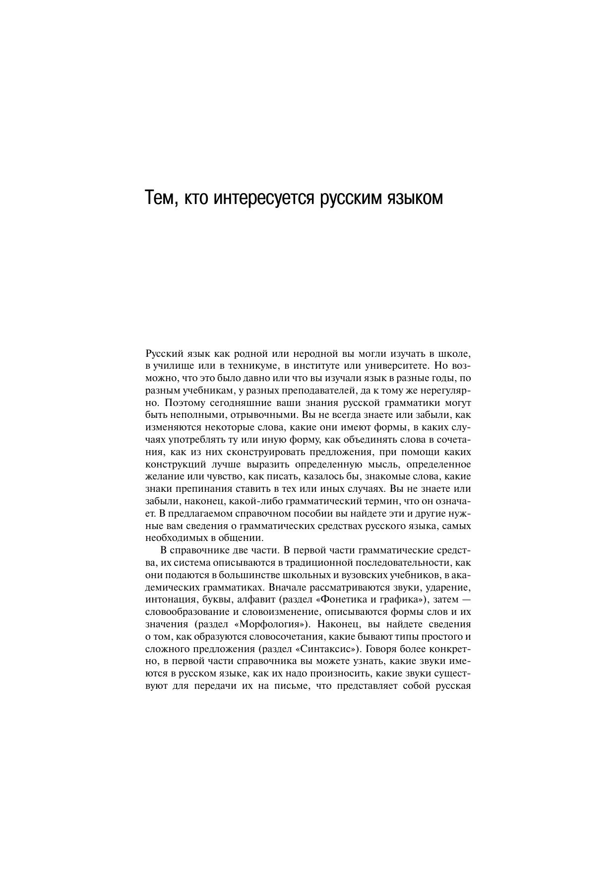Грамматический справочник содержит краткое описание грамматических средств русского языка и предназначен для тех, кто хочет получить сведения об их значении, произношении, употреблении в разных стилях речи, правильном написании, об основных понятиях и терминах грамматики. В справочнике две части. В первой части представлено традиционно-системное описание грамматических средств русского языка, которое принято в академических и вузовских грамматиках, во второй — их функционально-системное описание. Имеются таблицы, предметный указатель и список основной литературы. Книга предназначена для лингвистов, преподавателей, аспирантов и студентов филологических факультетов, учителей средней школы.