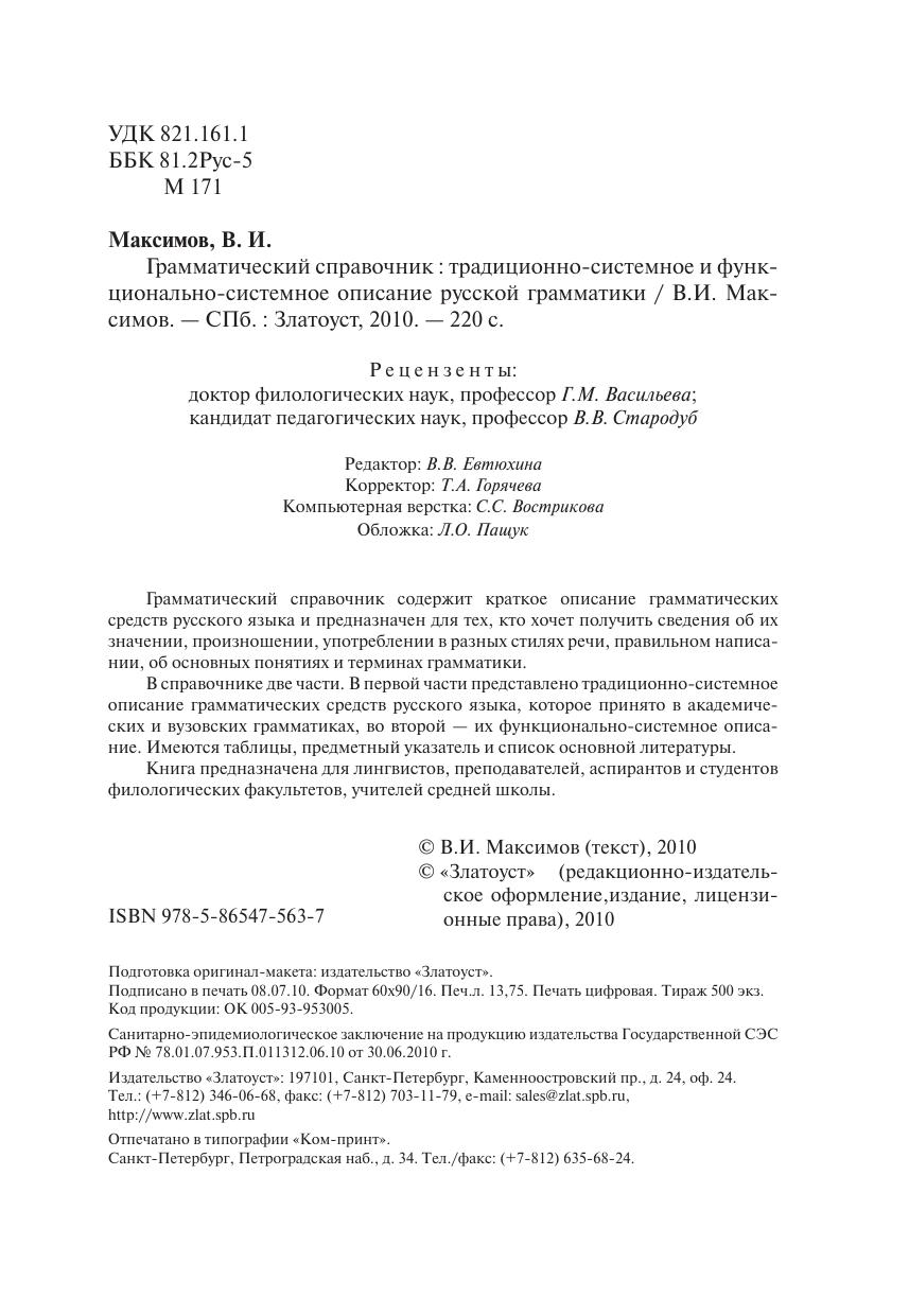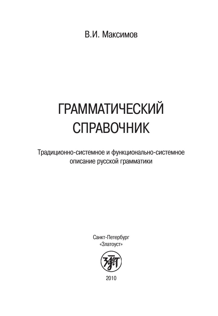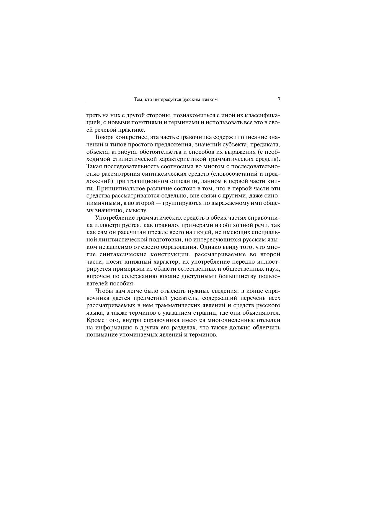 Грамматический справочник содержит краткое описание грамматических средств русского языка и предназначен для тех, кто хочет получить сведения об их значении, произношении, употреблении в разных стилях речи, правильном написании, об основных понятиях и терминах грамматики. В справочнике две части. В первой части представлено традиционно-системное описание грамматических средств русского языка, которое принято в академических и вузовских грамматиках, во второй — их функционально-системное описание. Имеются таблицы, предметный указатель и список основной литературы. Книга предназначена для лингвистов, преподавателей, аспирантов и студентов филологических факультетов, учителей средней школы.