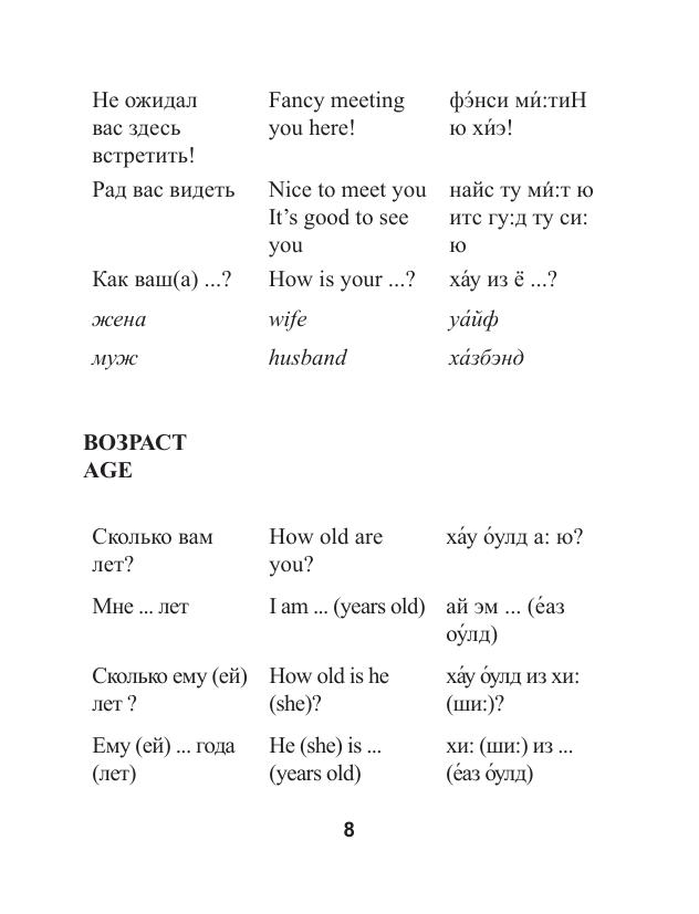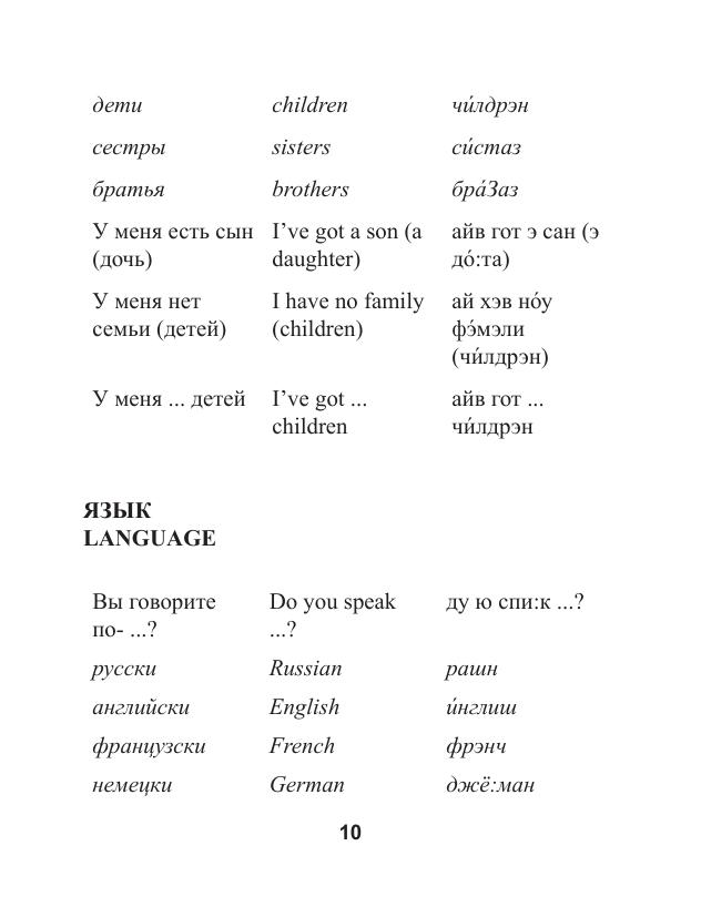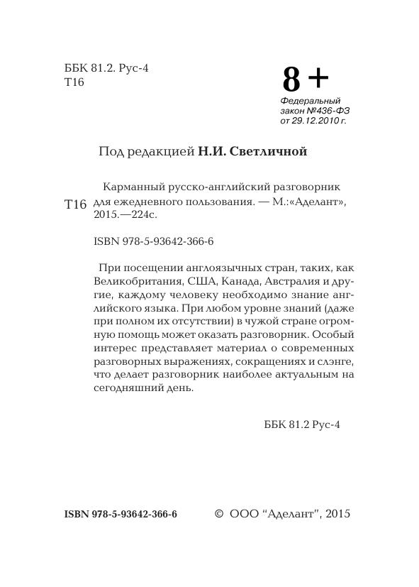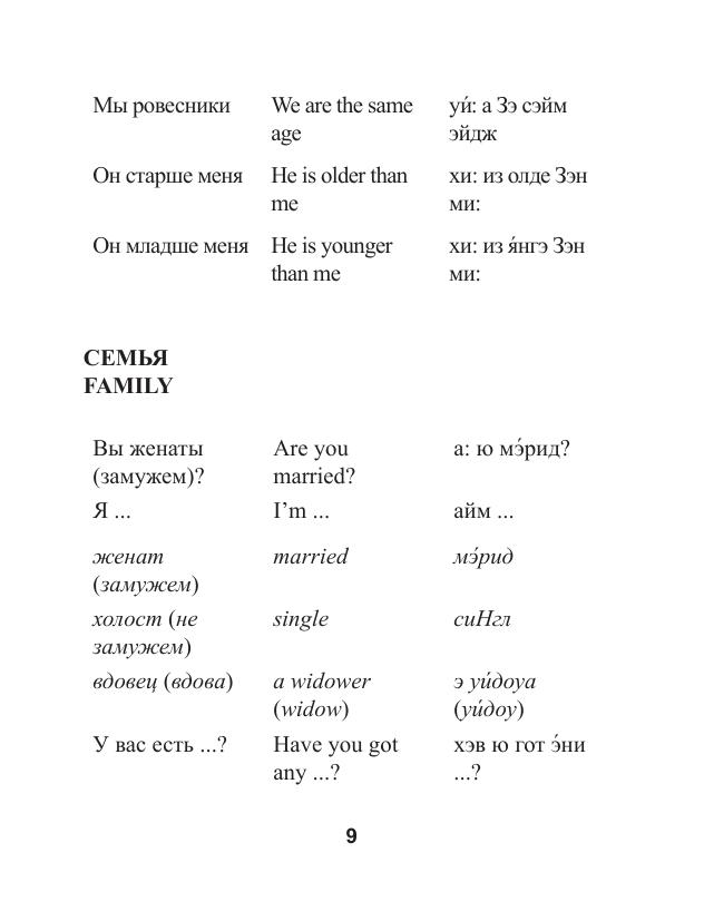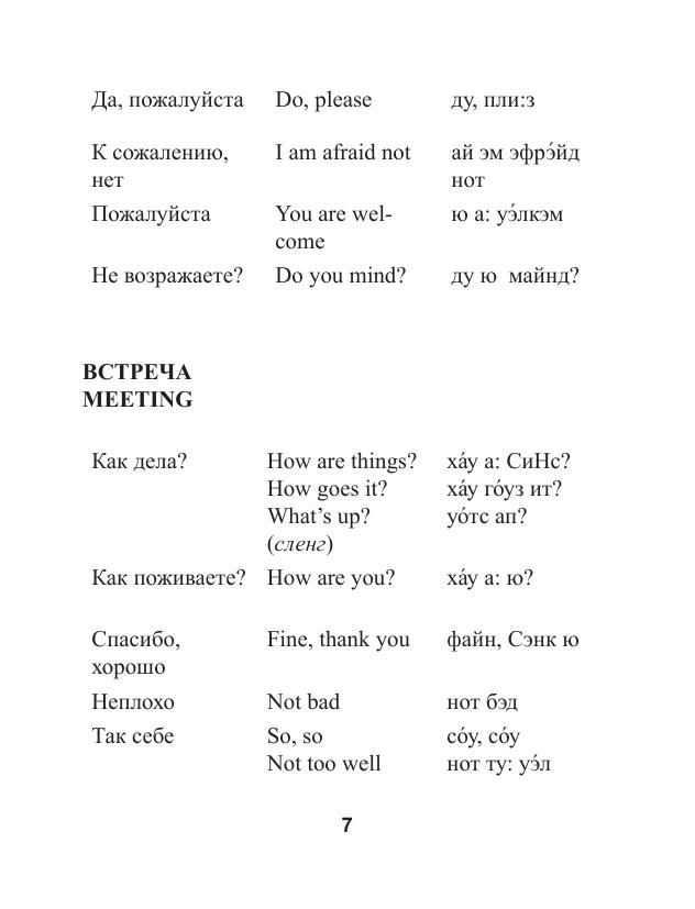 При посещении англоязычных стран, таких, как Великобритания, США, Канада, Австралия и другие, каждому человеку необходимо знание английского языка. При любом уровне знаний (даже при полном их отсутствии) в чужой стране огромную помощь может оказать разговорник. Особый интерес представляет материал о современных разговорных выражениях, сокращениях и слэнге, что делает разговорник наиболее актуальным на сегодняшний день.