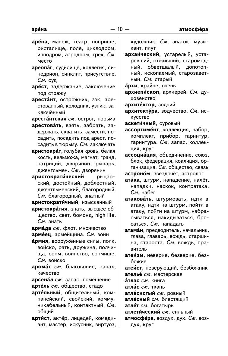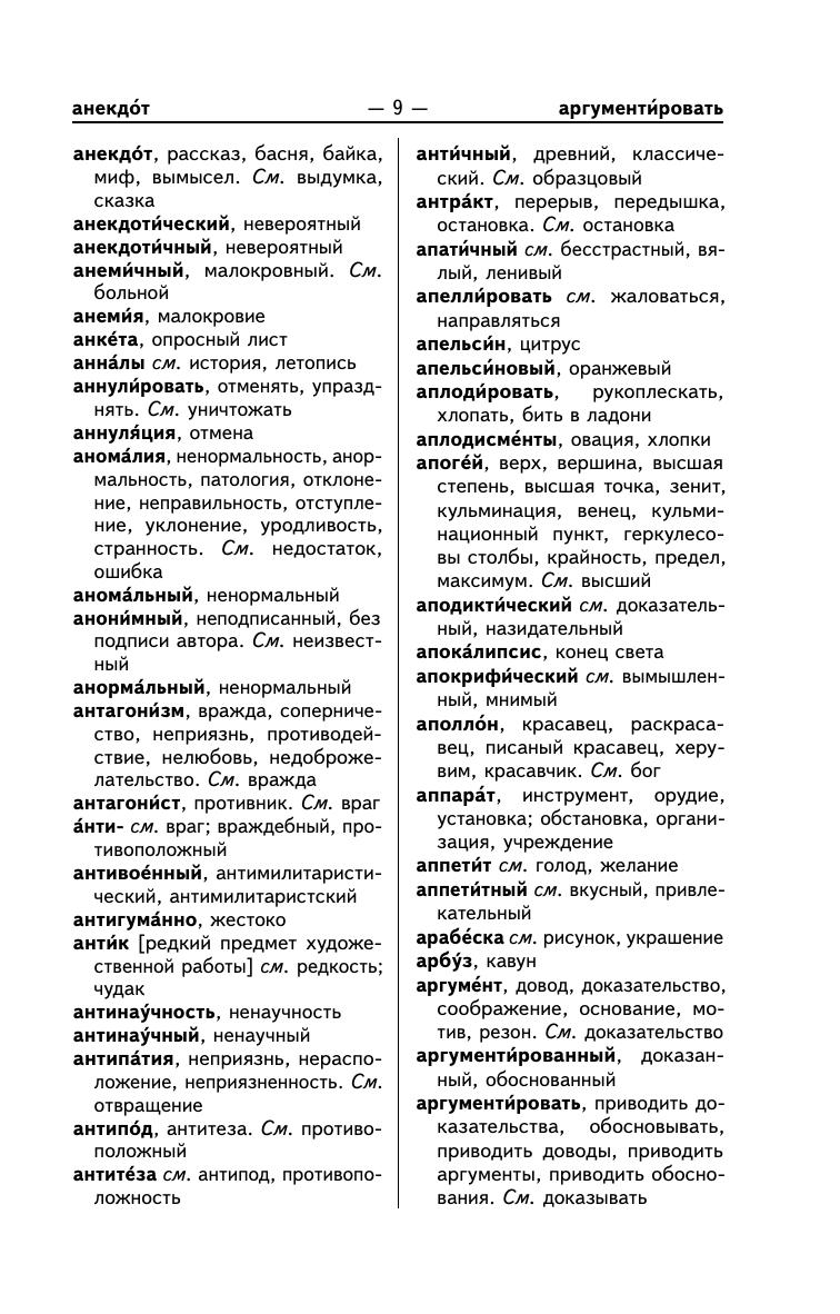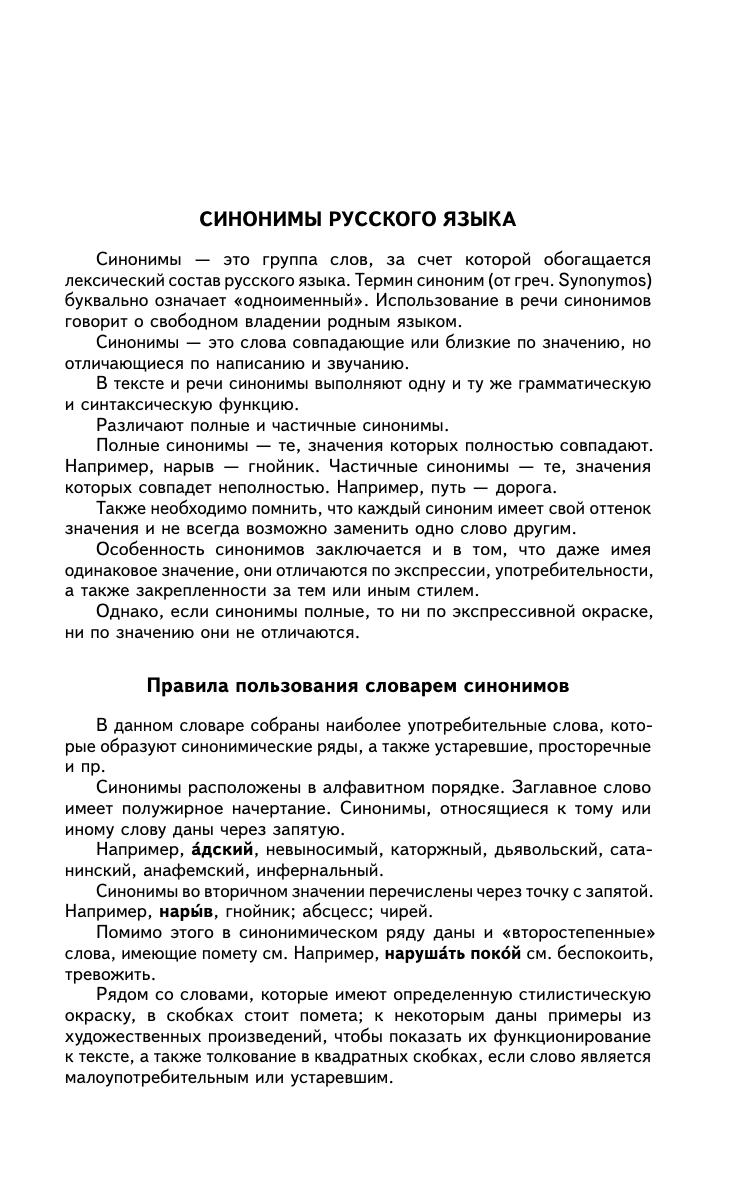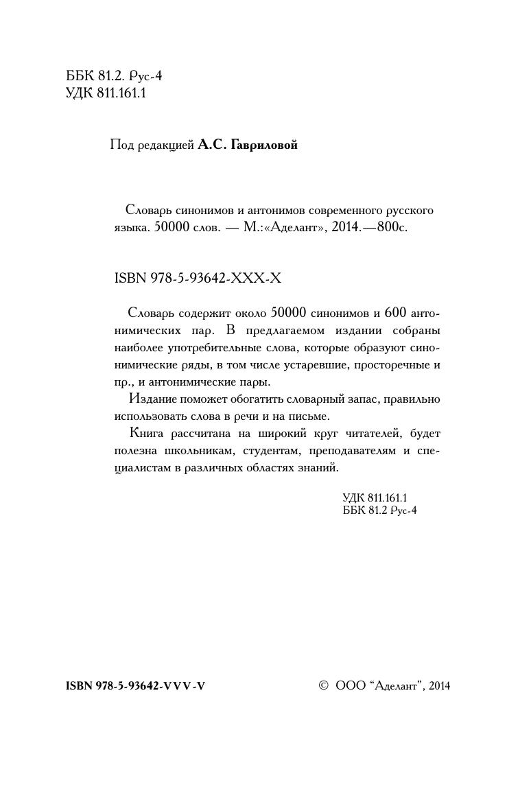 Словарь содержит около 50000 синонимов и 600 антонимических пар. В предлагаемом издании собраны наиболее употребительные слова, которые образуют синонимические ряды, в том числе устаревшие, просторечные и пр., и антонимические пары.