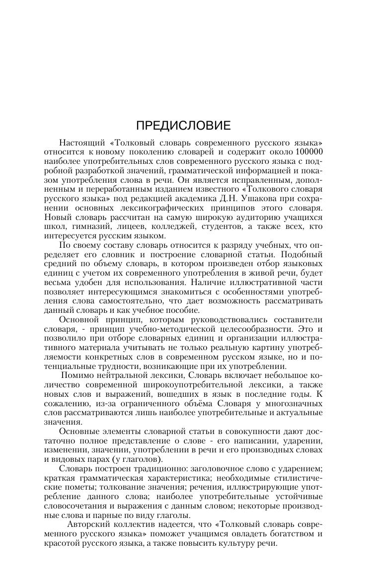 Настоящий «Толковый словарь современного русского языка» относится к новому поколению словарей и содержит около 100000 наиболее употребительных слов современного русского языка с подробной разработкой значений, грамматической информацией и показом употребления слова в речи.