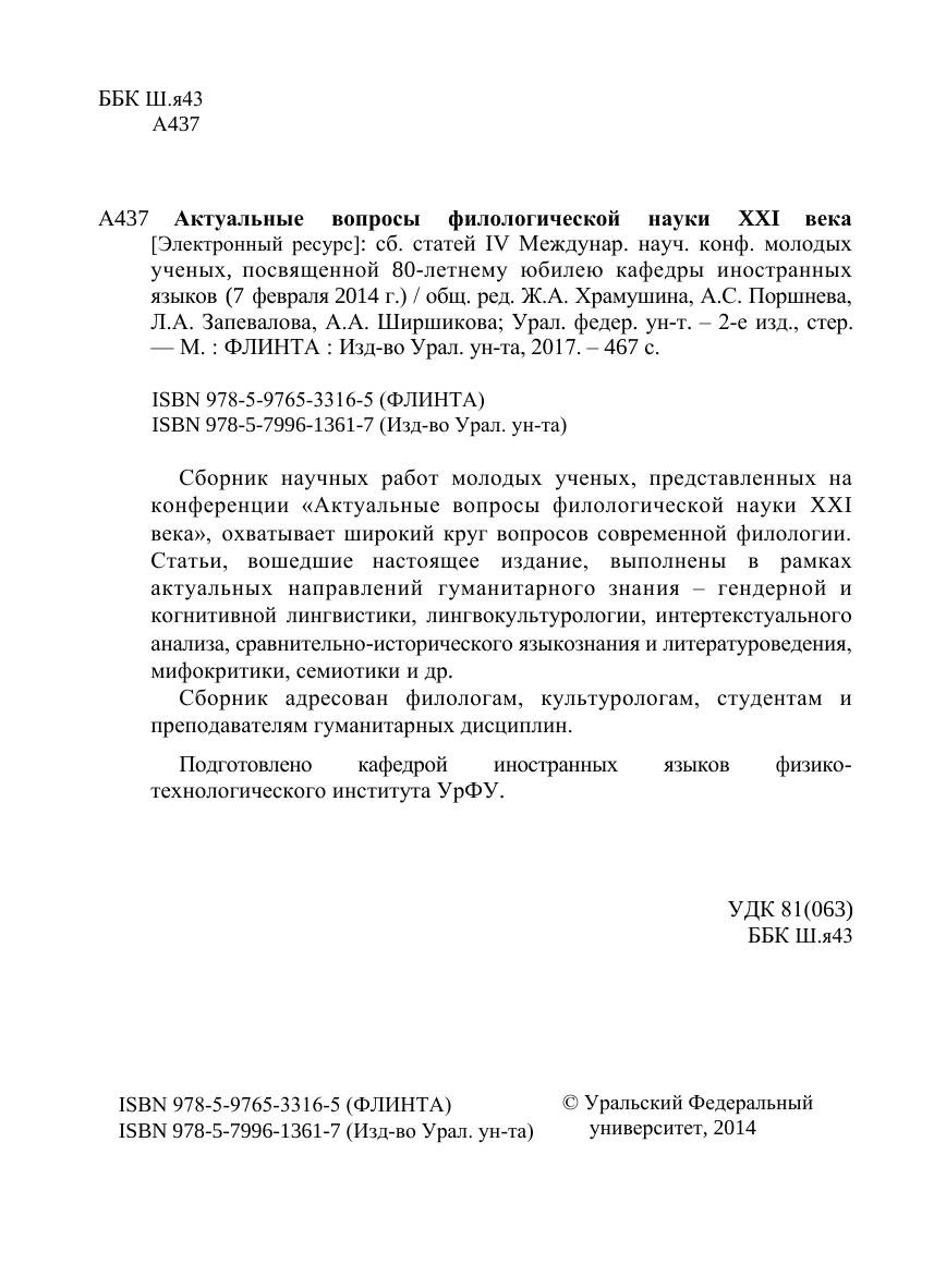 Сборник научных работ молодых ученых, представленных на конференции «Актуальные вопросы филологической науки XXI века», охватывает широкий круг вопросов современной филологии. Статьи, вошедшие настоящее издание, выполнены в рамках актуальных направлений гуманитарного знания – гендерной и когнитивной лингвистики, лингвокультурологии, интертекстуального анализа, сравнительно-исторического языкознания и литературоведения, мифокритики, семиотики и др. Сборник адресован филологам, культурологам, студентам и преподавателям гуманитарных дисциплин. Подготовлено кафедрой иностранных языков физико- технологического института УрФУ.