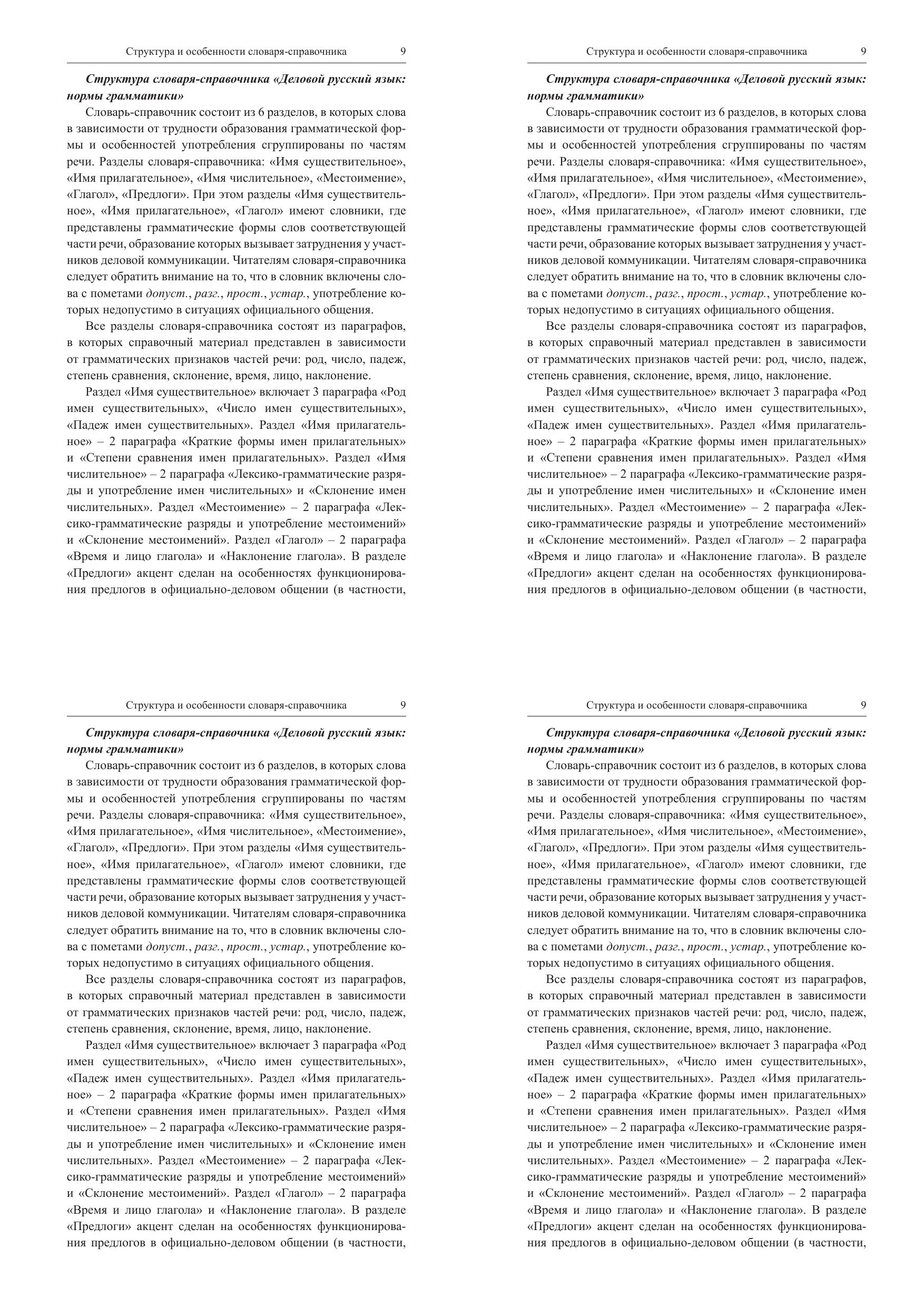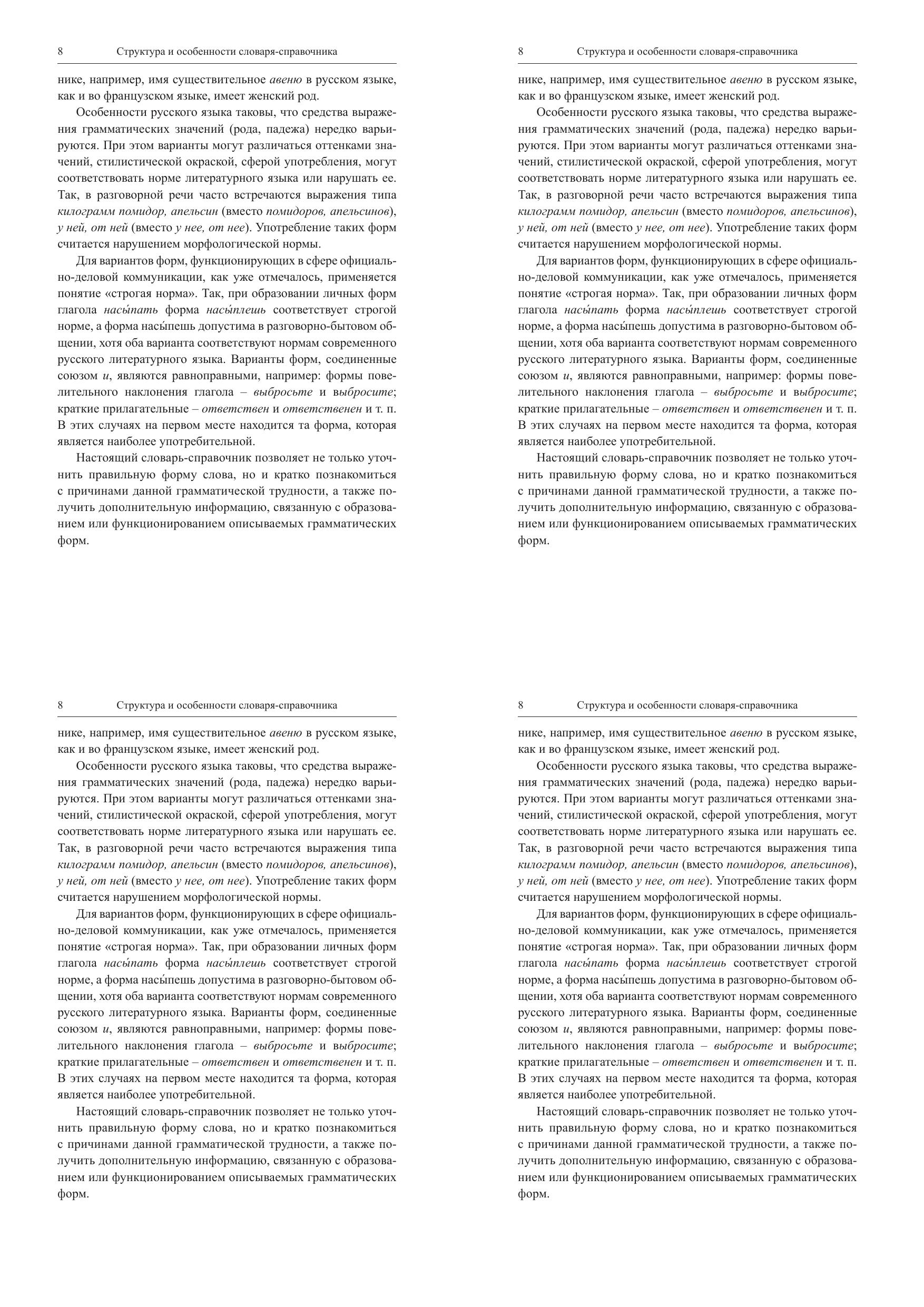 Словарь-справочник адресован прежде всего тем, чьи профессиональные интересы так или иначе связаны с русским языком как государственным (служащим органов государственной власти РФ, РТ, местного самоуправления и т.д.), а также всем желающим повысить культуру русской речи. В зависимости от трудности образования грамматической формы и особенностей употребления слова в нем сгруппированы по частям речи и включены в разделы «Имя существительное», «Имя прилагательное», «Имя числительное», «Местоимение», «Глагол», «Предлоги».