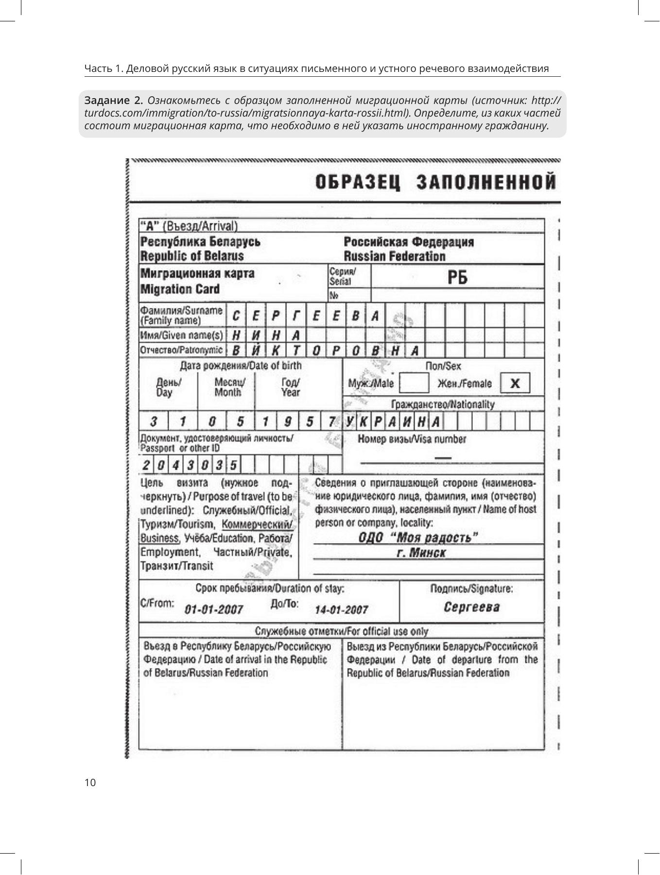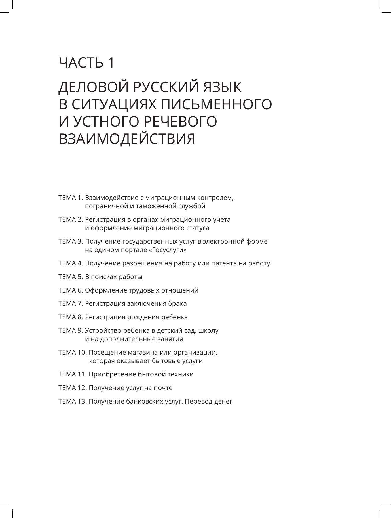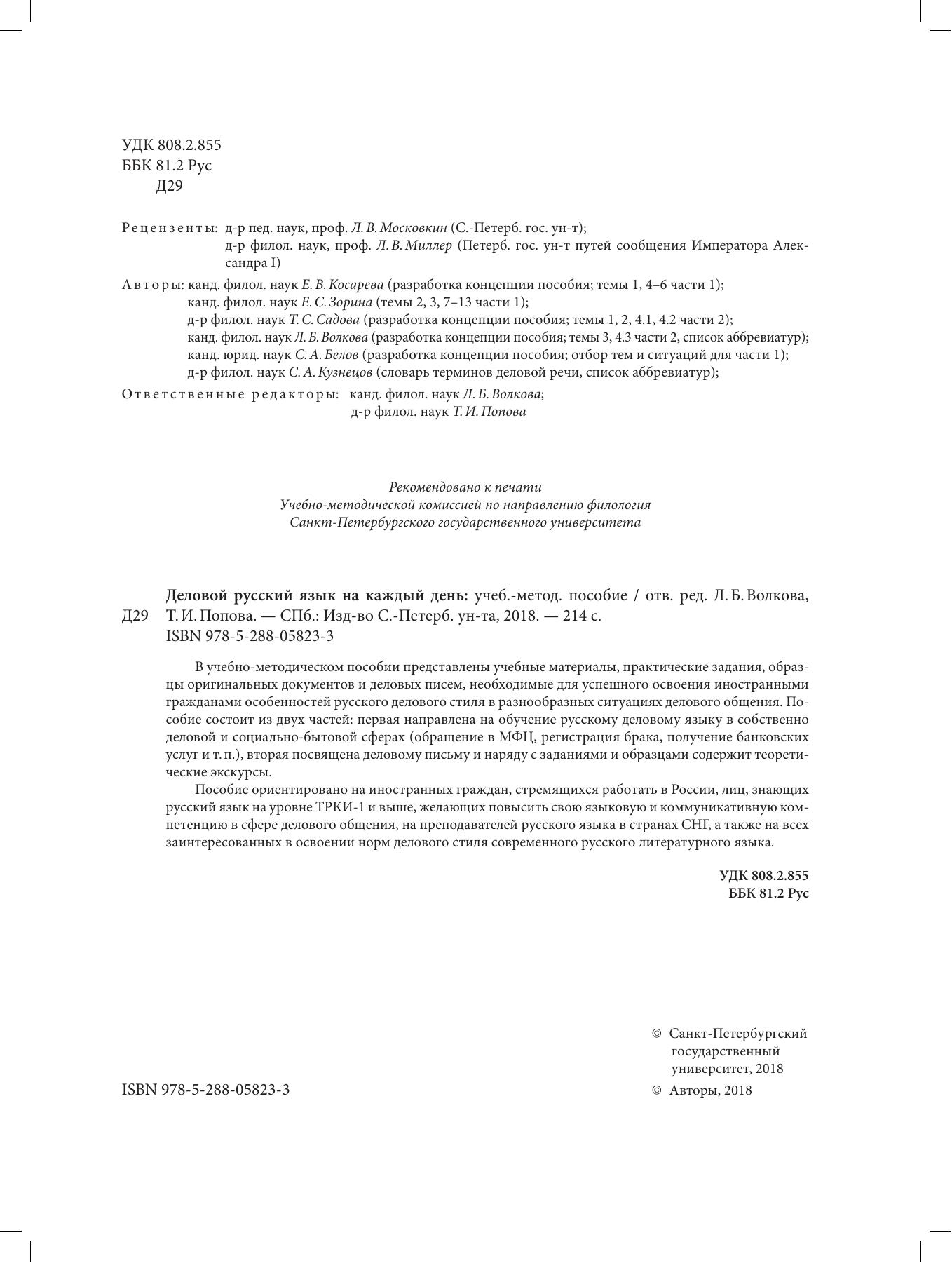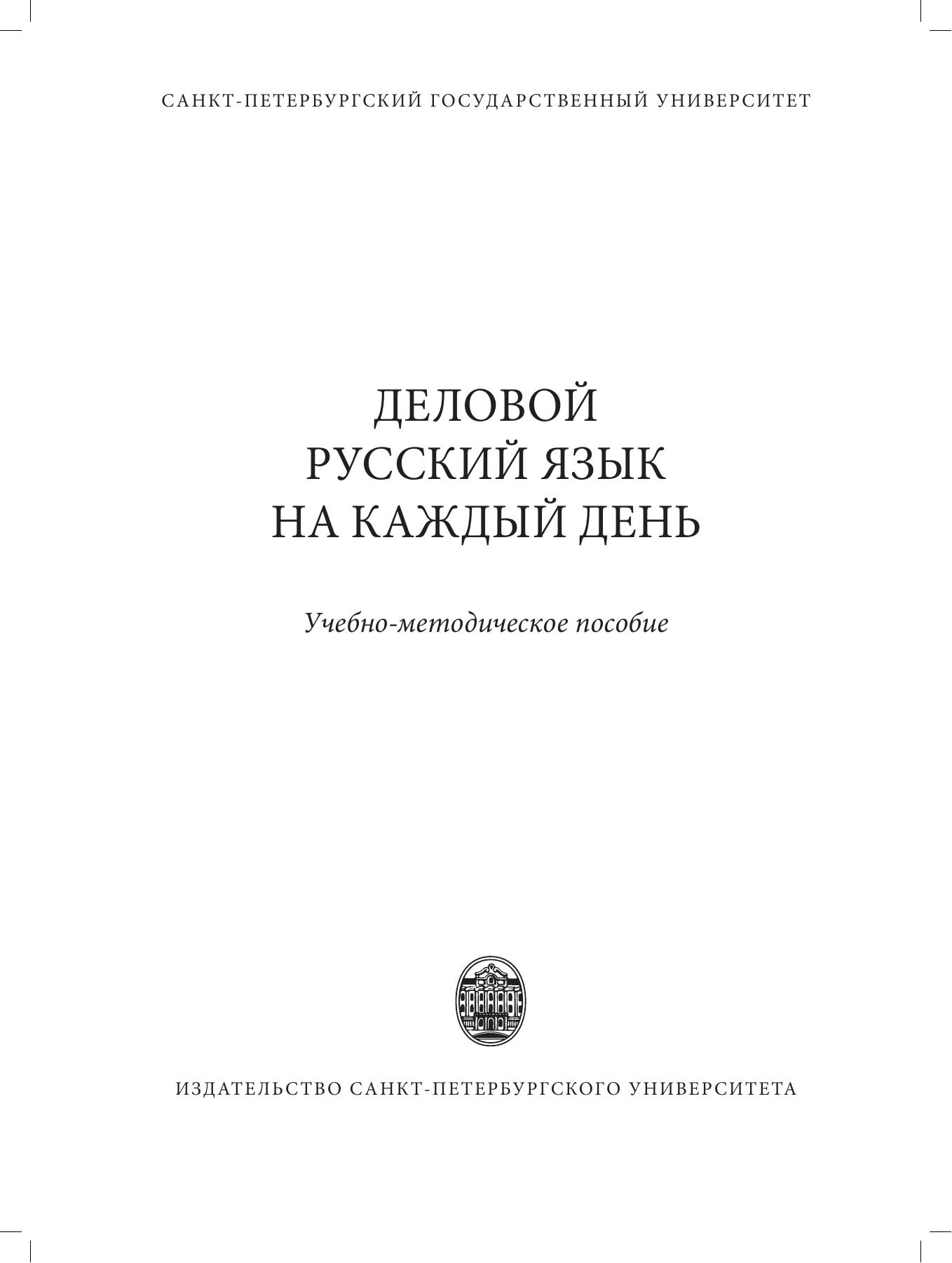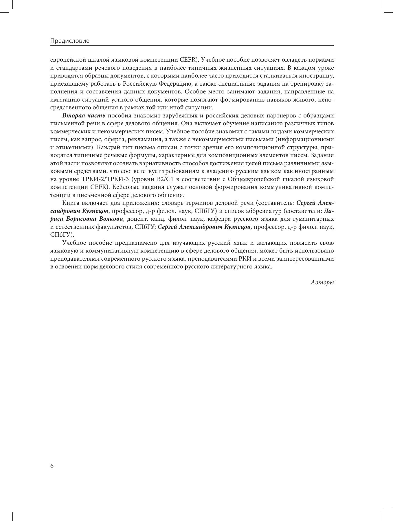 В учебно-методическом пособии представлены учебные материалы, практические задания, образцы оригинальных документов и деловых писем, необходимые для успешного освоения иностранными гражданами особенностей русского делового стиля в разнообразных ситуациях делового общения. Пособие состоит из двух частей: первая направлена на обучение русскому деловому языку в собственно деловой и социально-бытовой сферах (обращение в МФЦ, регистрация брака, получение банковских услуг и т. п.), вторая посвящена деловому письму и наряду с заданиями и образцами содержит теоретические экскурсы. Пособие ориентировано на иностранных граждан, стремящихся работать в России, лиц, знающих русский язык на уровне ТРКИ-1 и выше, желающих повысить свою языковую и коммуникативную компетенцию в сфере делового общения, на преподавателей русского языка в странах СНГ, а также на всех заинтересованных в освоении норм делового стиля современного русского литературного языка.