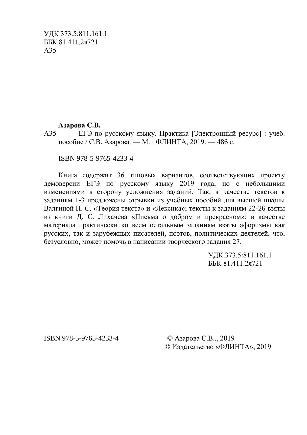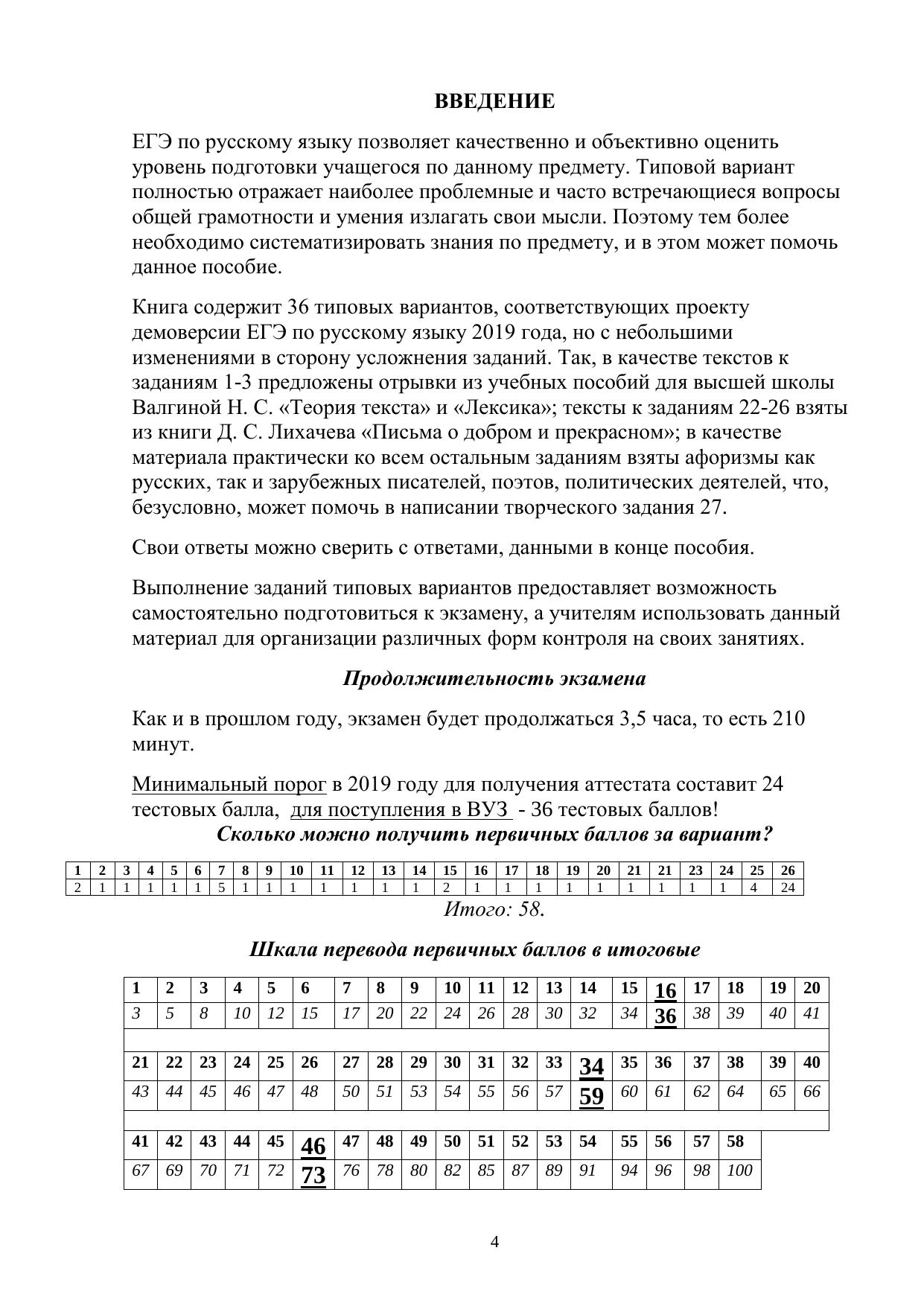 Книга содержит 36 типовых вариантов, соответствующих проекту демоверсии ЕГЭ по русскому языку 2019 года, но с небольшими изменениями в сторону усложнения заданий. Так, в качестве текстов к заданиям 1-3 предложены отрывки из учебных пособий для высшей школы Валгиной Н. С. «Теория текста» и «Лексика»; тексты к заданиям 22-26 взяты из книги Д. С. Лихачева «Письма о добром и прекрасном»; в качестве материала практически ко всем остальным заданиям взяты афоризмы как русских, так и зарубежных писателей, поэтов, политических деятелей, что, безусловно, может помочь в написании творческого задания 27.