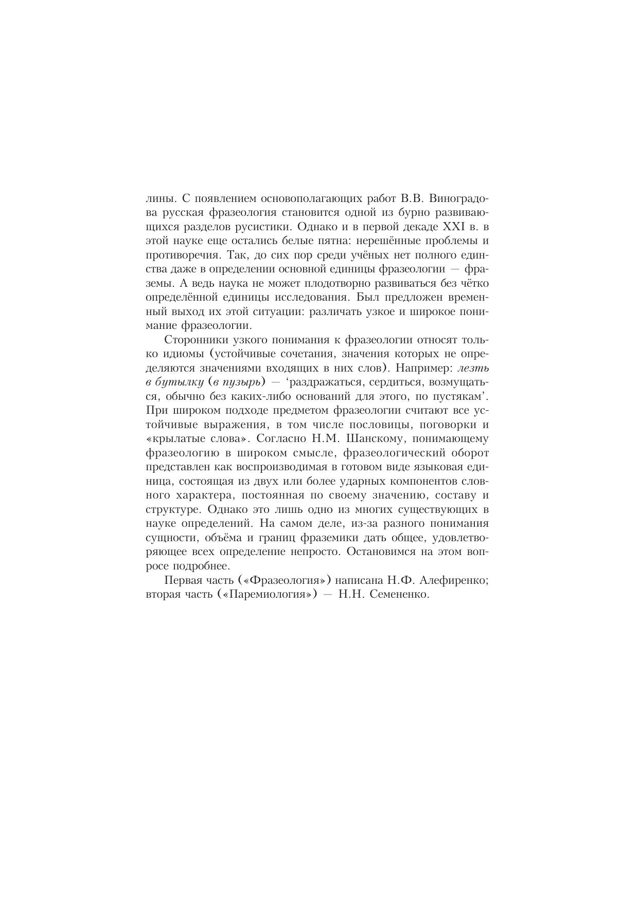 В пособии в соответствии с действующим образовательным стандартом рассматриваются спорные вопросы русской фразеологии и паремиологии. Впервые в вузовском учебном пособии проблемы возникновения и функционирования устойчивых словосочетаний и выражений рассматриваются не обособленно, а в аспекте фраземообразующего взаимодействия единиц разных языковых уровней с опорой на знания студентов, полученные в курсе «Введение в языкознание». Особое внимание обращается на взаимодействие базовых категорий фразеологии и лексикологии, фразеологии и морфологии, фразеологии и синтаксиса. Доступно раскрываются закономерности образования и функционирования русских паремий (пословиц, поговорок и т.п.). Однако вспомним Эйнштейна: теория должна быть настолько проста, насколько это возможно. Правда, у Эйнштейна есть и продолжение фразы: но не проще.