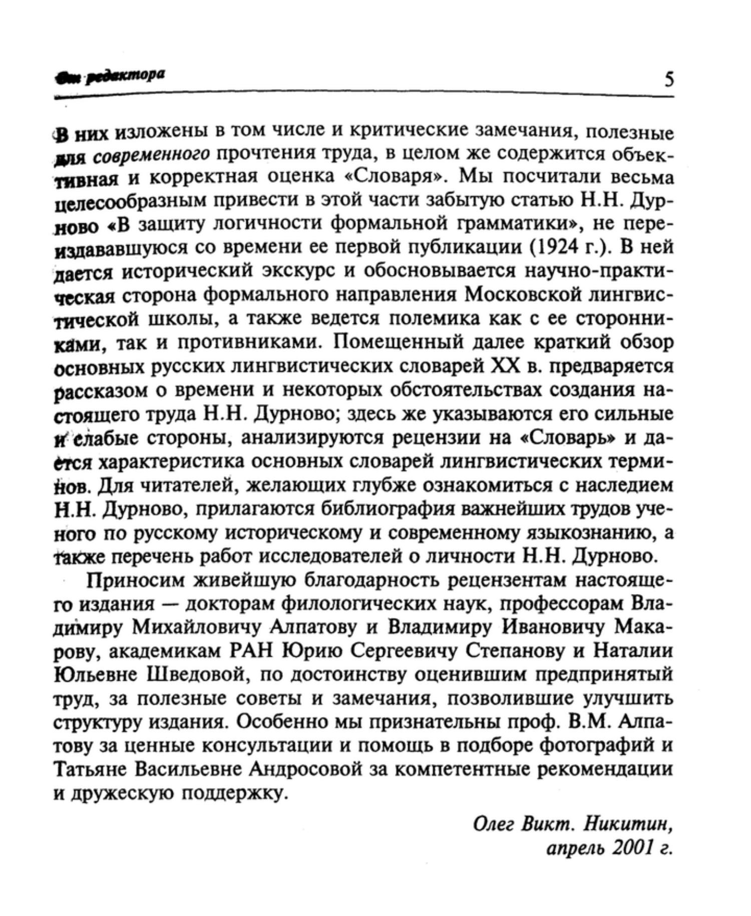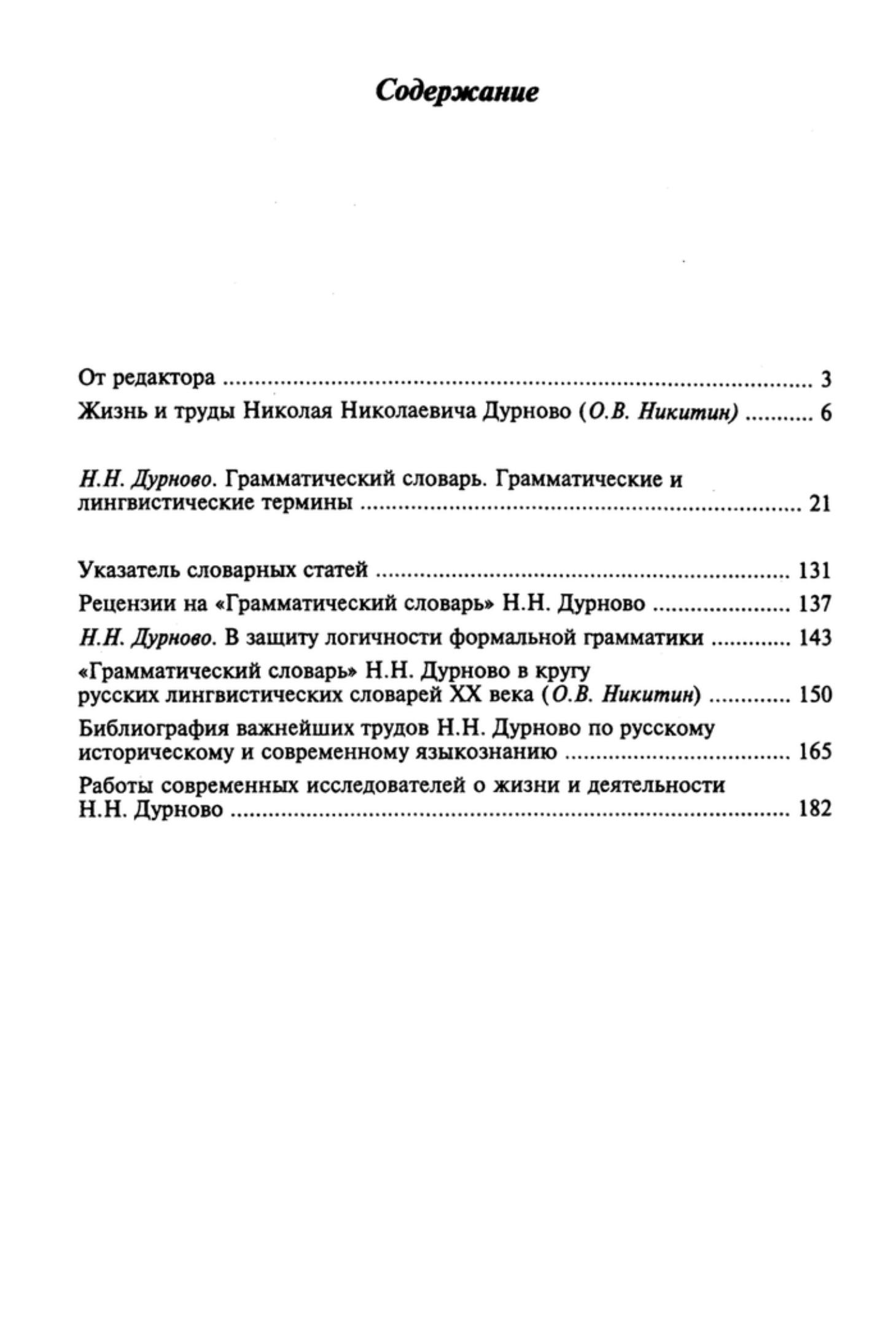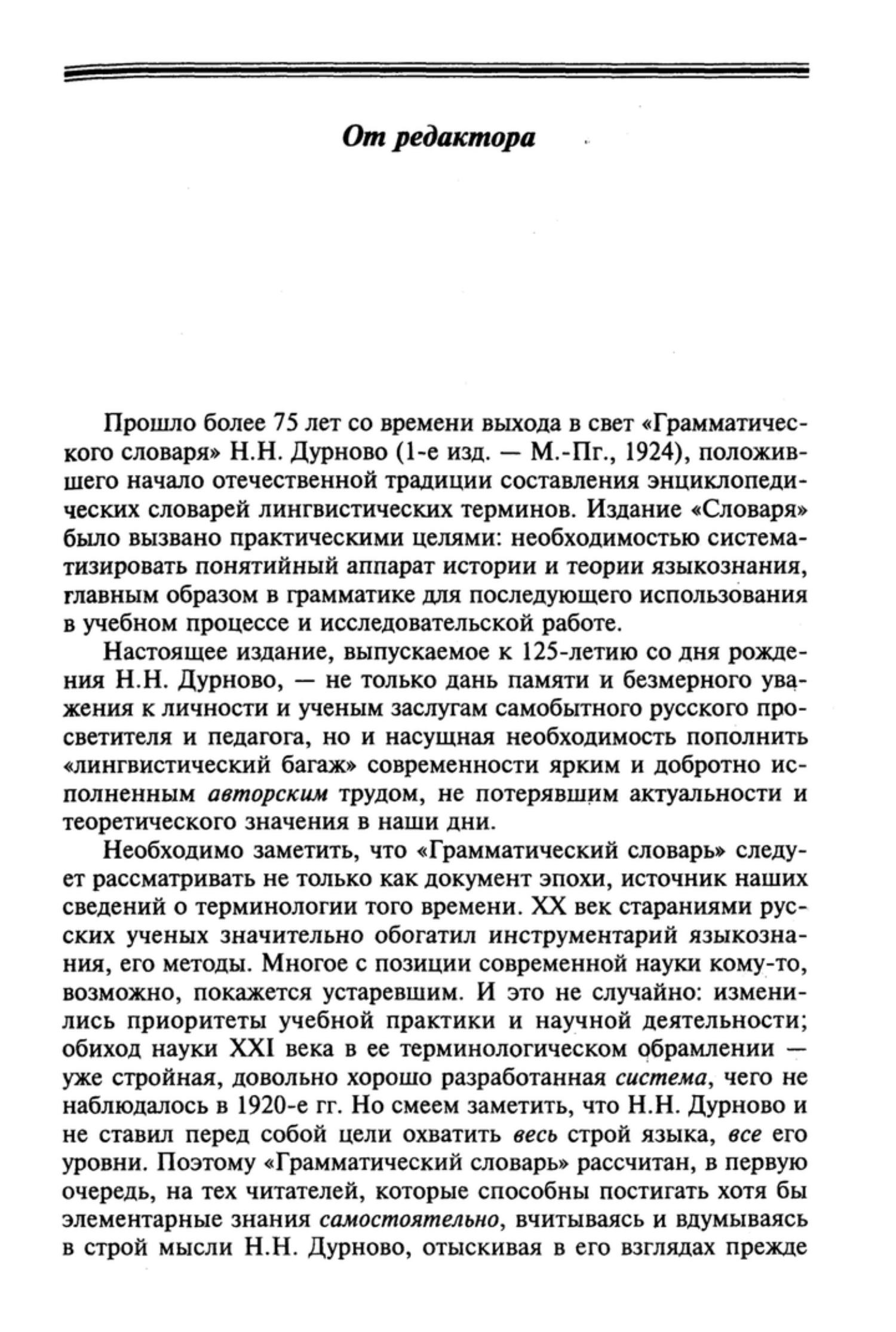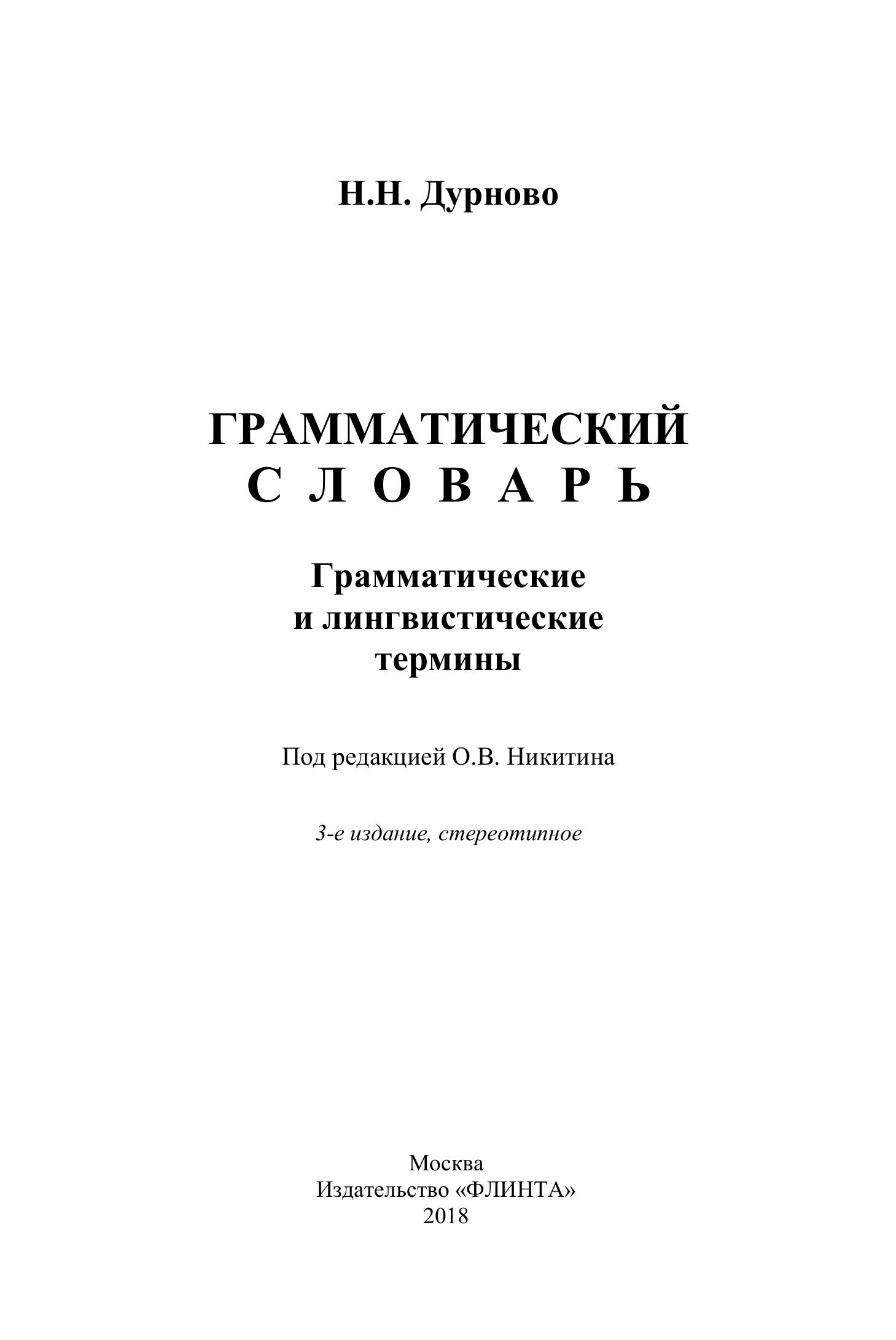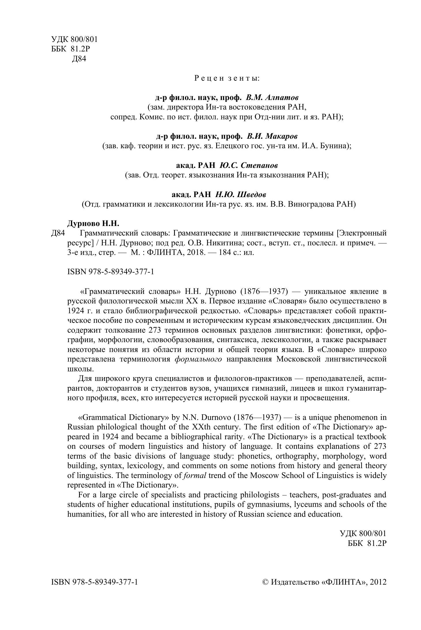 «Grammatical Dictionary» by N.N. Durnovo (1876—1937) — is a unique phenomenon in Russian philological thought of the XXth century. The first edition of «The Dictionary» appeared in 1924 and became a bibliographical rarity. «The Dictionary» is a practical textbook on courses of modern linguistics and history of language. It contains explanations of 273 terms of the basic divisions of language study: phonetics, orthography, morphology, word building, syntax, lexicology, and comments on some notions from history and general theory of linguistics. The terminology of formal trend of the Moscow School of Linguistics is widely represented in «The Dictionary».