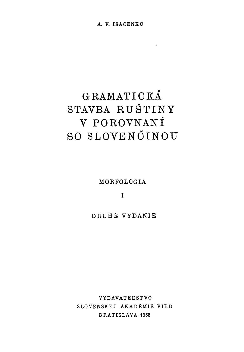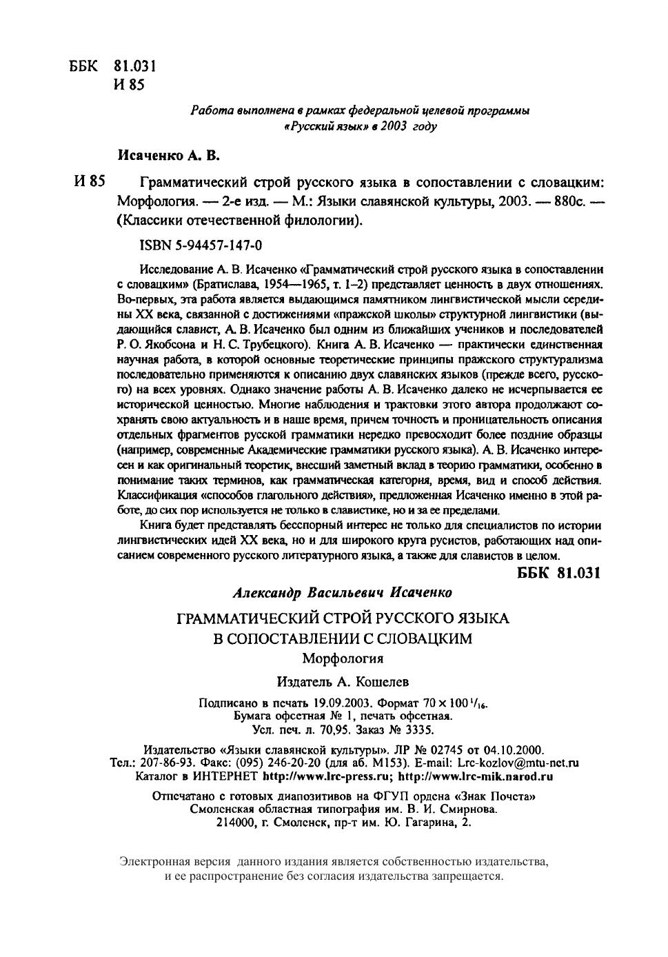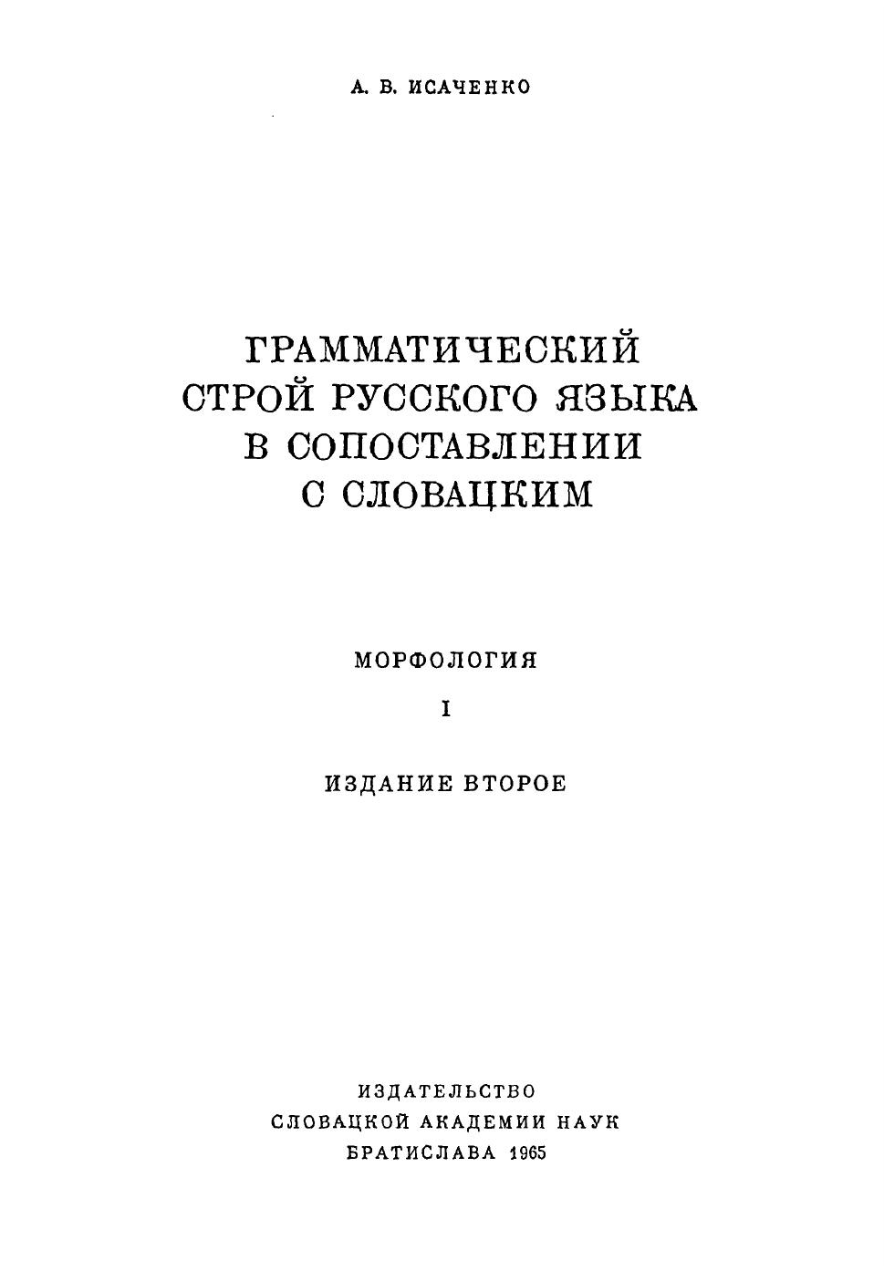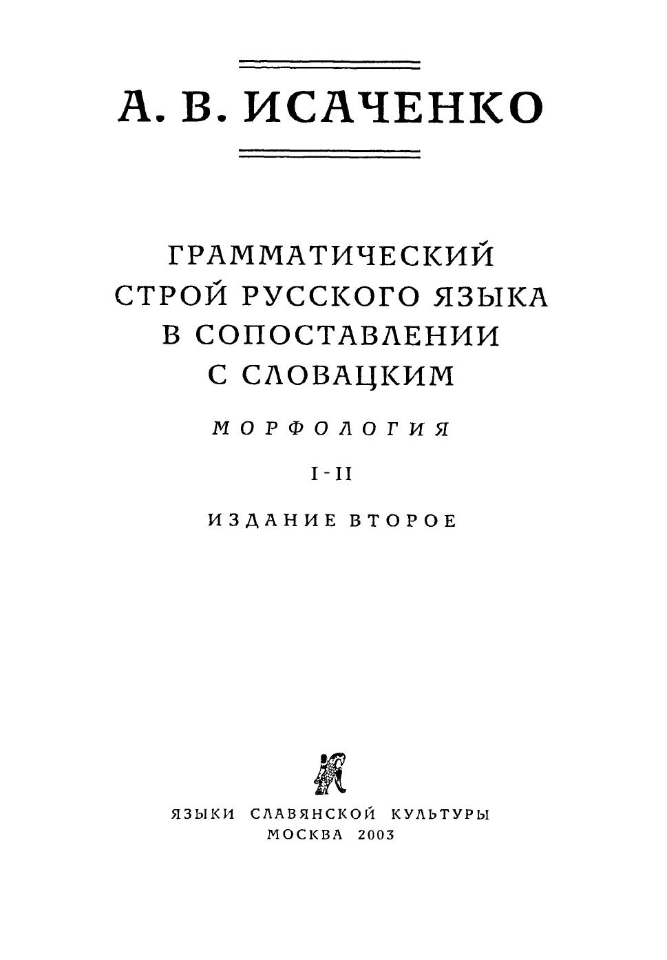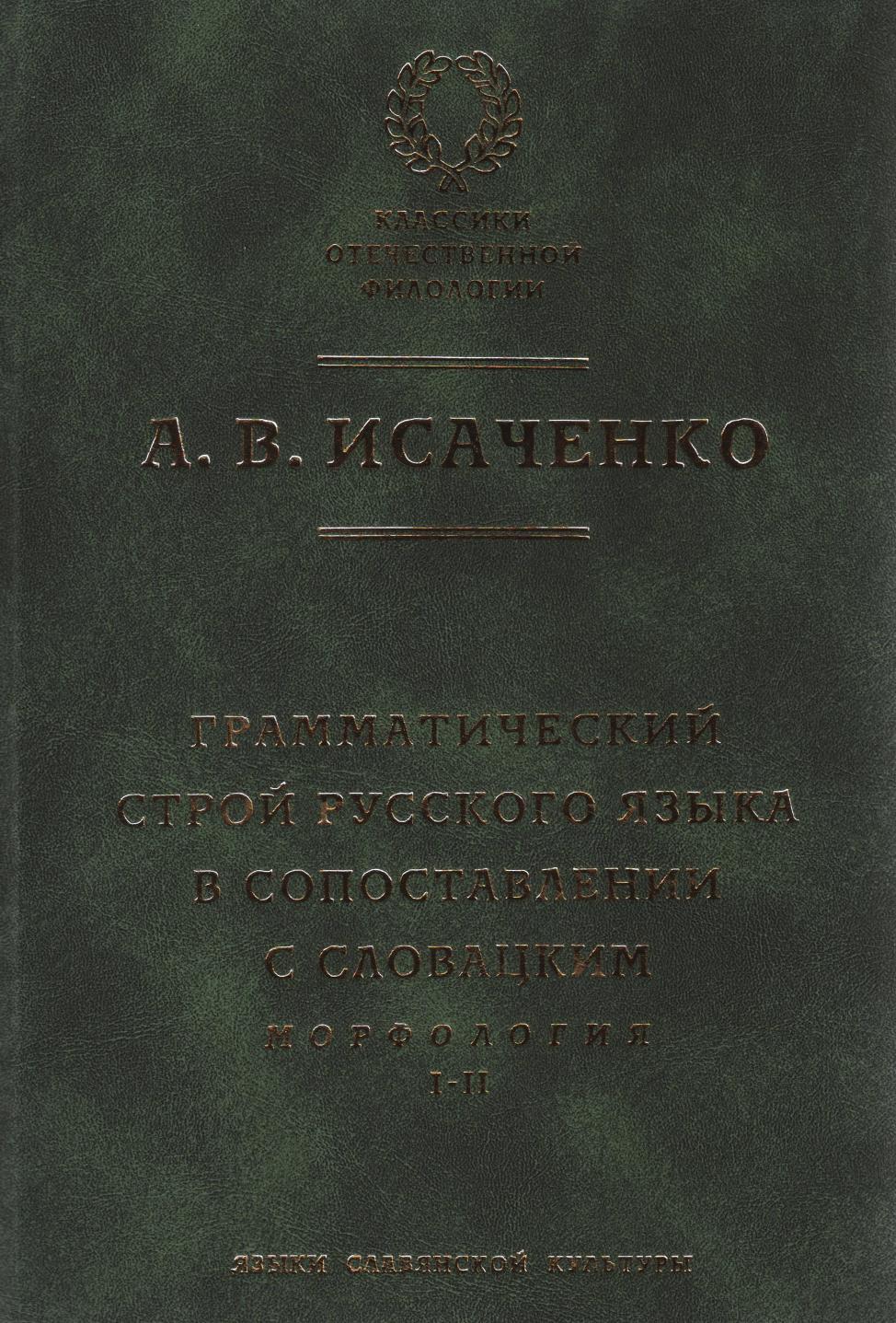 Исследование А.В.Исаченко "Грамматический строй русского языка в сопоставлении с словацким" (Братислава, 1954-1965, т. 1-2) представляет ценность в двух отношениях. Во-первых, эта работа является выдающимся памятником лингвистической мысли середины XX века, связанной с достижениями "пражской школы" структурной лингвистики (выдающийся славист, А.В.Исаченко был одним из ближайших учеников и последователей Р.О.Якобсона и Н.С.Трубецкого). Книга А.В.Исаченко - практически единственная научная работа, в которой основные теоретические принципы пражского структурализма последовательно применяются к описанию двух славянских языков (прежде всего, русского) на всех уровнях. Однако значение работы А.В.Исаченко далеко не исчерпывается ее исторической ценностью. Многие наблюдения и трактовки этого автора продолжают сохранять свою актуальность и в наше время, причем точность и проницательность описания отдельных фрагментов русской грамматики нередко превосходит более поздние образцы (например, современные Академические грамматики русского языка). А.В.Исаченко интересен и как оригинальный теоретик, внесший заметный вклад в теорию грамматики, особенно в понимание таких терминов, как грамматическая категория, время, вид и способ действия. Классификация "способов глагольного действия", предложенная Исаченко именно в этой работе, до сих пор используется не только в славистике, но и за ее пределами. Книга будет представлять бесспорный интерес не только для специалистов по истории лингвистических идей XX века, но и для широкого круга русистов, работающих над описанием современного русского литературного языка, а также для славистов в целом.