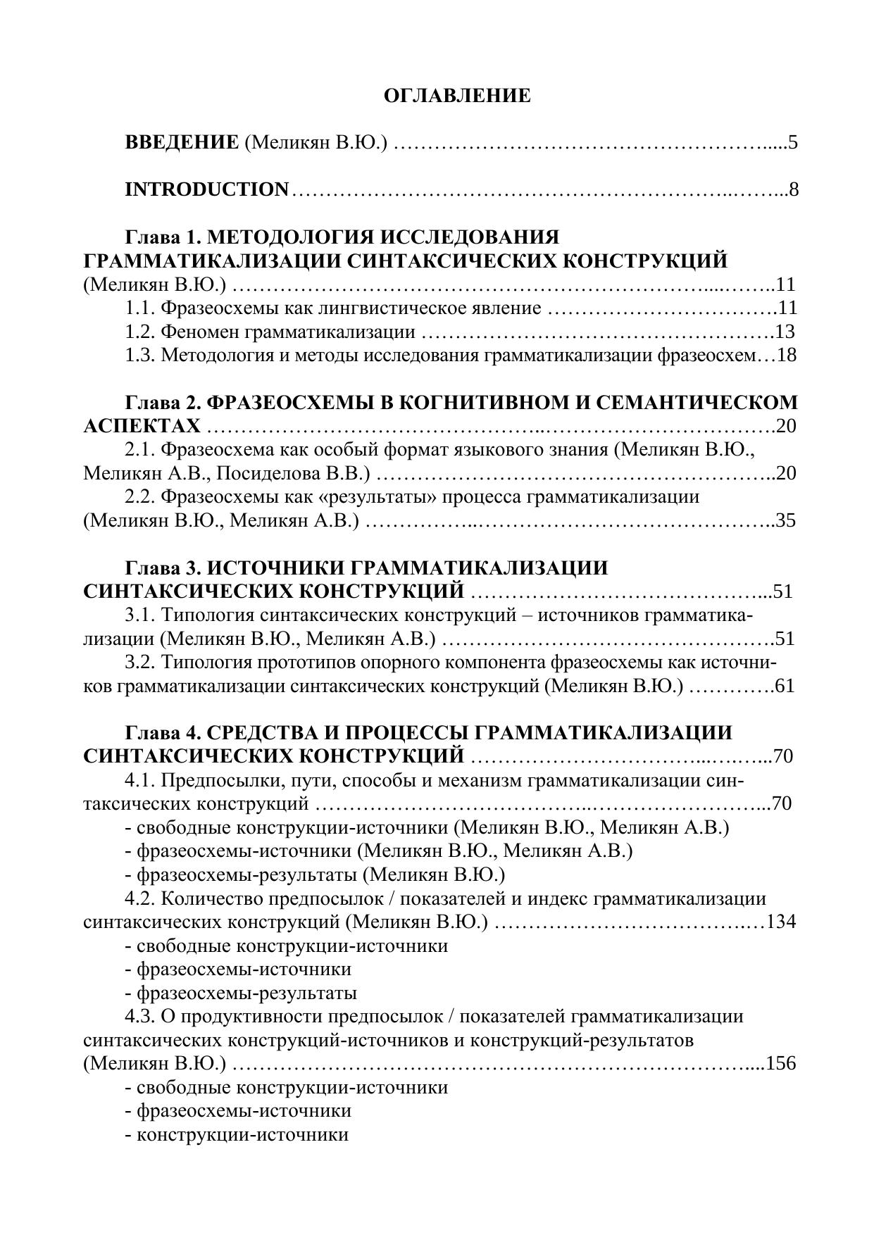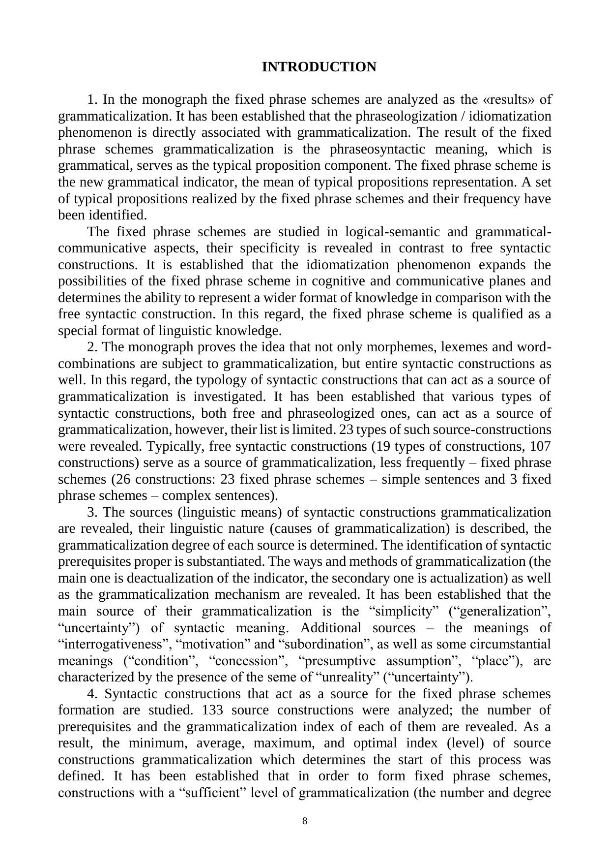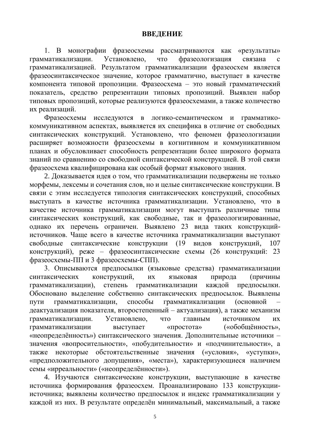 В монографии исследуются различные структурно-семантические типы синтаксических конструкций – свободные и фразеологизированные (фразеосхемы) – на основе совмещения теории грамматикализации и теории фразеологизации. Фразеосхема рассматривается как «результат» процесса грамматикализации, а также как особый формат языкового знания. Изучаются типология синтаксических конструкций – источников грамматикализации. Выявляются и систематизируются предпосылки (источники) / показатели, пути, способы и механизм грамматикализации синтаксических конструкций. Устанавливаются количество предпосылок / показателей и индекс грамматикализации синтаксических конструкций, а также степень их продуктивности.
