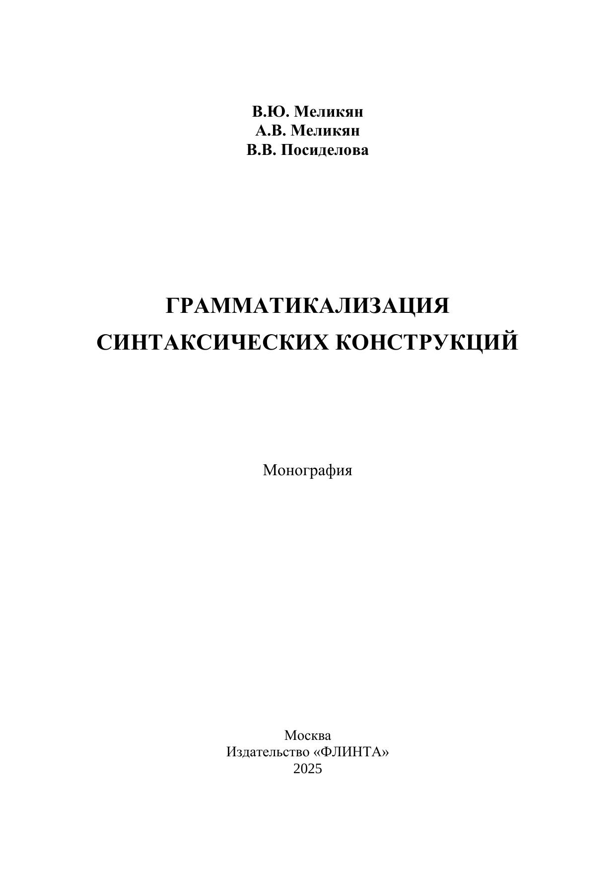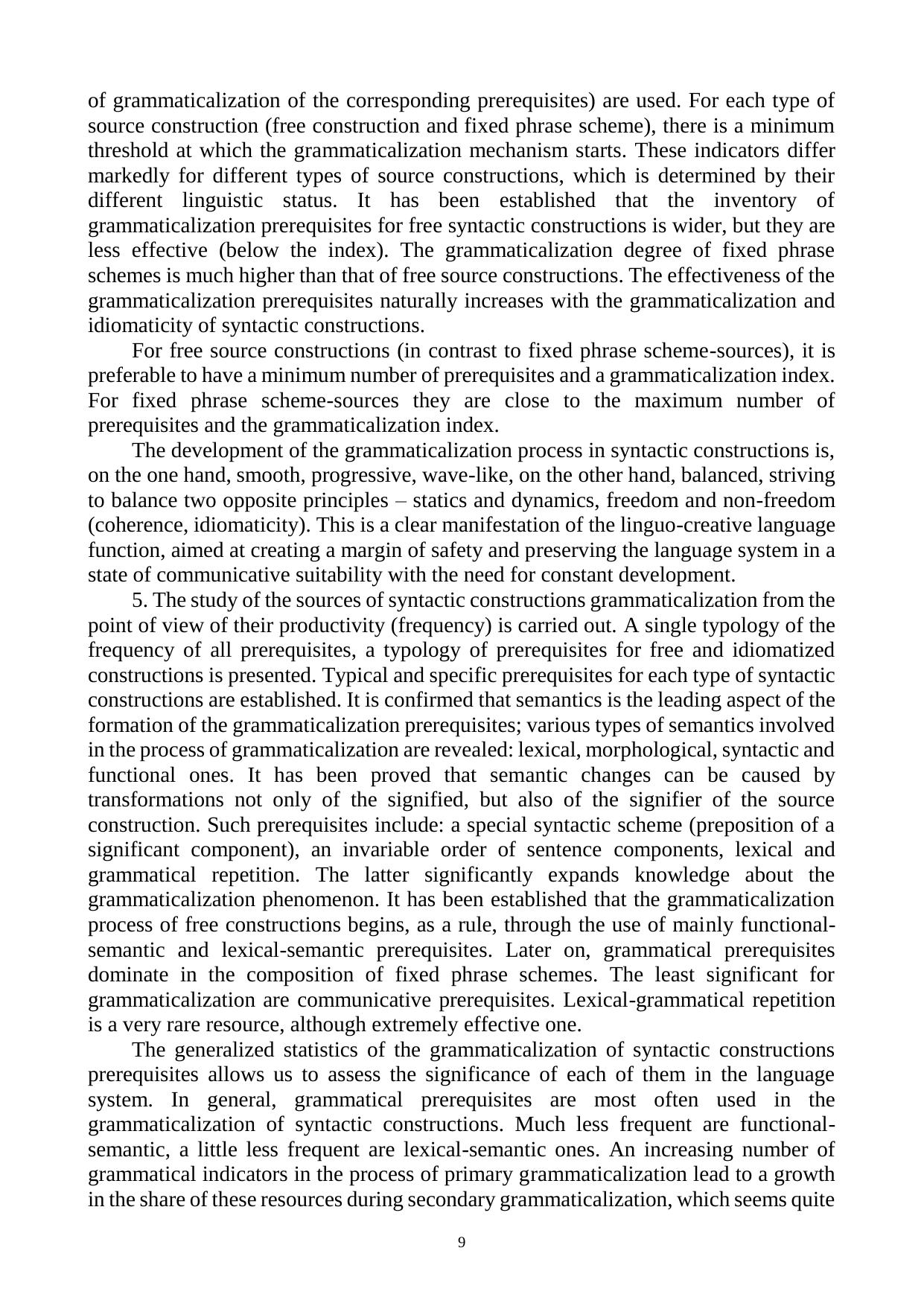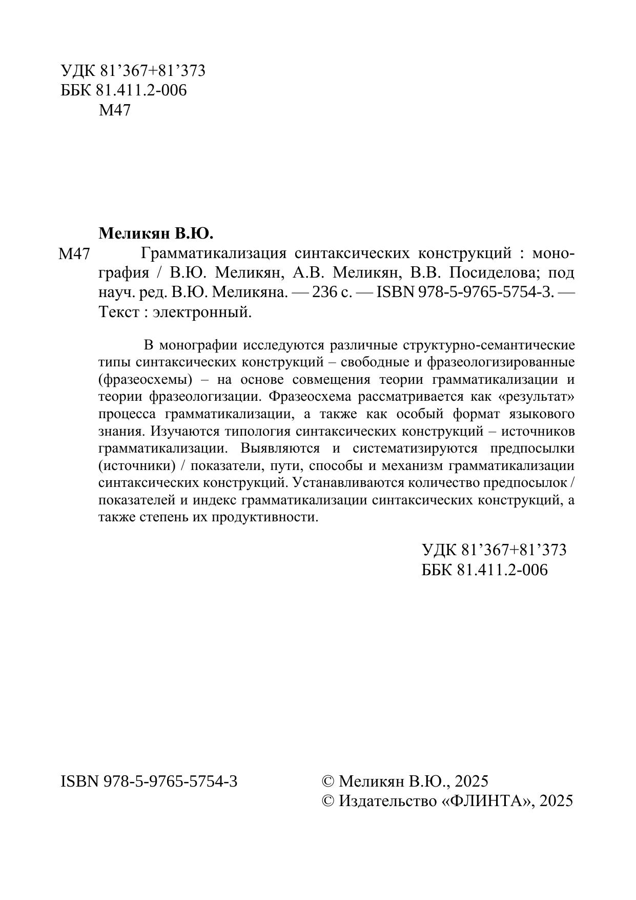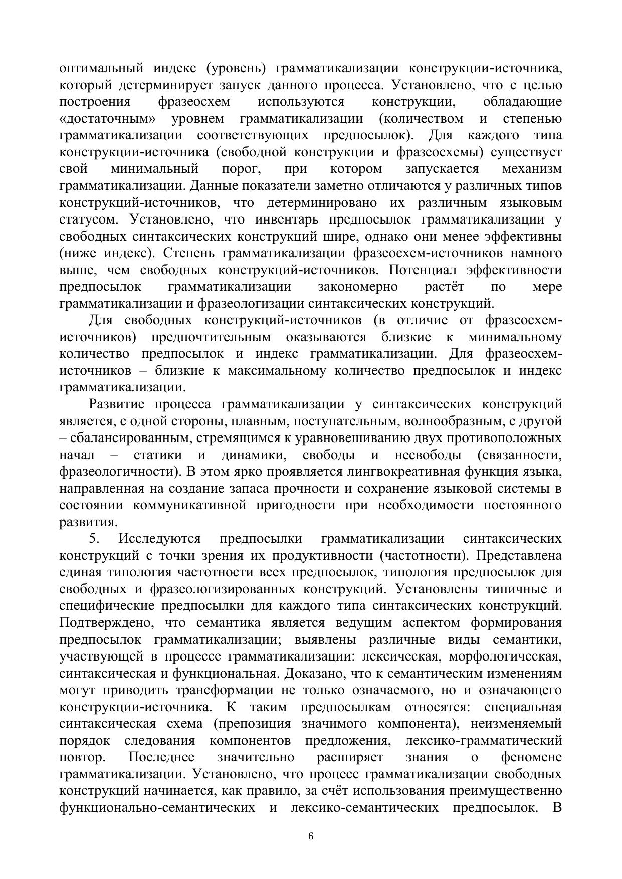 В монографии исследуются различные структурно-семантические типы синтаксических конструкций – свободные и фразеологизированные (фразеосхемы) – на основе совмещения теории грамматикализации и теории фразеологизации. Фразеосхема рассматривается как «результат» процесса грамматикализации, а также как особый формат языкового знания. Изучаются типология синтаксических конструкций – источников грамматикализации. Выявляются и систематизируются предпосылки (источники) / показатели, пути, способы и механизм грамматикализации синтаксических конструкций. Устанавливаются количество предпосылок / показателей и индекс грамматикализации синтаксических конструкций, а также степень их продуктивности.