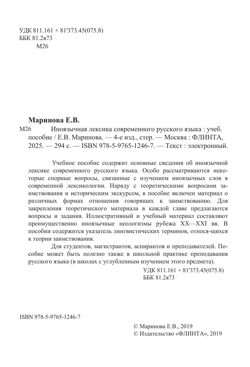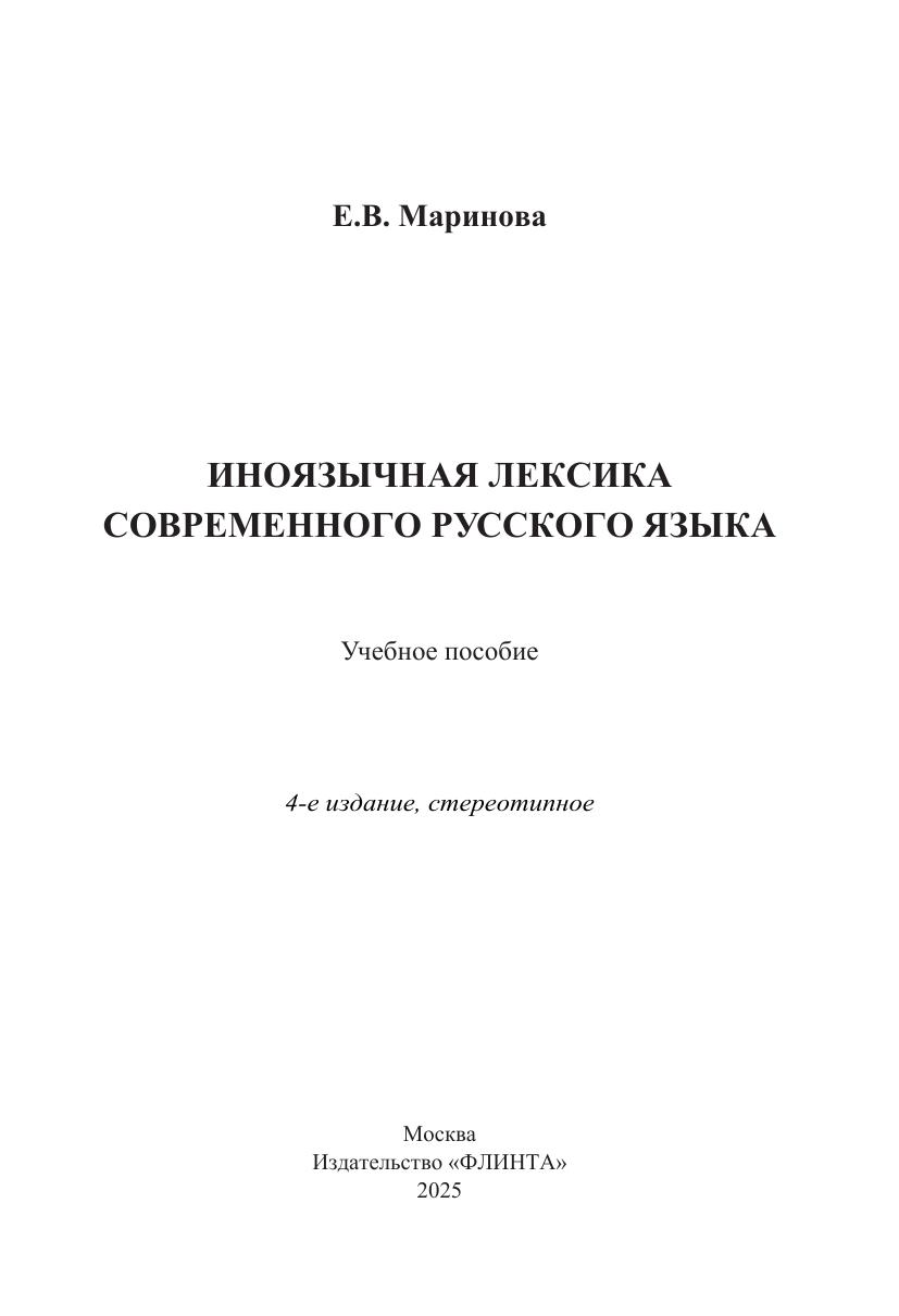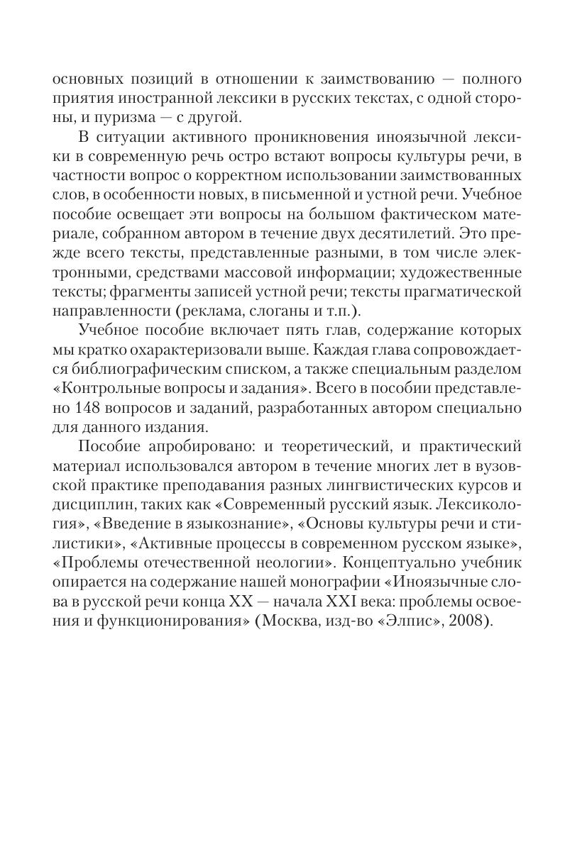 Учебное пособие содержит основные сведения об иноязычной лексике современного русского языка. Особо рассматриваются некоторые спорные вопросы, связанные с изучением иноязычных слов в современной лексикологии. Наряду с теоретическими вопросами заимствования и историческим экскурсом, в пособие включен материал о различных формах отношения говорящих к заимствованию. Для закрепления теоретического материала в каждой главе предлагаются вопросы и задания. Иллюстративный и учебный материал составляют преимущественно иноязычные неологизмы рубежа XX—XXI вв. В пособии содержится указатель лингвистических терминов, относящихся к теории заимствования. Для студентов, магистрантов, аспирантов и преподавателей. Пособие может быть полезно также в школьной практике преподавания русского языка (в школах с углубленным изучением этого предмета).