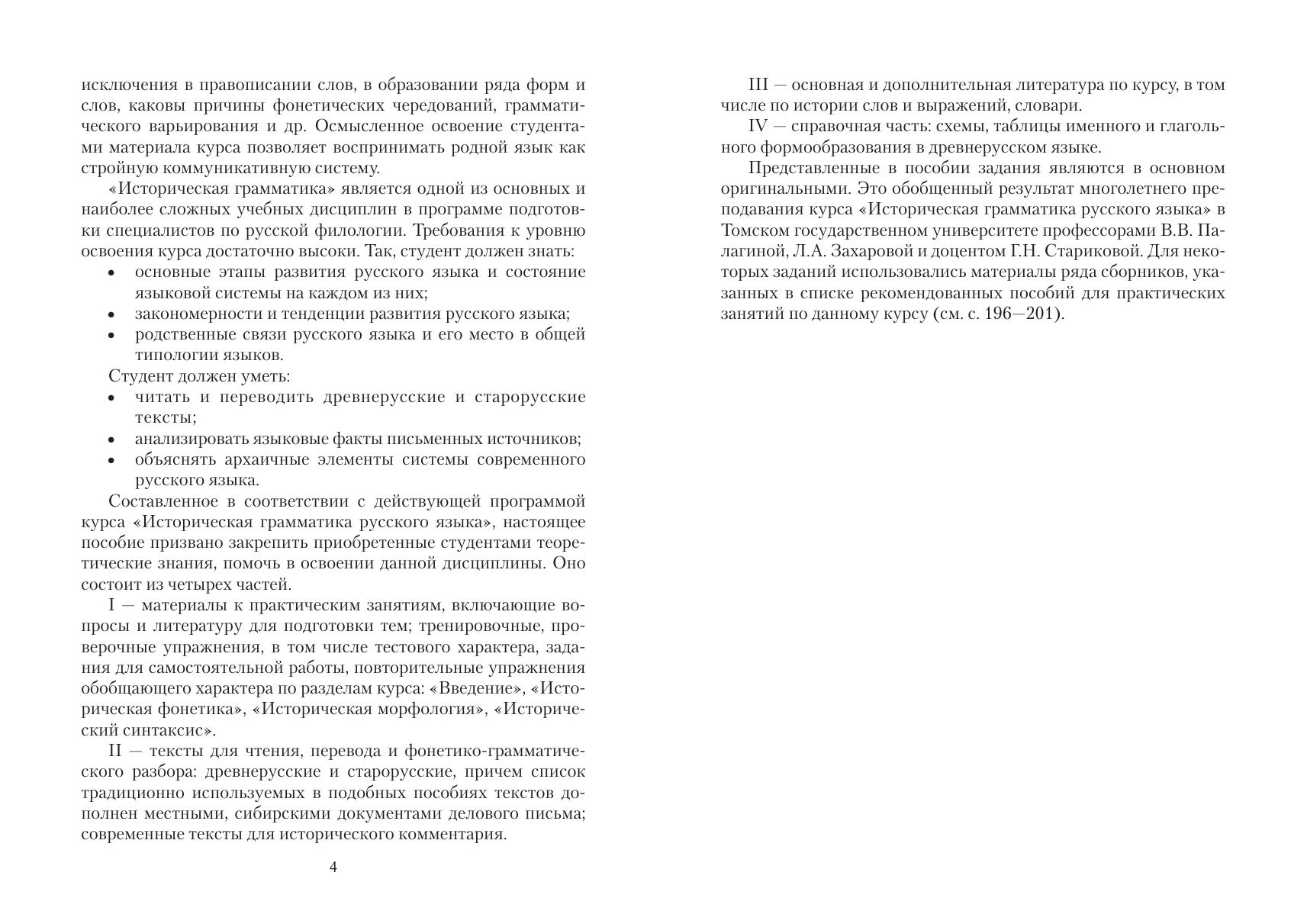 Учебное пособие включает разнообразный материал для практиче- ских занятий: программу дисциплины, упражнения и задания по исто- рии русского языка, задания для самостоятельной работы, контрольные работы, схемы и образцы комплексного исторического анализа текста, тесты, справочные материалы и др. Упражнения разбиты по темам в со- ответствии с программой, каждая тема сопровождается заданиями на анализ древнерусских или старорусских текстов. В разделе «Задания для самостоятельной работы» в учебный оборот введено большое ко- личество адаптированных (переданных гражданским шрифтом и раз- деленных на предложения) текстов памятников, относящихся к разным эпохам и жанрам, и вопросы для их комплексного анализа, охватываю- щего различные языковые уровни – фонетический, лексический, мор- фологический, синтаксический. Особое внимание уделено проблемам, которые обычно не рассматриваются в курсе истории русского языка, но вместе с тем имеют большое значение: этимологии русских слов и фра- зеологизмов, семантической эволюции слов с праславянскими корнями, составу архаичной лексики в русском языке и др.