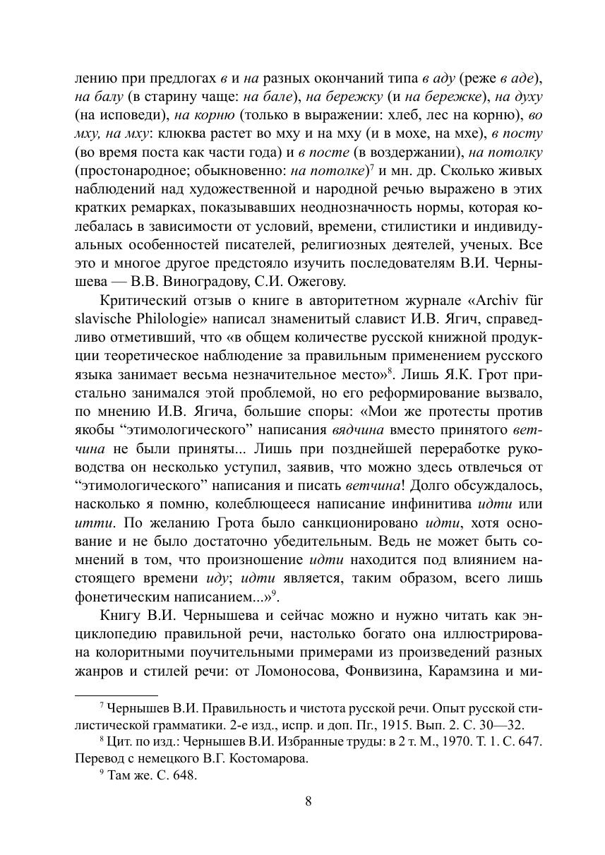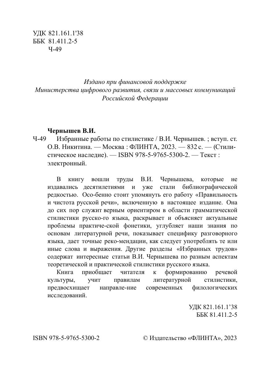 В книгу вошли труды В.И. Чернышева, которые не издавались десятилетиями и уже стали библиографической редкостью. Особенно стоит упомянуть его работу «Правильность и чистота русской речи», включенную в настоящее издание. Она до сих пор служит верным ориентиром в области грамматической стилистики русского языка, раскрывает и объясняет актуальные проблемы практической фонетики, углубляет наши знания по основам литературной речи, показывает специфику разговорного языка, дает точные рекомендации, как следует употреблять те или иные слова и выражения. Другие разделы «Избранных трудов» содержат интересные статьи В.И. Чернышева по разным аспектам теоретической и практической стилистики русского языка. Книга приобщает читателя к формированию речевой культуры, учит правилам литературной стилистики, предвосхищает направление современных филологических исследований.