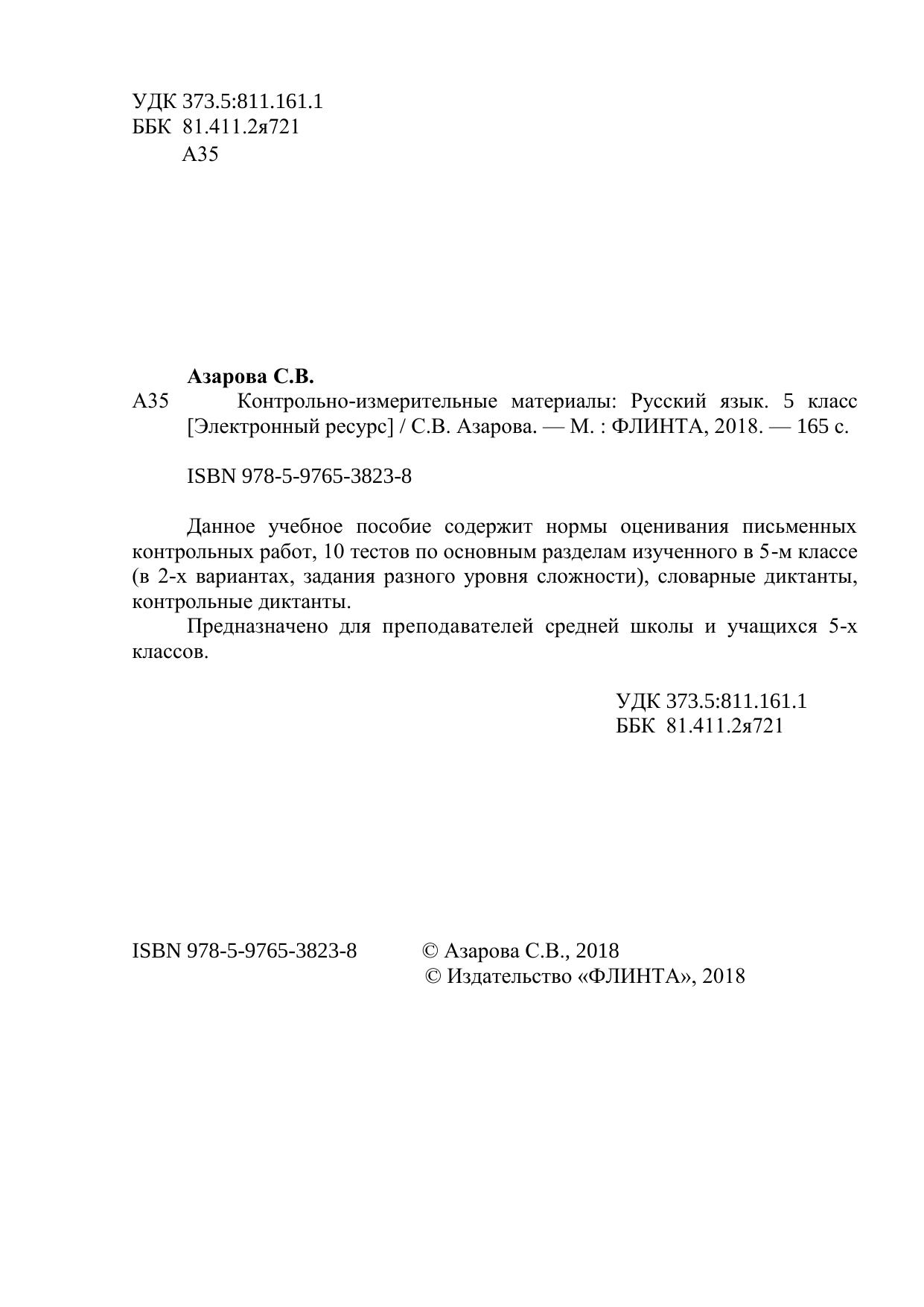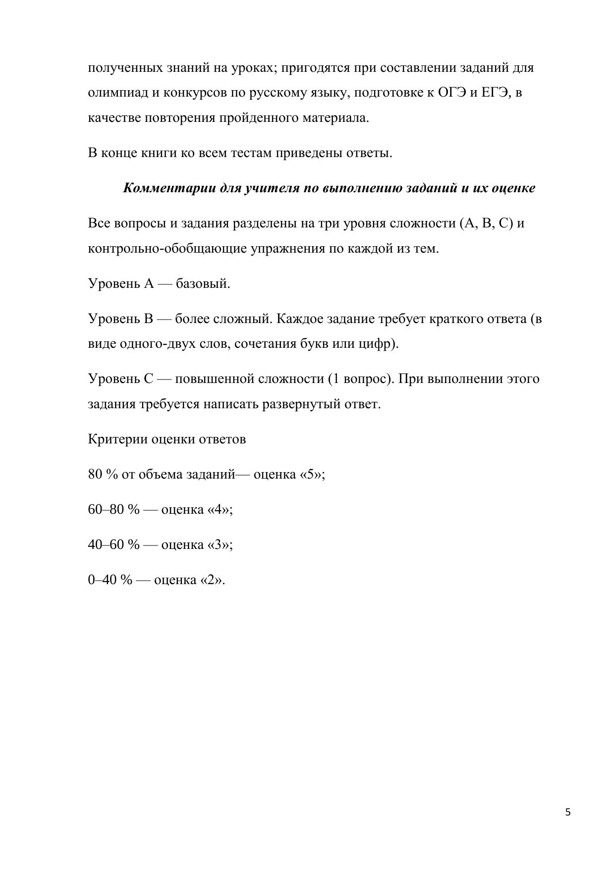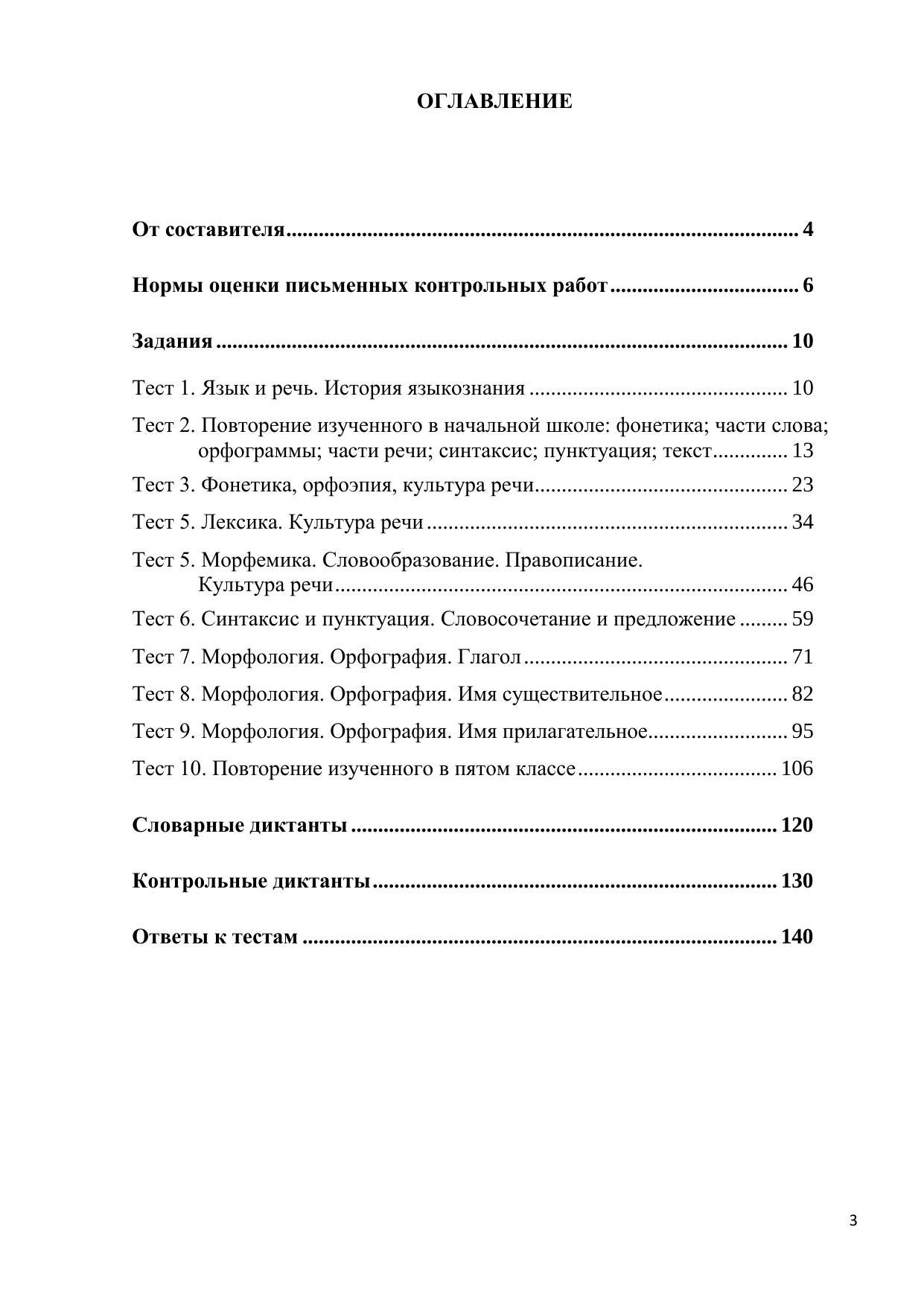 Данное учебное пособие содержит нормы оценивания письменных контрольных работ, 10 тестов по основным разделам изученного в 5-м классе (в 2-х вариантах, задания разного уровня сложности), словарные диктанты, контрольные диктанты.