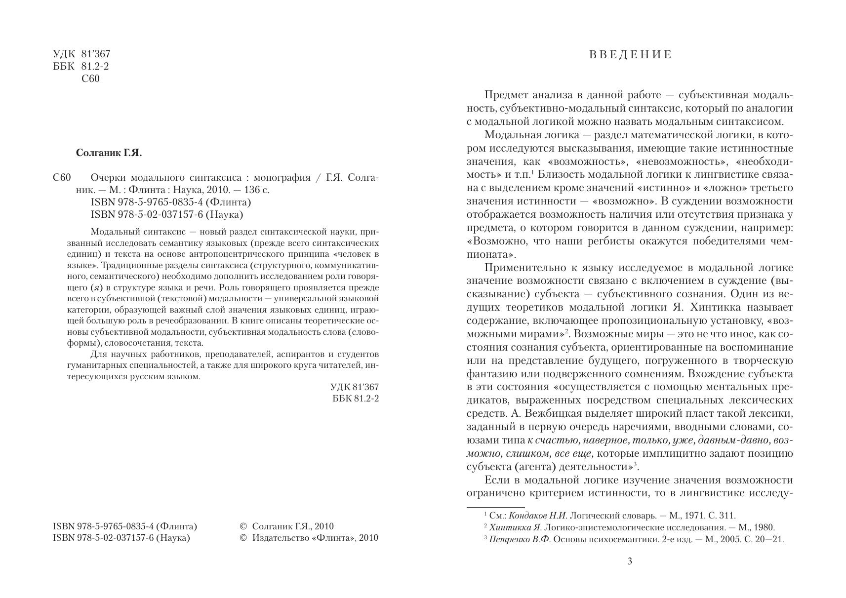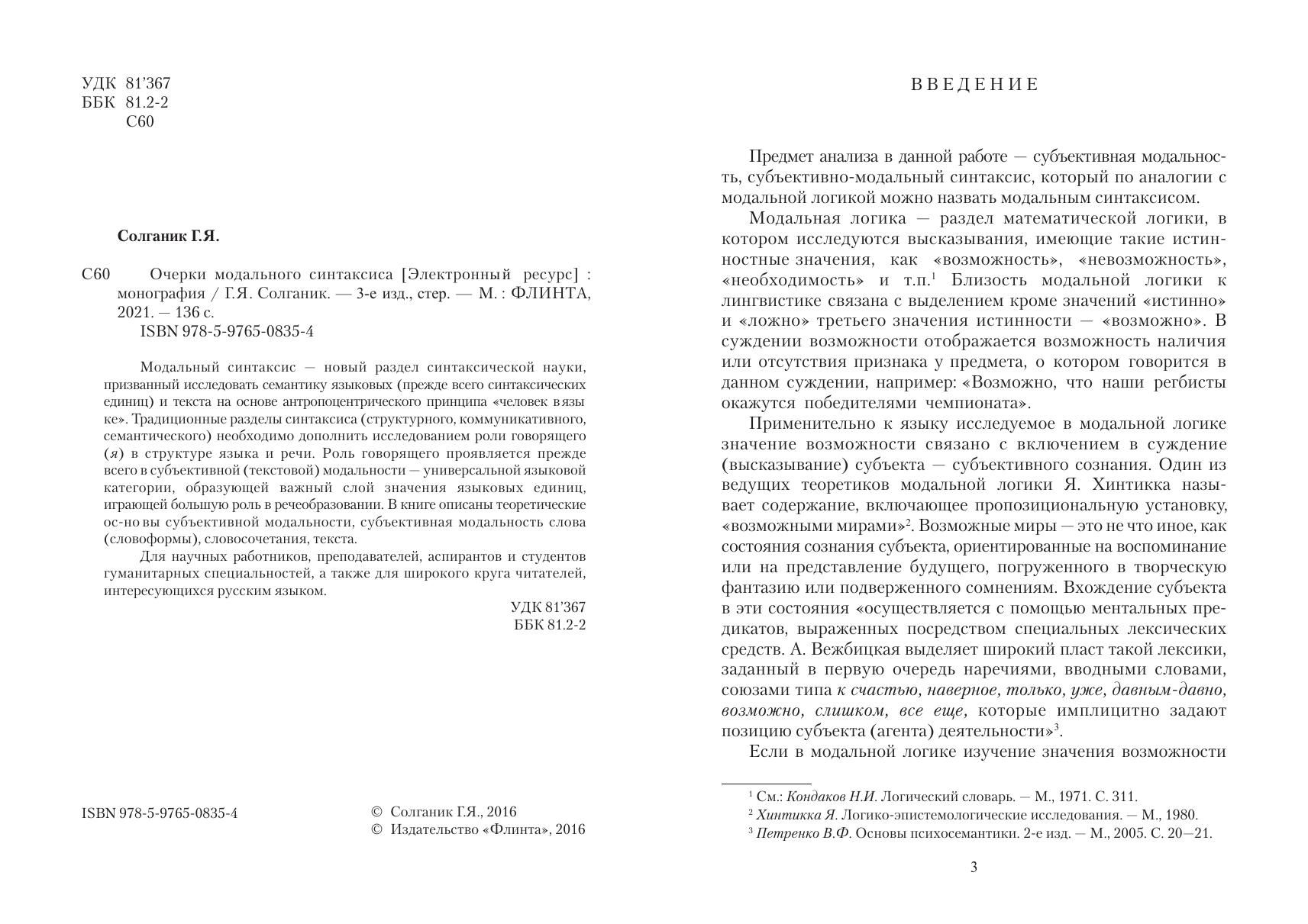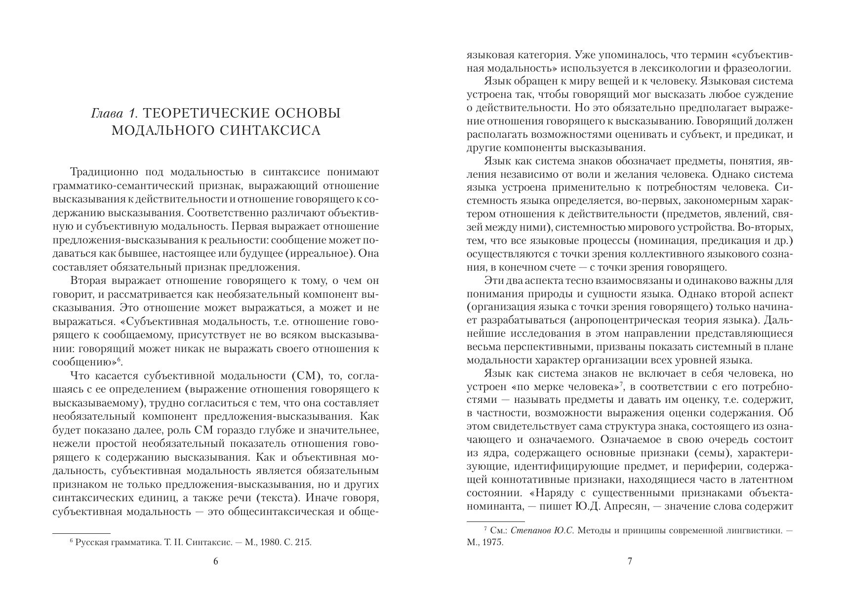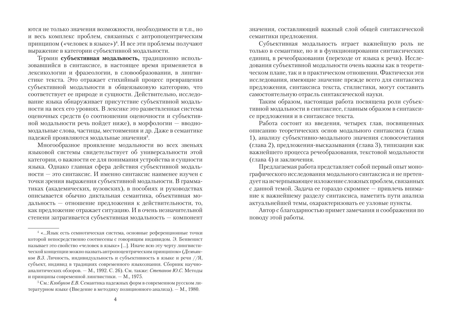 Модальный синтаксис — новый раздел синтаксической науки, призванный исследовать семантику языковых (прежде всего синтаксических единиц) и текста на основе антропоцентрического принципа «человек в языке». Традиционные разделы синтаксиса (структурного, коммуникативного, семантического) необходимо дополнить исследованием роли говорящего (я) в структуре языка и речи. Роль говорящего проявляется прежде всего в субъективной (текстовой) модальности — универсальной языковой категории, образующей важный слой значения языковых единиц, играющей большую роль в речеобразовании. В книге описаны теоретические основы субъективной модальности, субъективная модальность слова (словоформы), словосочетания, текста. Для научных работников, преподавателей, аспирантов и студентов гуманитарных специальностей, а также для широкого круга читателей, интересующихся русским языком.