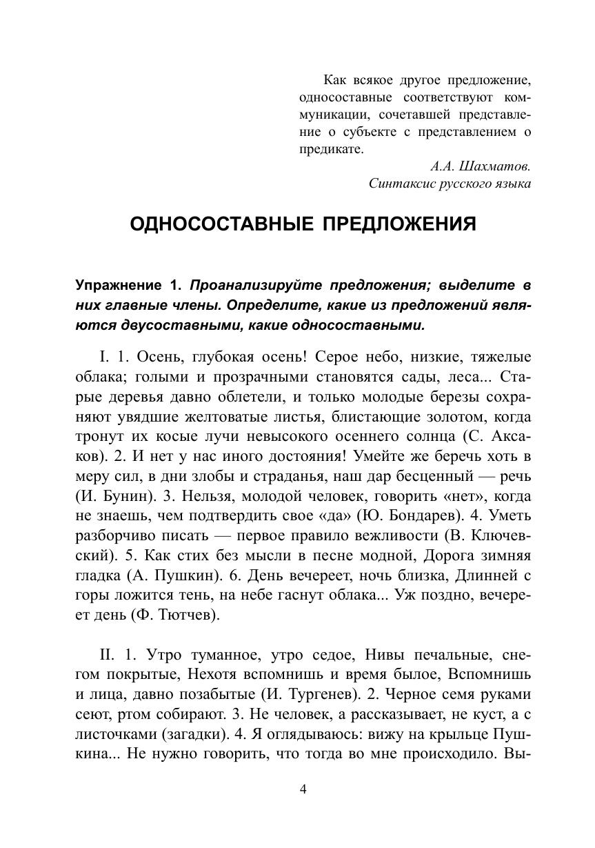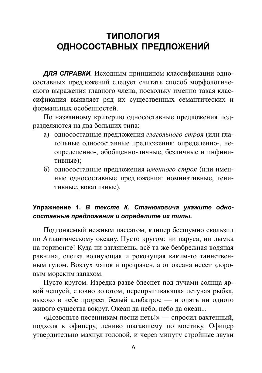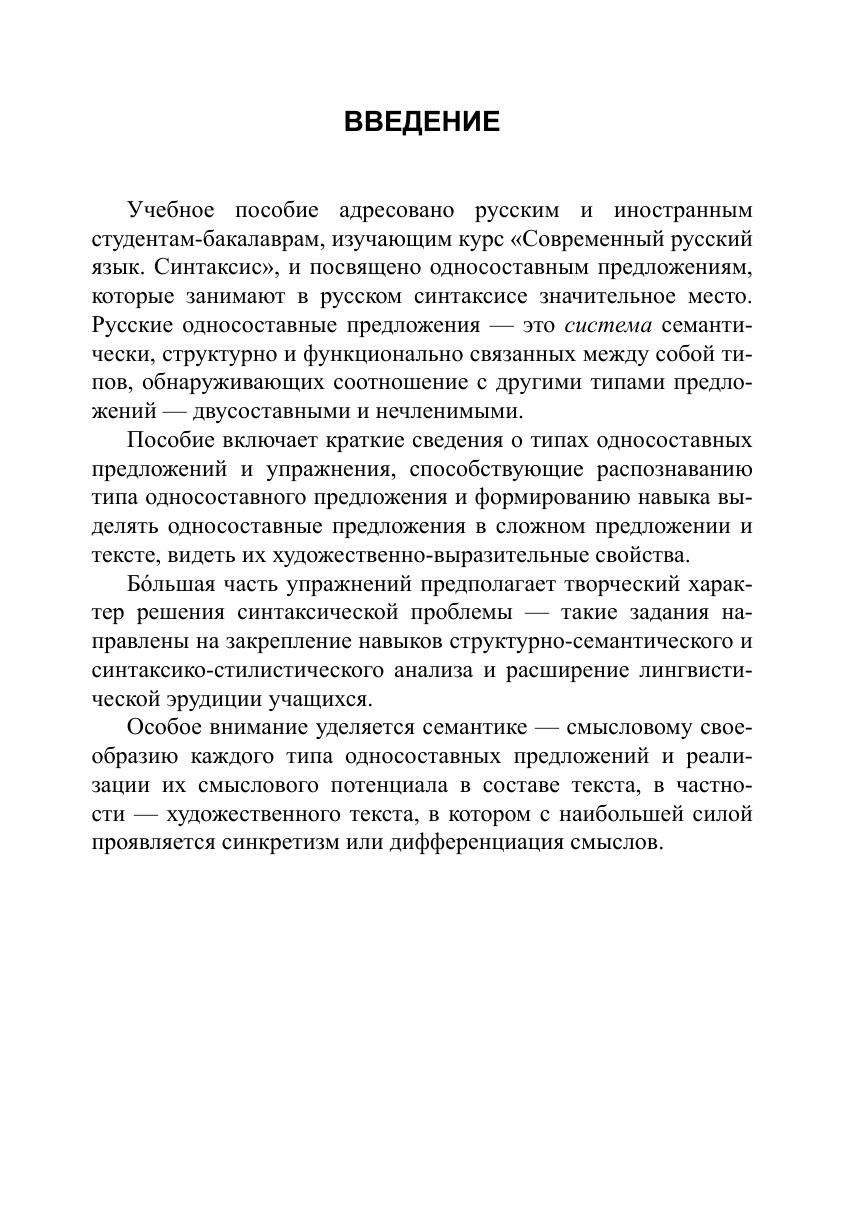 Пособие включает краткие сведения о типах односоставных предложений и упражнения, способствующие распознаванию типа односоставного предложения и формированию навыка выделять односоставные предложения в сложном предложении и тексте, видеть их художественно-выразительные свойства. Бóльшая часть упражнений предполагает творческий характер решения синтаксической проблемы — такие задания направлены на закрепление навыков структурно-семантического и синтаксико-стилистического анализа и расширение лингвистической эрудиции учащихся.
