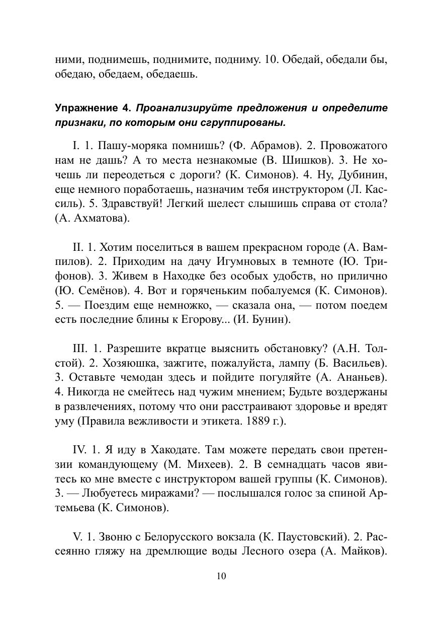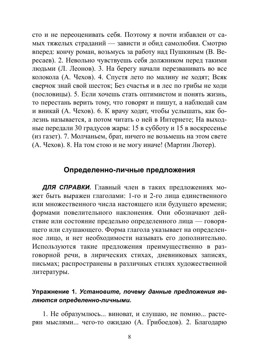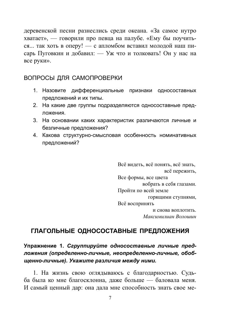 Пособие включает краткие сведения о типах односоставных предложений и упражнения, способствующие распознаванию типа односоставного предложения и формированию навыка выделять односоставные предложения в сложном предложении и тексте, видеть их художественно-выразительные свойства. Бóльшая часть упражнений предполагает творческий характер решения синтаксической проблемы — такие задания направлены на закрепление навыков структурно-семантического и синтаксико-стилистического анализа и расширение лингвистической эрудиции учащихся.