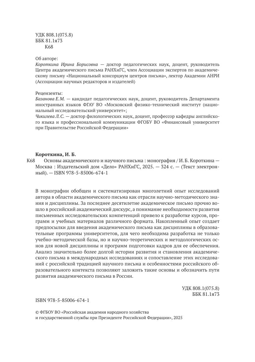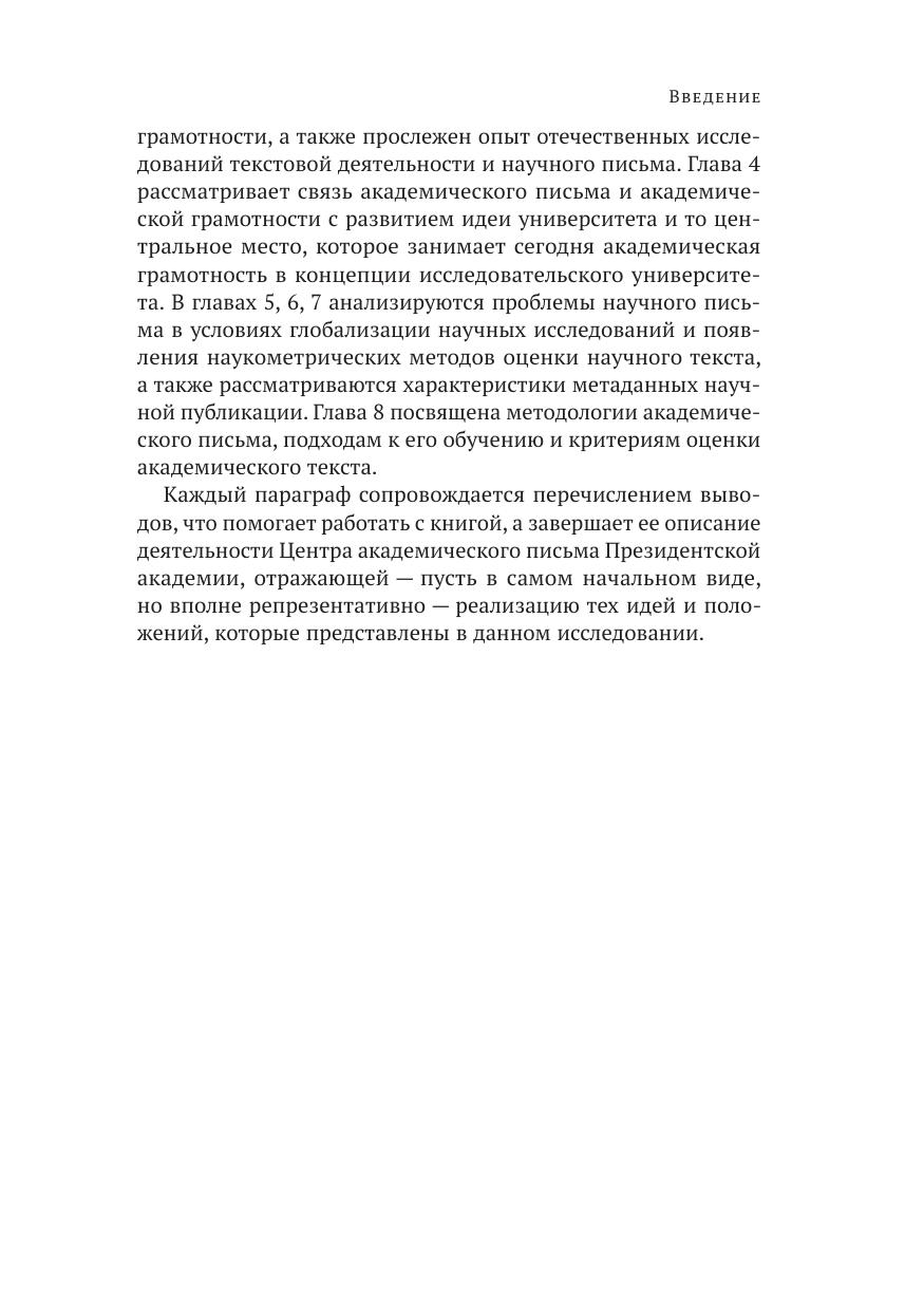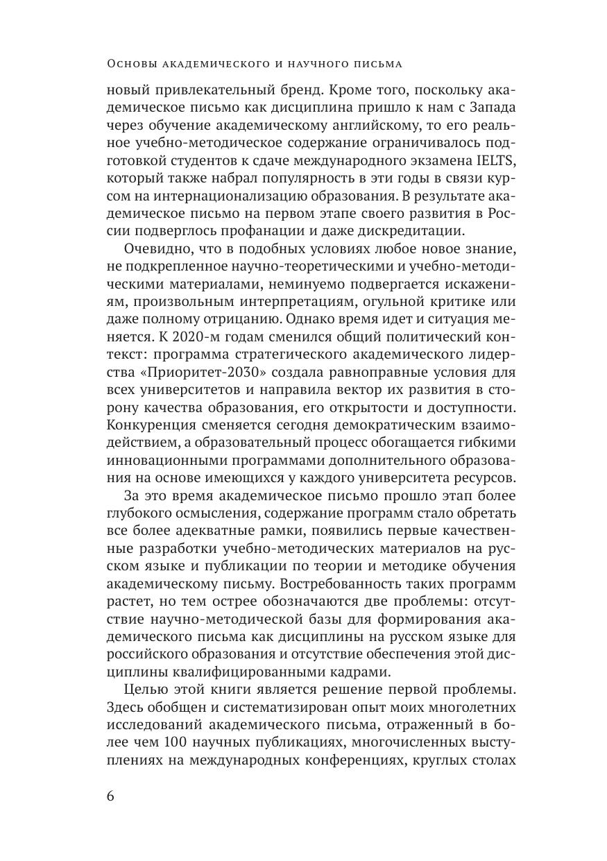 В монографии обобщен и систематизирован многолетний опыт исследований автора в области академического письма как отрасли научно-методического знания и дисциплины. За последнее десятилетие академическое письмо прочно вошло в российский академический дискурс, а понимание необходимости развития письменных исследовательских компетенций привело к разработке курсов, программ и учебных материалов различного формата. Накопленный опыт создает предпосылки для введения академического письма как дисциплины в образовательные программы университетов, для чего необходима разработка не только учебно-методической базы, но и научно-теоретических и методологических основ для новой дисциплины и программ подготовки кадров для ее обеспечения. Анализ значительно более долгой истории развития и становления академического письма в международных исследованиях и сопоставление этих исследований с российской традицией научного письма и особенностями российского образовательного контекста позволяют заложить такие основы и обозначить пути развития академического письма в России.