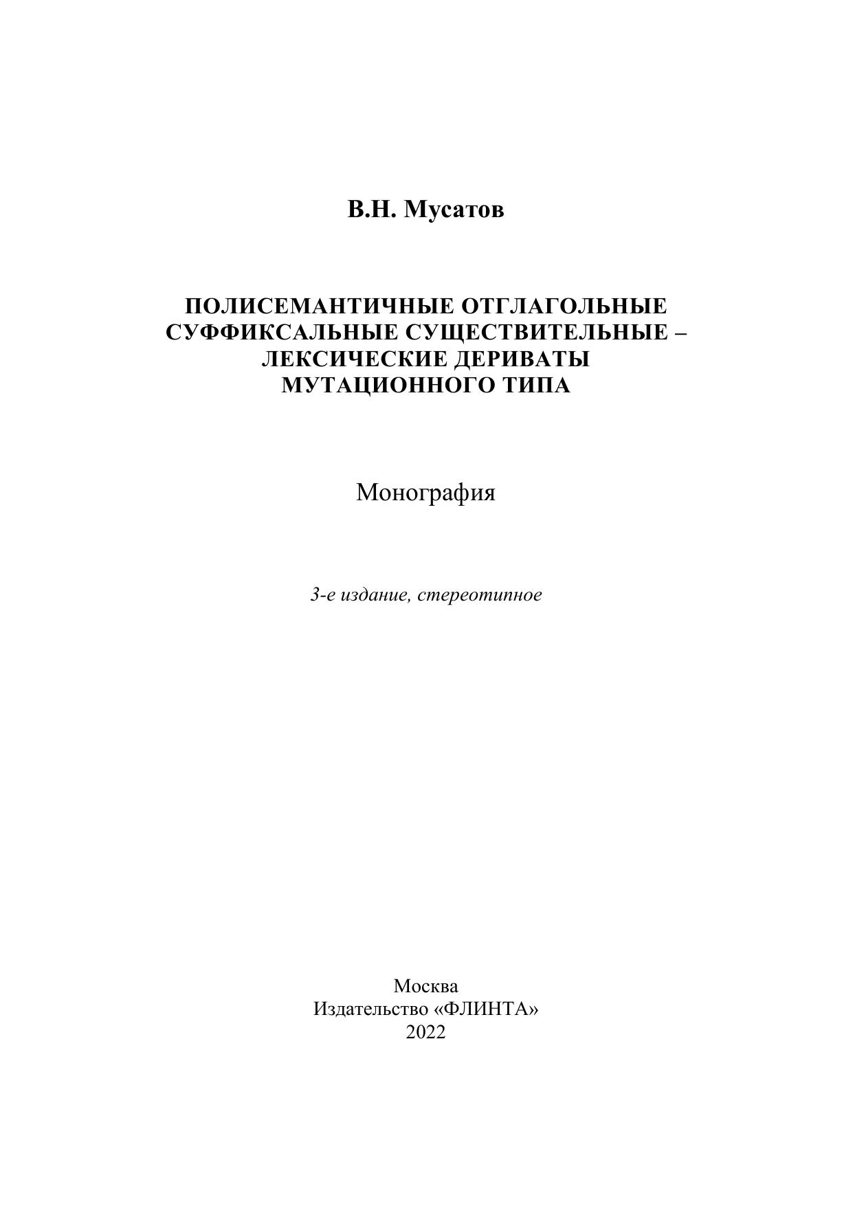 В монографии рассматриваются отглагольные многозначные существительные – лексические дериваты мутационного типа. Выделяются и описываются типы словообразовательной полисемии, указываются источники ее формирования. На каждый тип полисемии приводятся соответствующие примеры. Производные существительные характеризуются со стороны их производящей базы, описываются морфонологические явления, сопровождающие образование данных лексических дериватов.