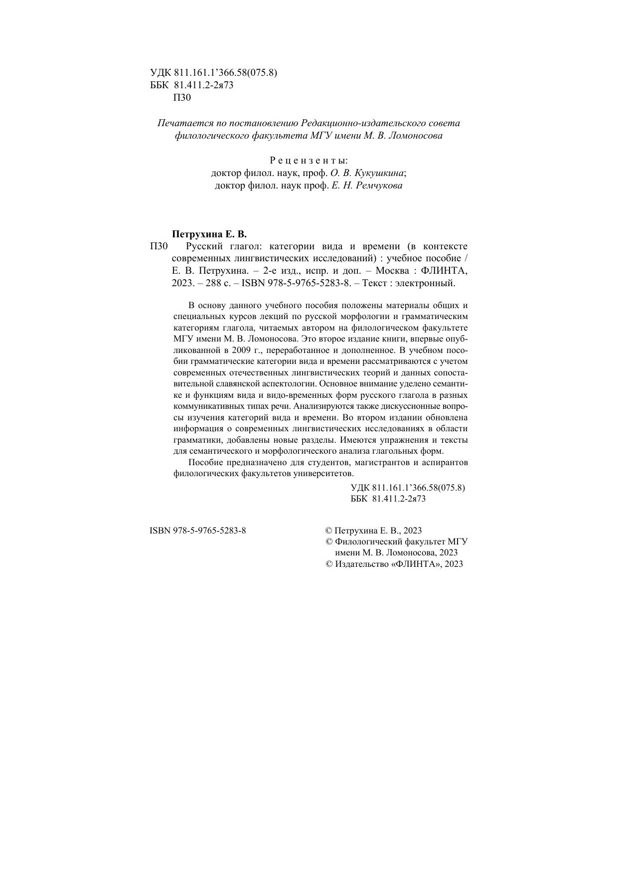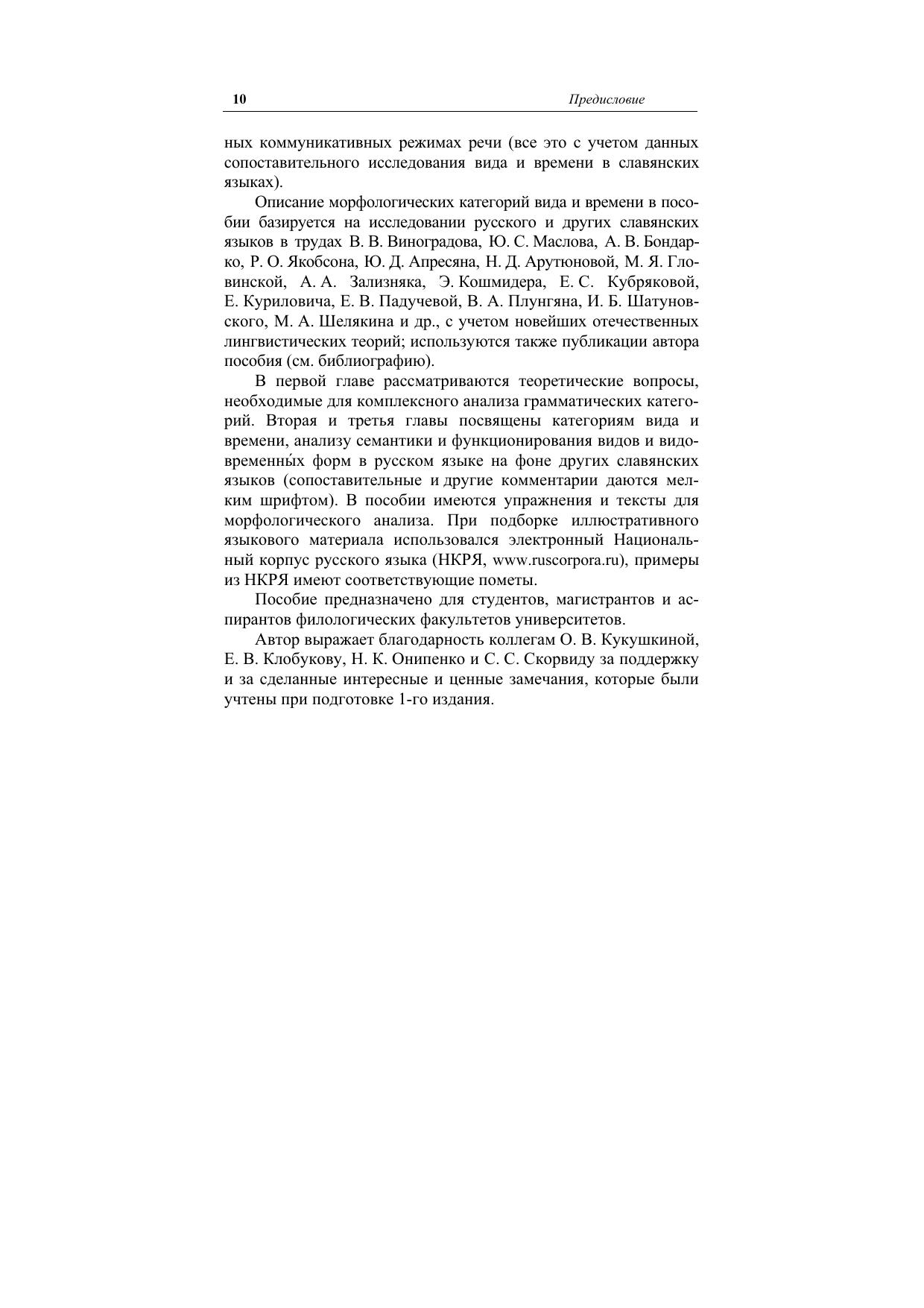 В основу данного учебного пособия положены материалы общих и специальных курсов лекций по русской морфологии и грамматическим категориям глагола, читаемых автором на филологическом факультете МГУ имени М. В. Ломоносова. Это второе издание книги, впервые опубликованной в 2009 г., переработанное и дополненное. В учебном пособии грамматические категории вида и времени рассматриваются с учетом современных отечественных лингвистических теорий и данных сопоставительной славянской аспектологии. Основное внимание уделено семантике и функциям вида и видо-временных форм русского глагола в разных коммуникативных типах речи. Анализируются также дискуссионные вопро-сы изучения категорий вида и времени. Во втором издании обновлена информация о современных лингвистических исследованиях в области грамматики, добавлены новые разделы. Имеются упражнения и тексты для семантического и морфологического анализа глагольных форм.