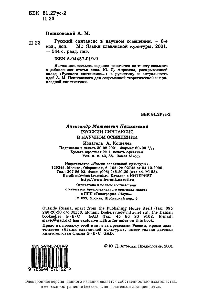 Настоящее, восьмое, издание печатается по тексту седьмого с добавлением статьи академика Ю.Д.Апресяна, раскрывающей вклад "Русский синтаксис в научном освещении" в русистику и актуальность идей А.М.Пешковского для современной теоретической и прикладной лингвистики.