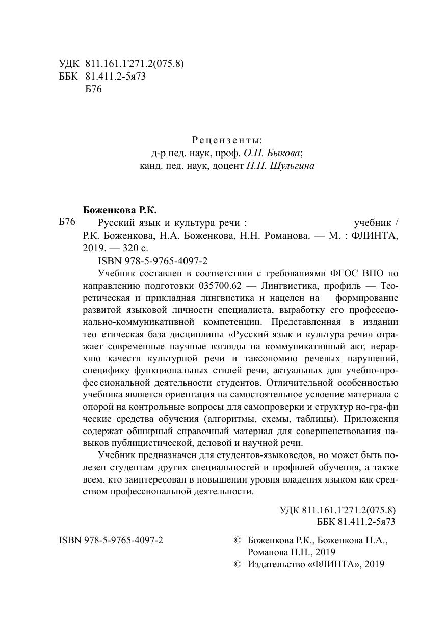 Учебник составлен в соответствии с требованиями ФГОС ВПО по направлению подготовки 035700.62 — Лингвистика, профиль — Теоретическая и прикладная лингвистика и нацелен на формирование развитой языковой личности специалиста, выработку его профессионально-коммуникативной компетенции. Представленная в издании теоретическая база дисциплины «Русский язык и культура речи» отражает современные научные взгляды на коммуникативный акт, иерархию качеств культурной речи и таксономию речевых нарушений, специфику функциональных стилей речи, актуальных для учебно-профессиональной деятельности студентов. Отличительной особенностью учебника является ориентация на самостоятельное усвоение материала с опорой на контрольные вопросы для самопроверки и структурно-графические средства обучения (алгоритмы, схемы, таблицы). Приложения содержат обширный справочный материал для совершенствования навыков публицистической, деловой и научной речи.