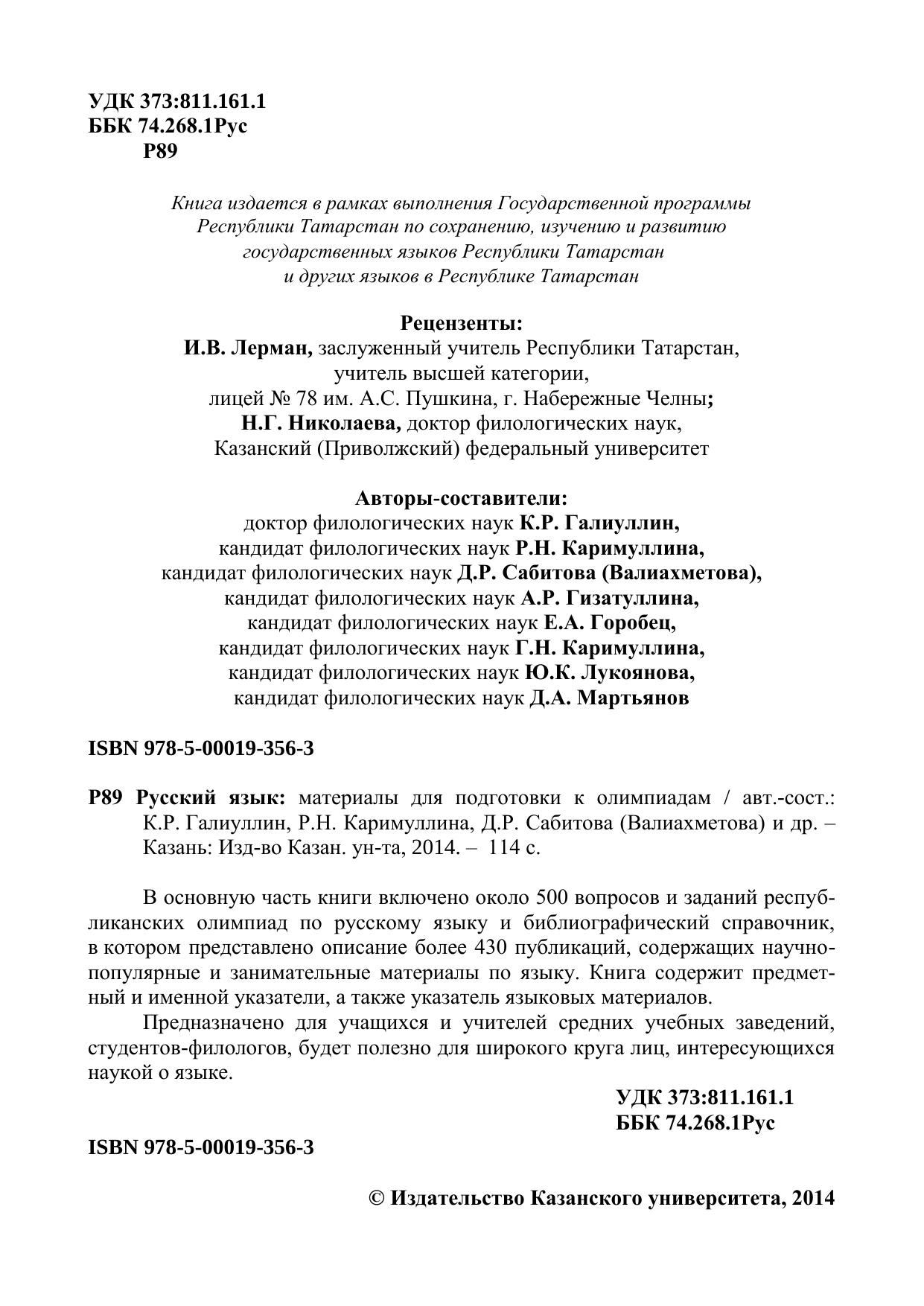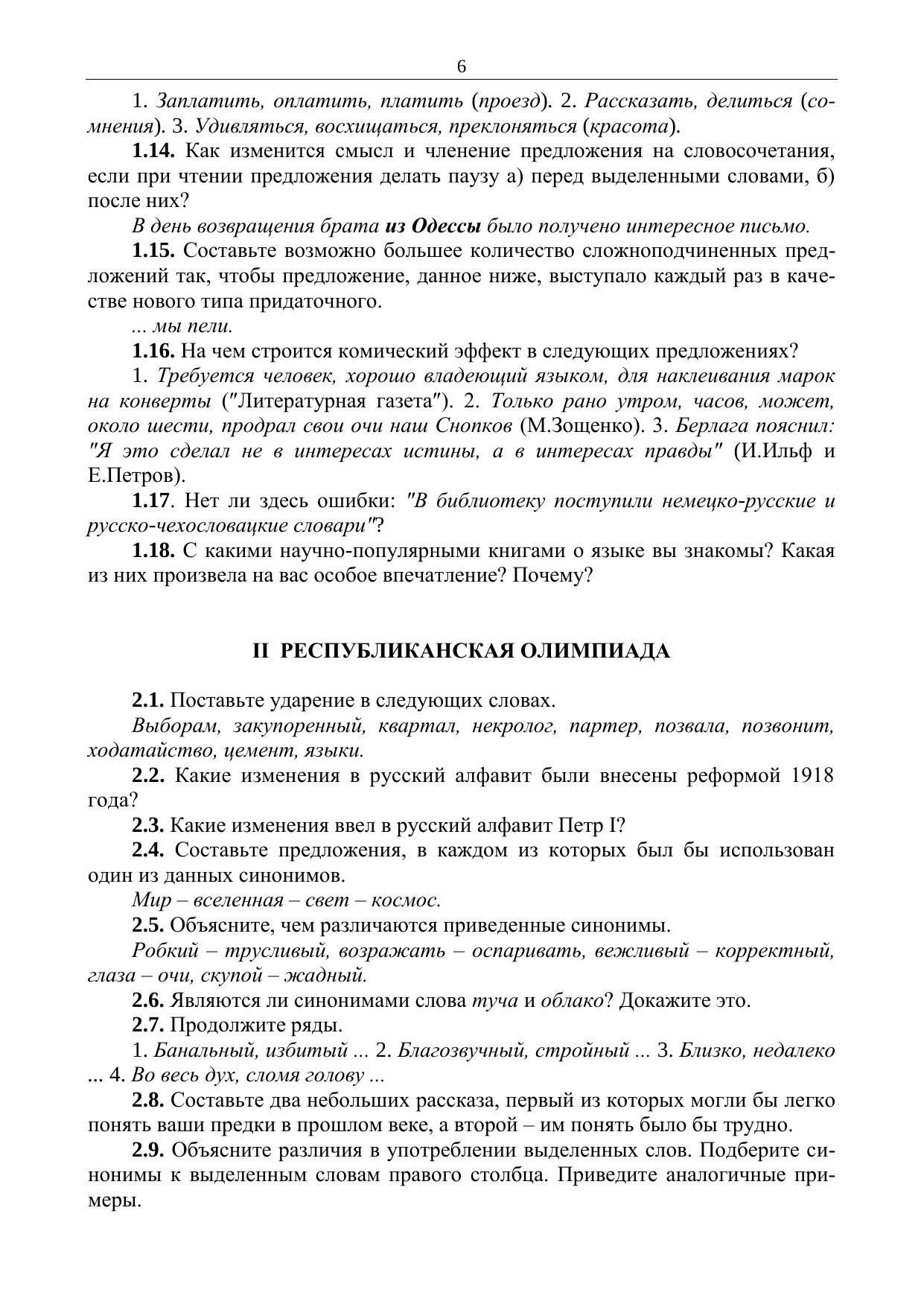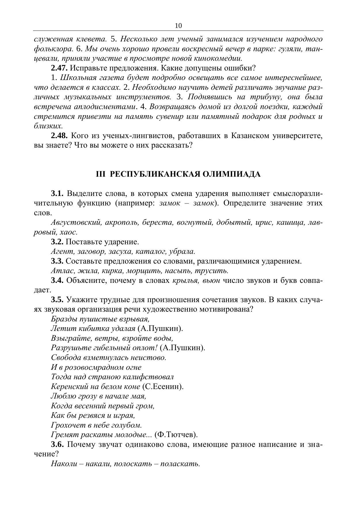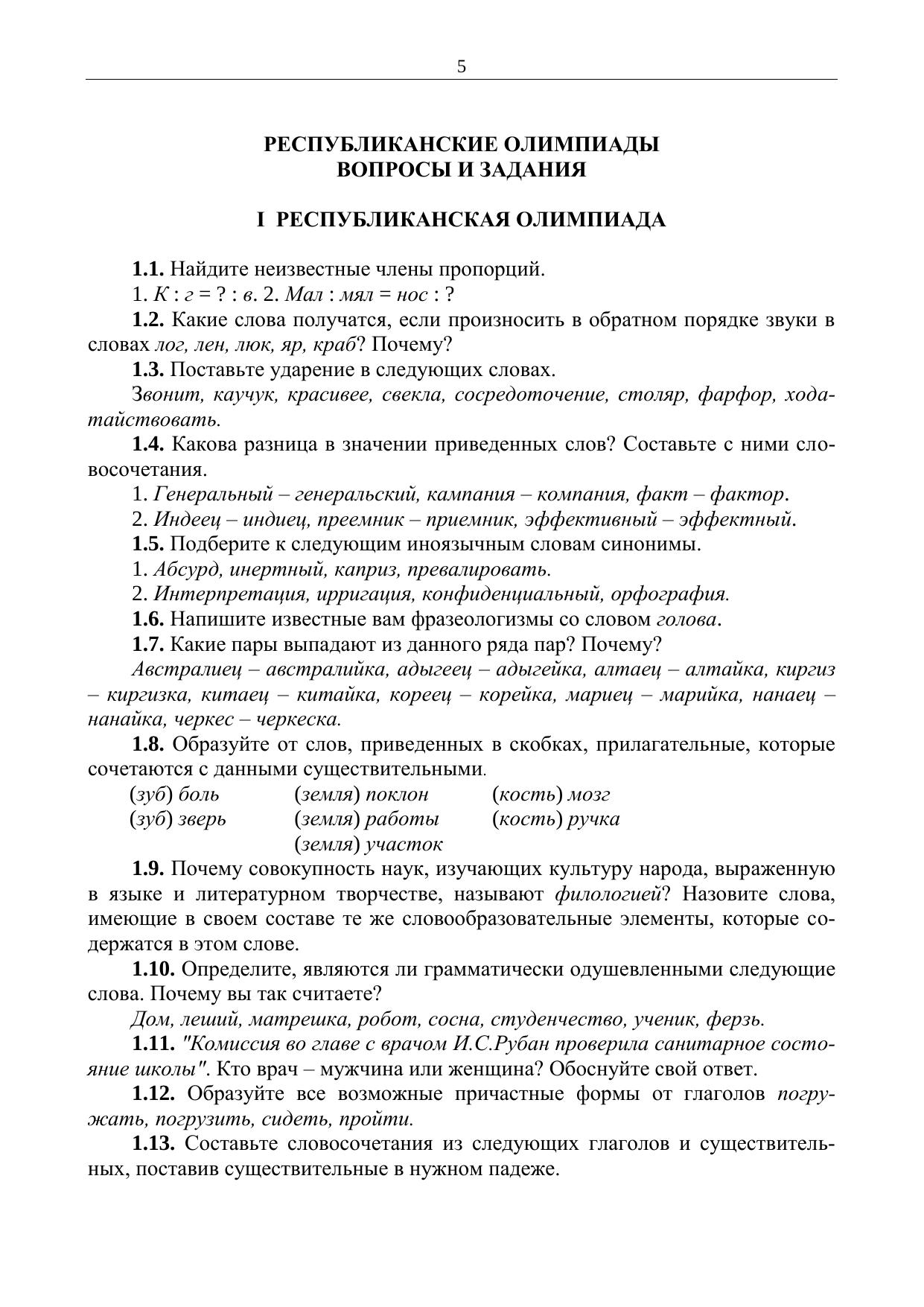 В основную часть книги включено около 500 вопросов и заданий республиканских олимпиад по русскому языку и библиографический справочник, в котором представлено описание более 430 публикаций, содержащих научно-популярные и занимательные материалы по языку. Книга содержит предметный и именной указатели, а также указатель языковых материалов. Предназначено для учащихся и учителей средних учебных заведений, студентов-филологов, будет полезно для широкого круга лиц, интересующихся наукой о языке.