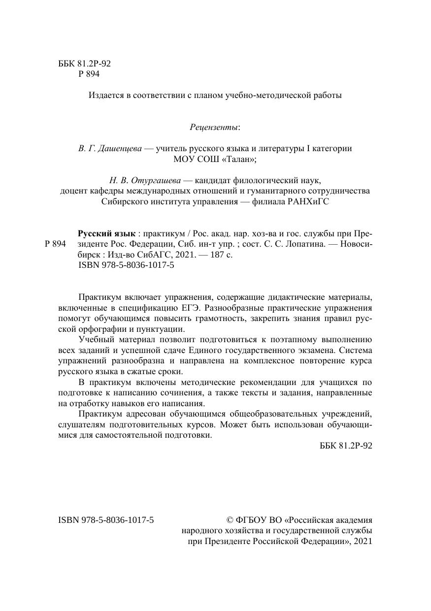 Практикум включает упражнения, содержащие дидактические материалы, включенные в спецификацию ЕГЭ. Разнообразные практические упражнения помогут обучающимся повысить грамотность, закрепить знания правил рус-ской орфографии и пунктуации. Учебный материал позволит подготовиться к поэтапному выполнению всех заданий и успешной сдаче Единого государственного экзамена. Система упражнений разнообразна и направлена на комплексное повторение курса русского языка в сжатые сроки. В практикум включены методические рекомендации для учащихся по подготовке к написанию сочинения, а также тексты и задания, направленные на отработку навыков его написания. Практикум адресован обучающимся общеобразовательных учреждений, слушателям подготовительных курсов. Может быть использован обучающи-мися для самостоятельной подготовки.