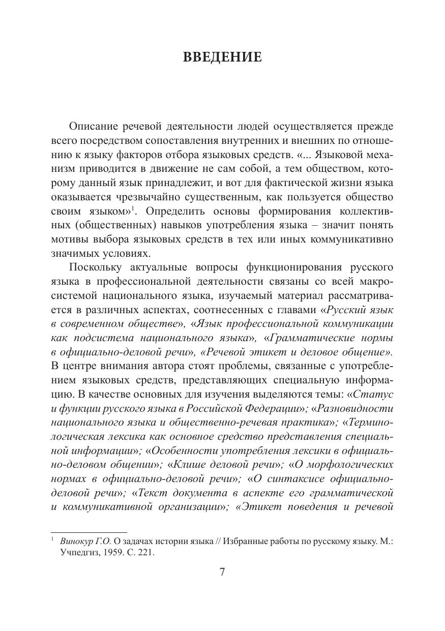 В учебном пособии представлены материалы о функционировании русского языка в профессиональной деятельности. Пособие состоит из четырех глав: «Русский язык в современном обществе», «Язык профессиональной коммуникации как подсистема национального языка», «Грамматические нормы в официально-деловой речи», «Речевой этикет и деловое общение».