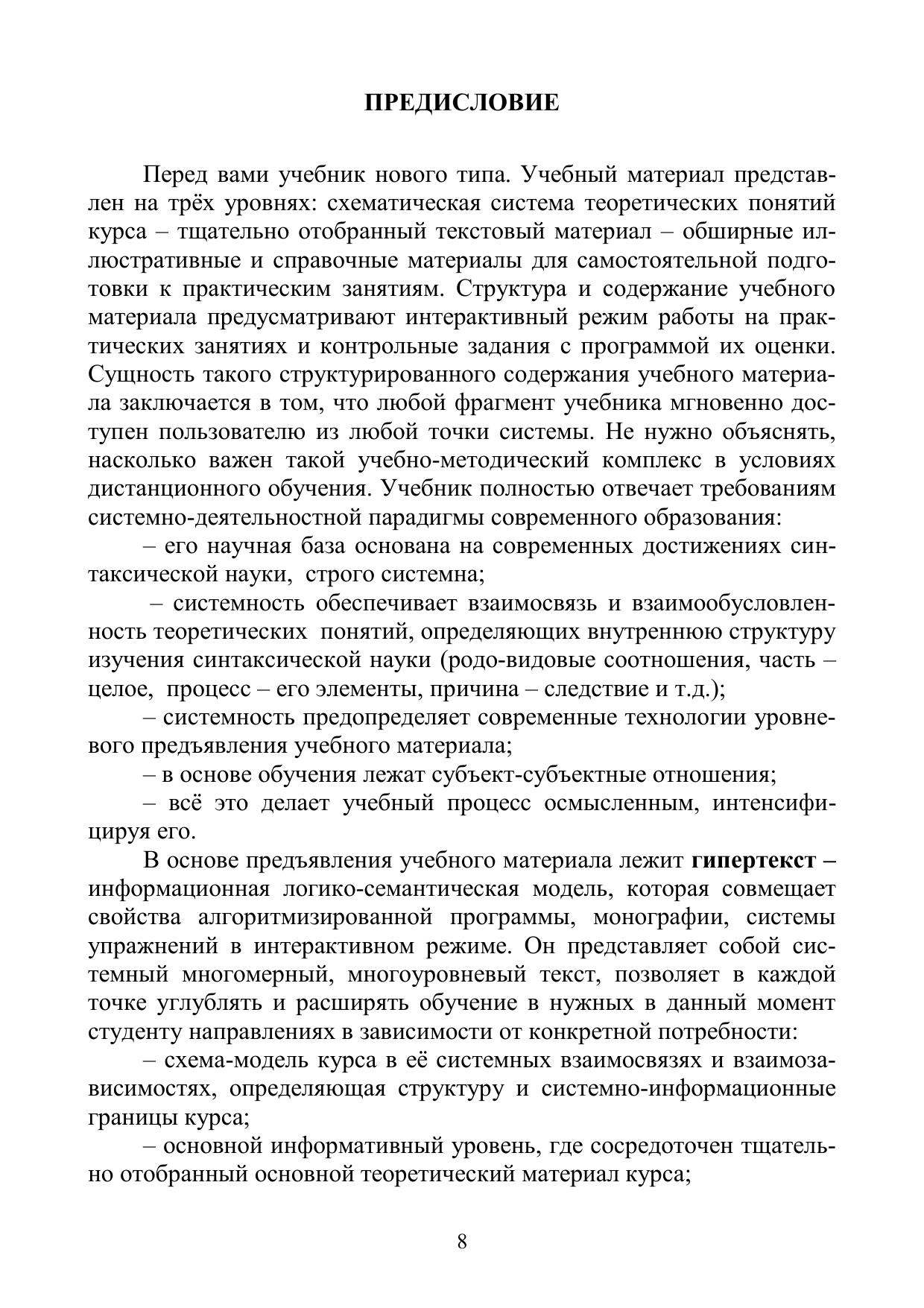 В учебнике содержание курса описывается на трёх уровнях: схематическая система теоретических понятий курса – системно отобранный текстовый материал – обширные иллюстративные и справочные материалы для самостоятельной подготовки к практическим занятиям. Структура и содержание учебного материала предусматривают интерактивный режим работы на практических занятиях. Синтаксис простого и сложного предложений описывается на основе структурно-семантического направления, впитавшего лучшие достижения традиционного русского языкознания и успешно развивающего их на современном этапе. Основные свойства синтаксических единиц выявляются в процессе системного описания их взаимообусловленных логического, структурного, семантического и коммуникативного аспектов. Сложные теоретические темы сопровождаются ключевой информацией.