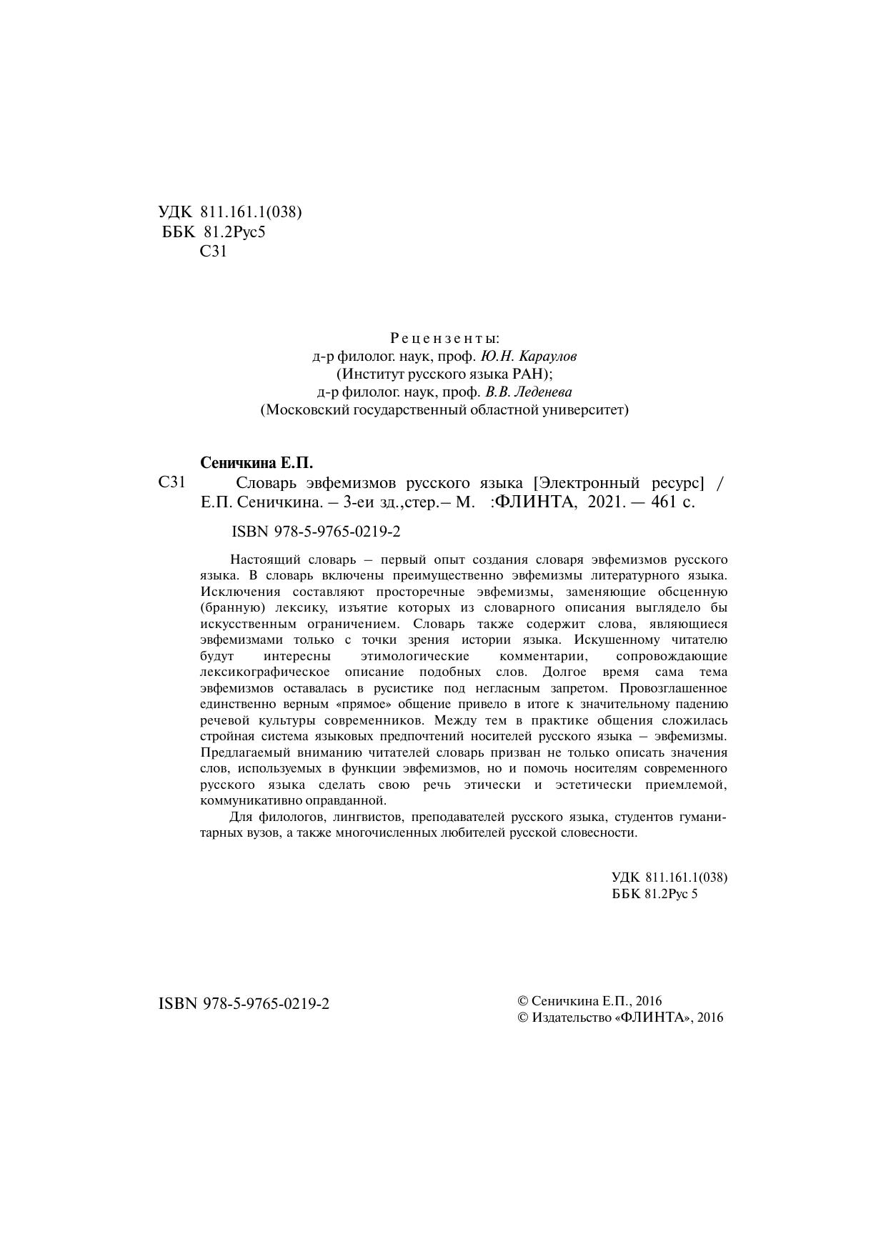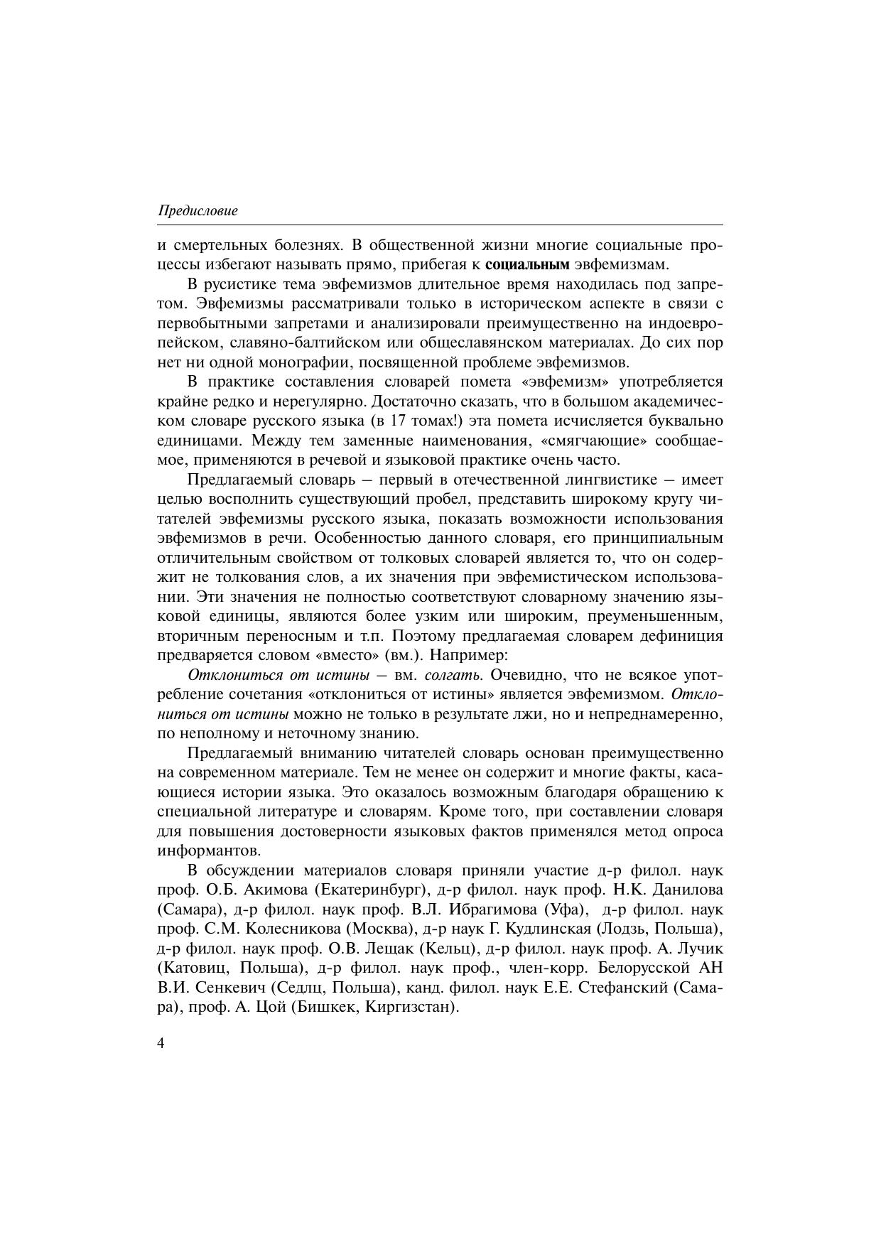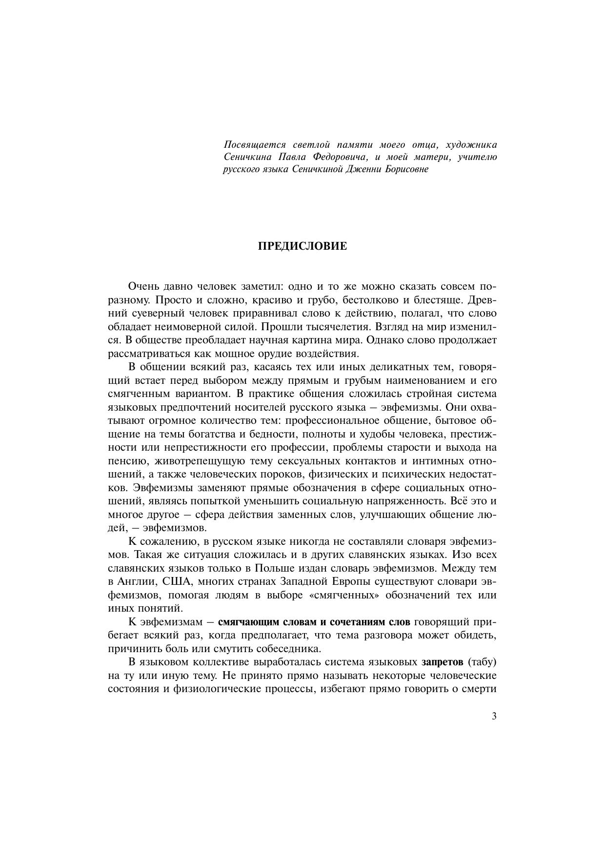 Настоящий словарь – первый опыт создания словаря эвфемизмов русского языка. В словарь включены преимущественно эвфемизмы литературного языка. Исключения составляют просторечные эвфемизмы, заменяющие обсценную (бранную) лексику, изъятие которых из словарного описания выглядело бы искусственным ограничением. Словарь также содержит слова, являющиеся эвфемизмами только с точки зрения истории языка. Искушенному читателю будут интересны этимологические комментарии, сопровождающие лексикографическое описание подобных слов. Долгое время сама тема эвфемизмов оставалась в русистике под негласным запретом. Провозглашенное единственно верным «прямое» общение привело в итоге к значительному падению речевой культуры современников. Между тем в практике общения сложилась стройная система языковых предпочтений носителей русского языка – эвфемизмы. Предлагаемый вниманию читателей словарь призван не только описать значения слов, используемых в функции эвфемизмов, но и помочь носителям современного русского языка сделать свою речь этически и эстетически приемлемой, коммуникативно оправданной.