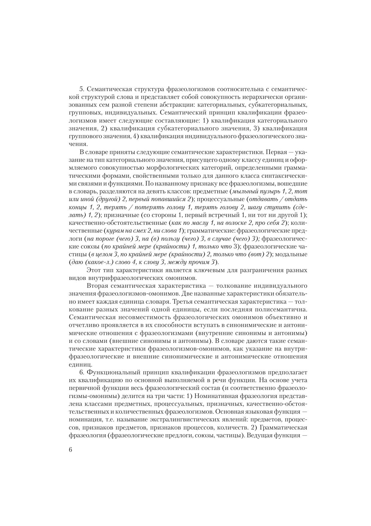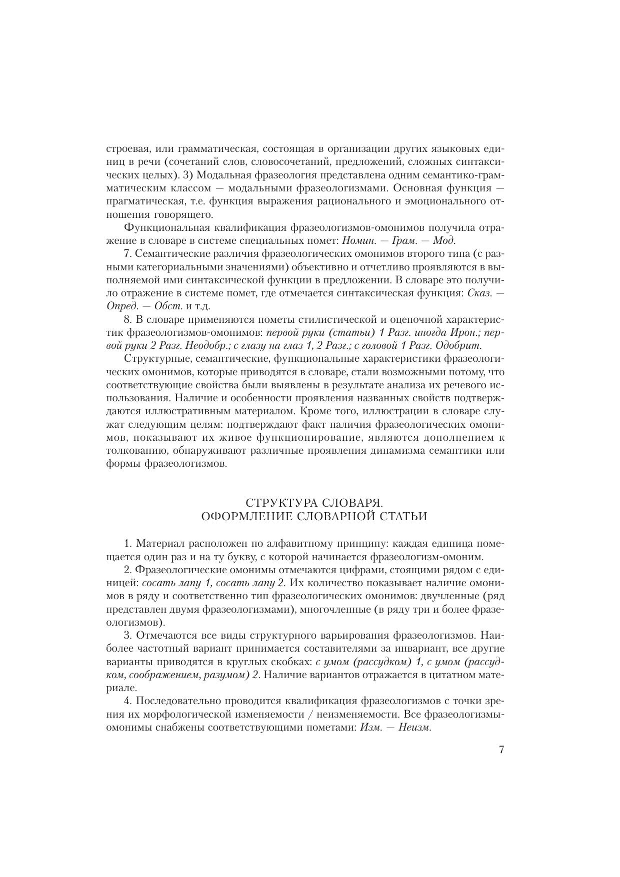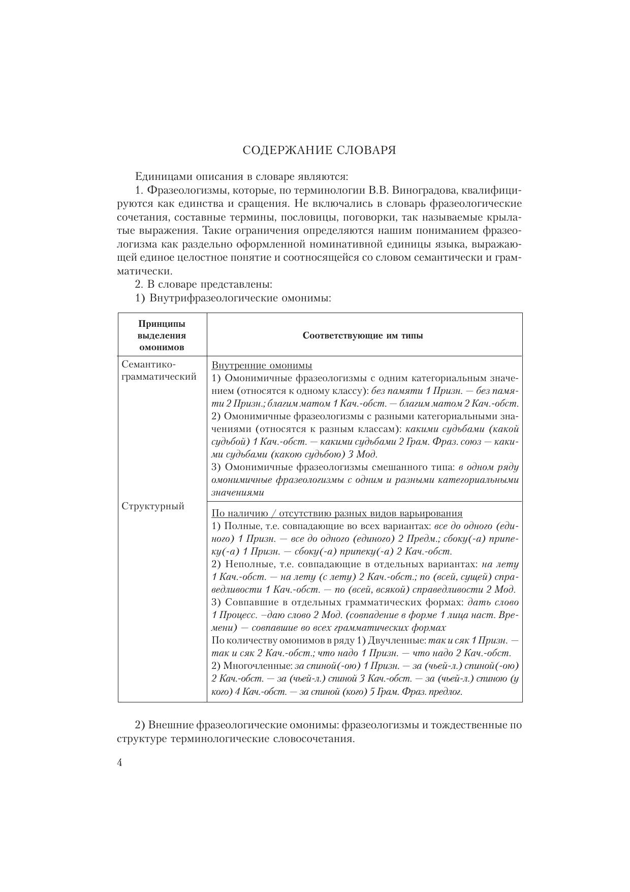 Словарь включает 868 фразеологических омонимов разных типов. Каждая словарная статья содержит истолкование фразеологизма, тип категориального значения, грамматическую, стилистическую характеристики и т.д. В качестве иллюстраций использованы цитаты из литературных текстов, прессы, разговорной речи. Аналогов данному словарю в современной лексикографии нет.