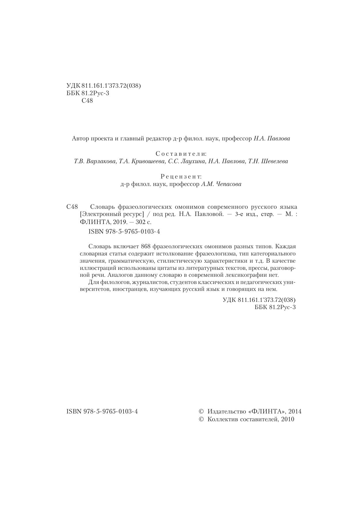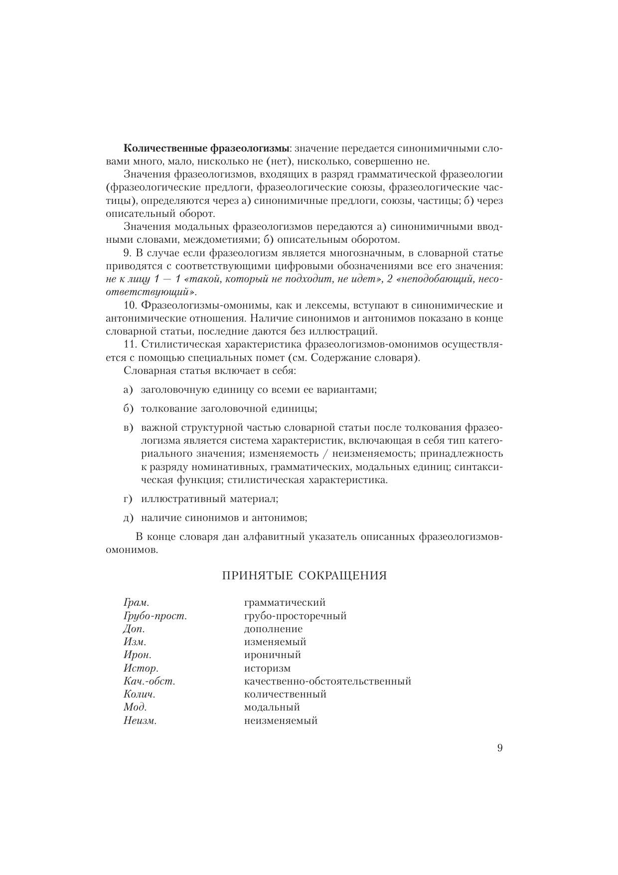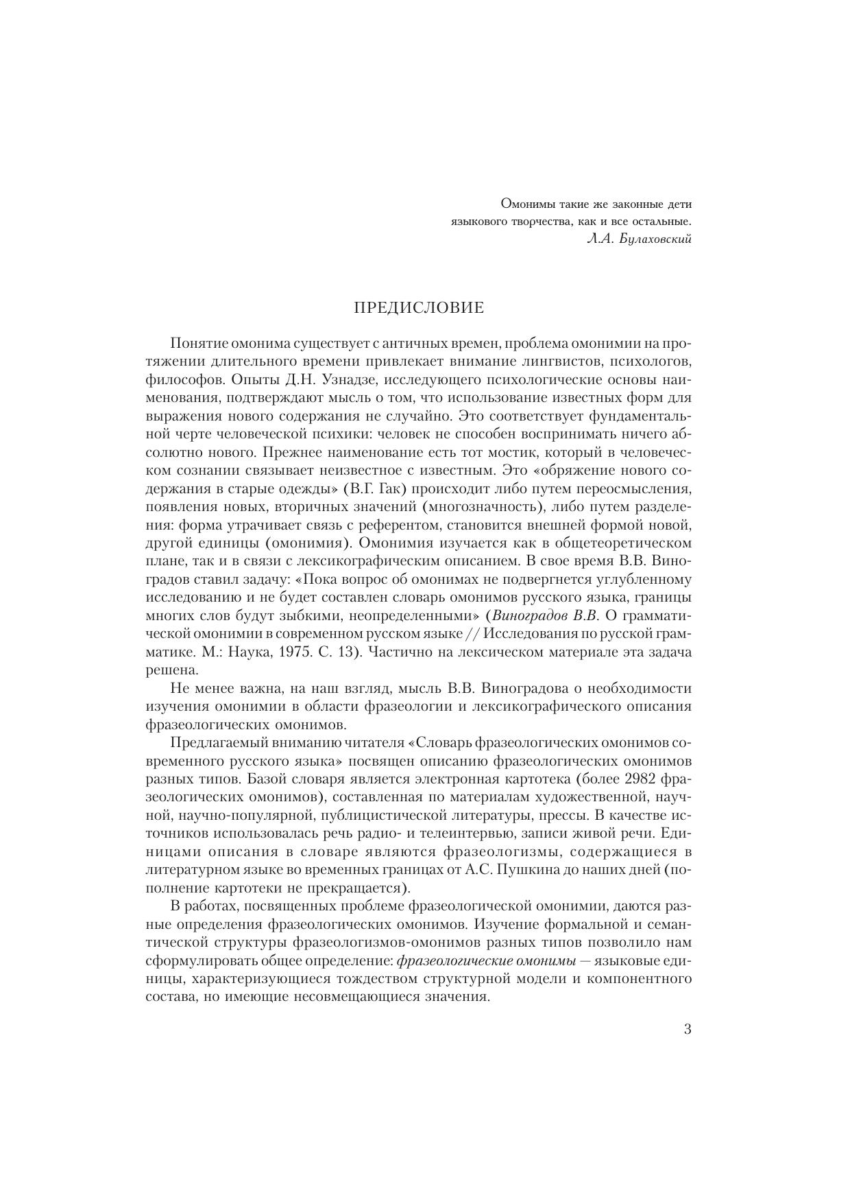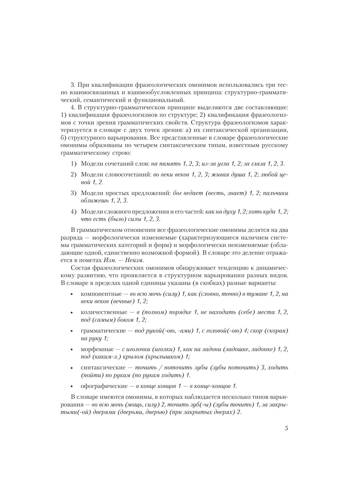 Словарь включает 868 фразеологических омонимов разных типов. Каждая словарная статья содержит истолкование фразеологизма, тип категориального значения, грамматическую, стилистическую характеристики и т.д. В качестве иллюстраций использованы цитаты из литературных текстов, прессы, разговорной речи. Аналогов данному словарю в современной лексикографии нет.