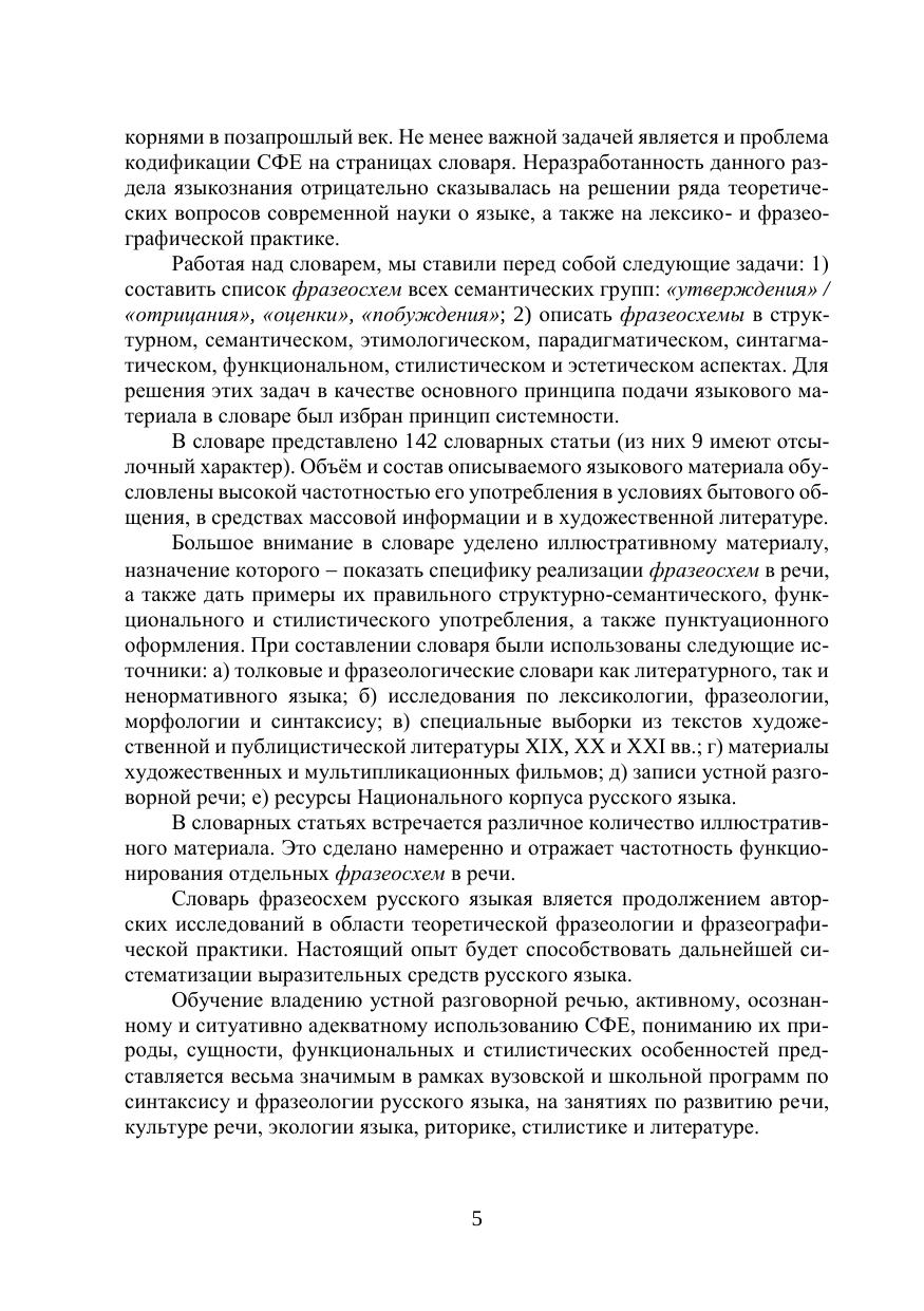 В словаре представлен один из классов синтаксических фразеологических единиц – фразеосинтаксические схемы (фразеосхемы). Фразеосхемы – это экспрессивные синтаксические конструкции, которые составляют основу повседневного общения каждого человека. Они позволяют более эффективно воздействовать на адресата, выразить нашу индивидуальность, придать колорит речи. Грамотное и уместное их употребление свидетельствует о высоком уровне языковой компетентности человека.