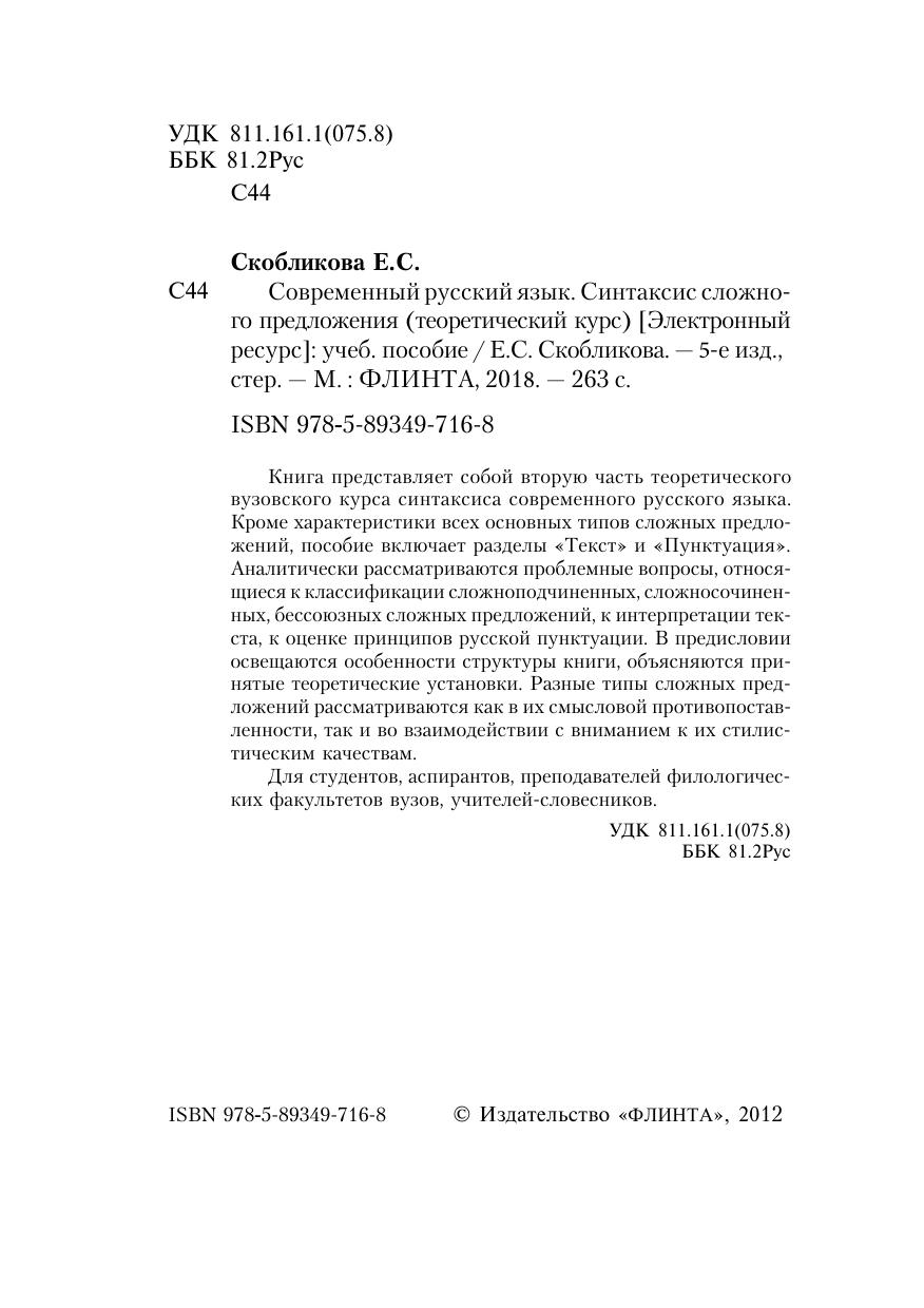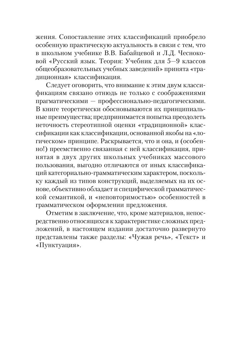 Книга представляет собой вторую часть теоретического вузовского курса синтаксиса современного русского языка. Кроме характеристики всех основных типов сложных предложений, пособие включает разделы «Текст» и «Пунктуация». Аналитически рассматриваются проблемные вопросы, относящиеся к классификации сложноподчиненных, сложносочиненных, бессоюзных сложных предложений, к интерпретации текста, к оценке принципов русской пунктуации. В предисловии освещаются особенности структуры книги, объясняются принятые теоретические установки. Разные типы сложных предложений рассматриваются как в их смысловой противопоставленности, так и во взаимодействии с вниманием к их стилистическим качествам.