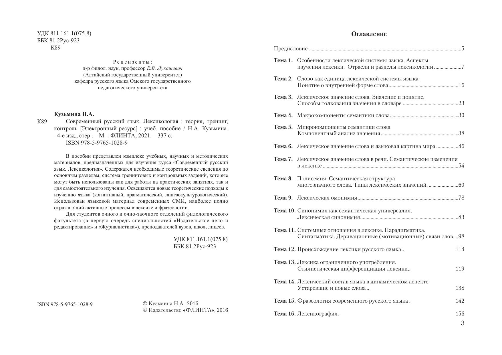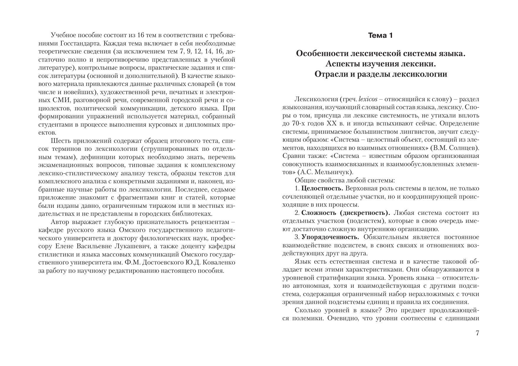 В пособии представлен комплекс учебных, научных и методических материалов, предназначенных для изучения курса «Современный русский язык. Лексикология». Содержатся необходимые теоретические сведения по основным разделам, система тренинговых и контрольных заданий, которые могут быть использованы как для работы на практических занятиях, так и для самостоятельного изучения. Освещаются новые теоретические подходы к изучению языка (когнитивный, прагматический, лингвокультурологический). Использован языковой материал современных СМИ, наиболее полно отражающий активные процессы в лексике и фразеологии.