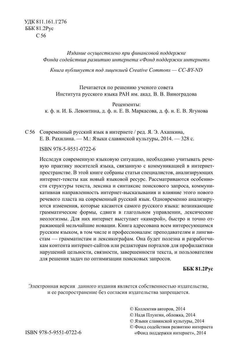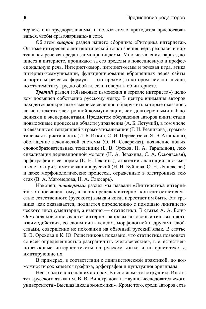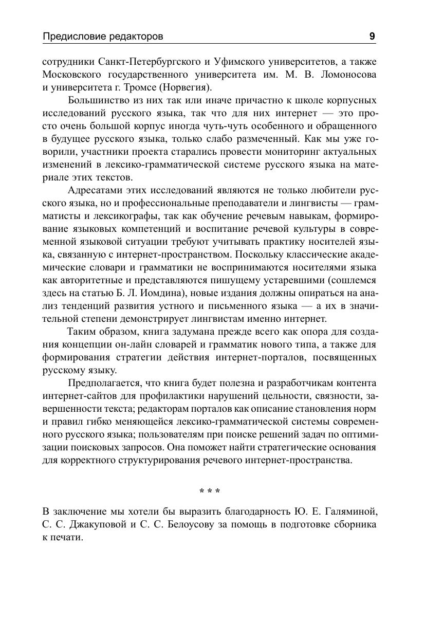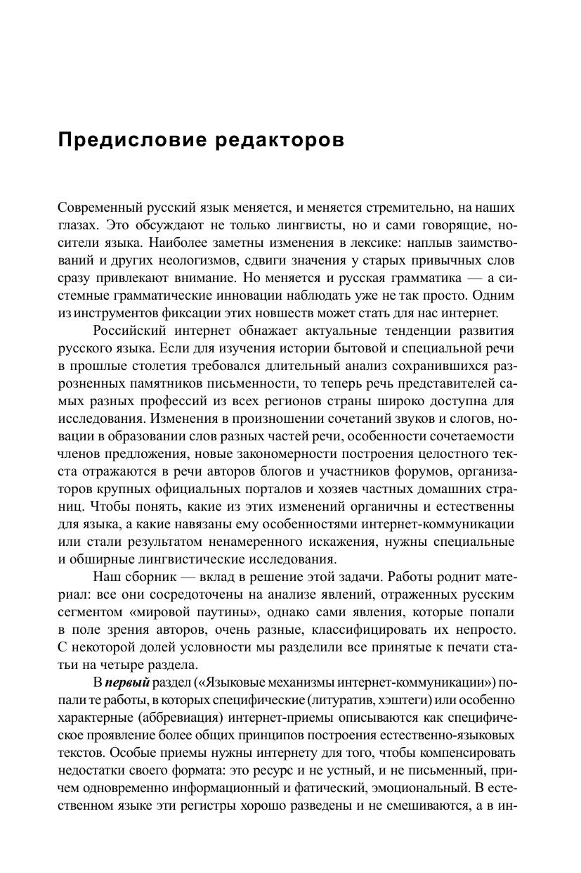 Исследуя современную языковую ситуацию, необходимо учитывать речевую практику носителей языка, связанную с коммуникацией в интернет-пространстве. В этой книге собраны статьи специалистов, анализирующих интернет-тексты как новый языковой ресурс. Рассматриваются особенности структуры текста, лексика и синтаксис поискового запроса, коммуникативная направленность интернет-высказывания и влияние этого нового речевого пласта на современный русский язык. Одновременно анализируются изменения, которые касаются самого русского языка: возникающие грамматические формы, сдвиги в глагольном управлении, лексические неологизмы. Для них интернет выступает «камерой», быстро и точно отражающей мельчайшие новации. Книга адресована всем интересующимся русским языком, в том числе и профессионалам: преподавателям и лингвистам – грамматистам и лексикографам. Она будет полезна и разработчикам контента интернет-сайтов или редакторам порталов для профилактики нарушений цельности, связности, завершенности текста, и пользователям для решения задач по оптимизации поисковых запросов.