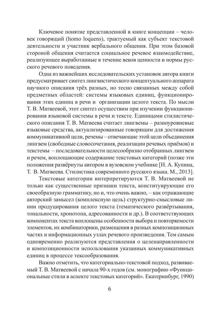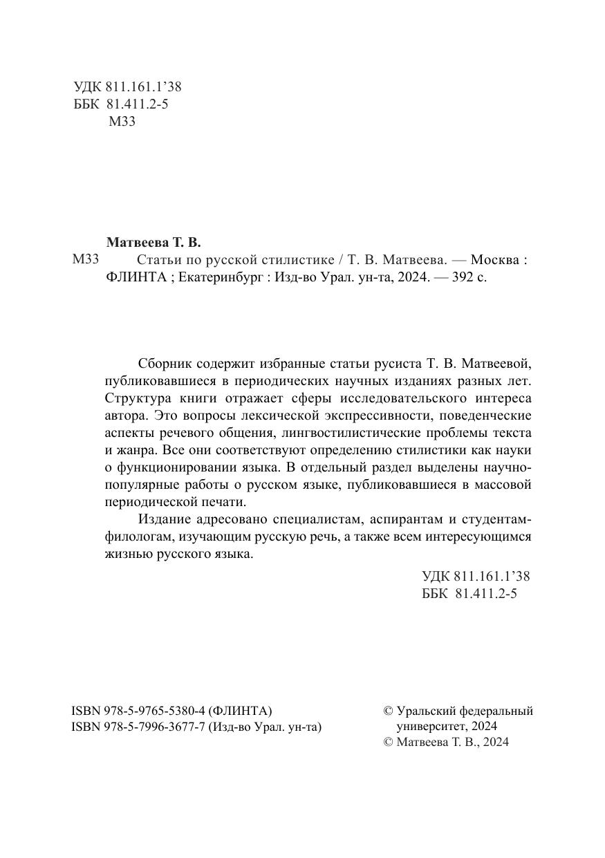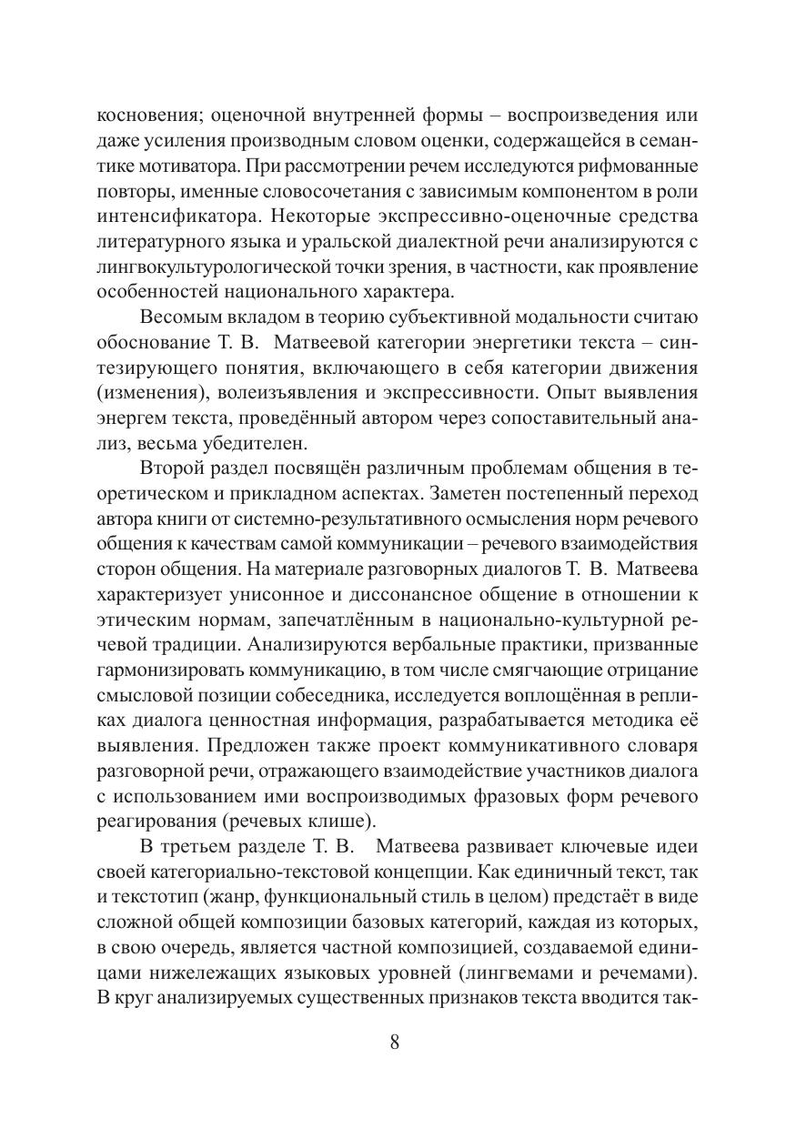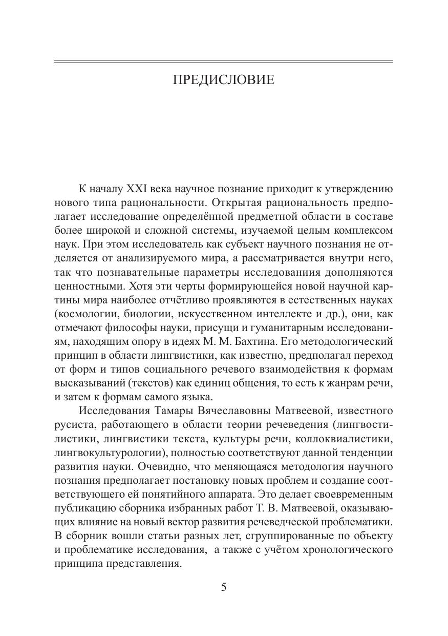 Сборник содержит избранные статьи русиста Т. В. Матвеевой, публиковавшиеся в периодических научных изданиях разных лет. Структура книги отражает сферы исследовательского интереса автора. Это вопросы лексической экспрессивности, поведенческие аспекты речевого общения, лингвостилистические проблемы текста и жанра. Все они соответствуют определению стилистики как науки о функционировании языка. В отдельный раздел выделены научно-популярные работы о русском языке, публиковавшиеся в массовой периодической печати. Издание адресовано специалистам, аспирантам и студентам-филологам, изучающим русскую речь, а также всем интересующимся жизнью русского языка.