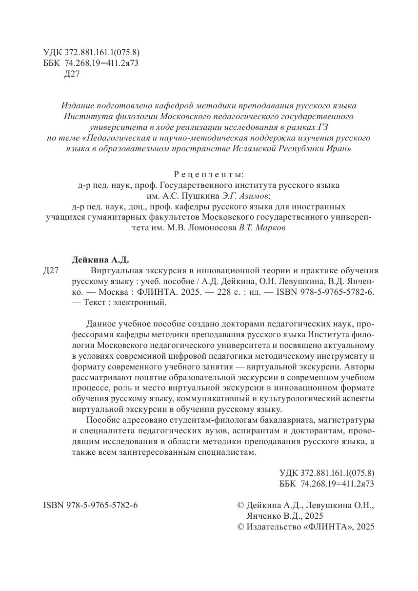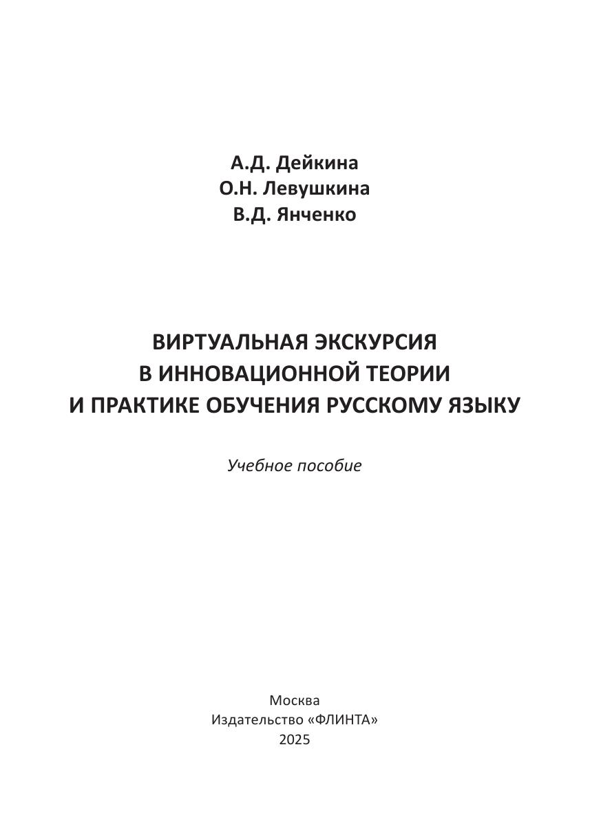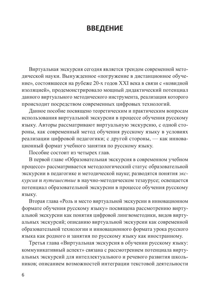 Данное учебное пособие создано докторами педагогических наук, профессорами кафедры методики преподавания русского языка Института филологии Московского педагогического университета и посвящено актуальному в условиях современной цифровой педагогики методическому инструменту и формату современного учебного занятия — виртуальной экскурсии. Авторы рассматривают понятие образовательной экскурсии в современном учебном процессе, роль и место виртуальной экскурсии в инновационном формате обучения русскому языку, коммуникативный и культурологический аспекты виртуальной экскурсии в обучении русскому языку. Пособие адресовано студентам-филологам бакалавриата, магистратуры и специалитета педагогических вузов, аспирантам и докторантам, проводящим исследования в области методики преподавания русского языка, а также всем заинтересованным специалистам.