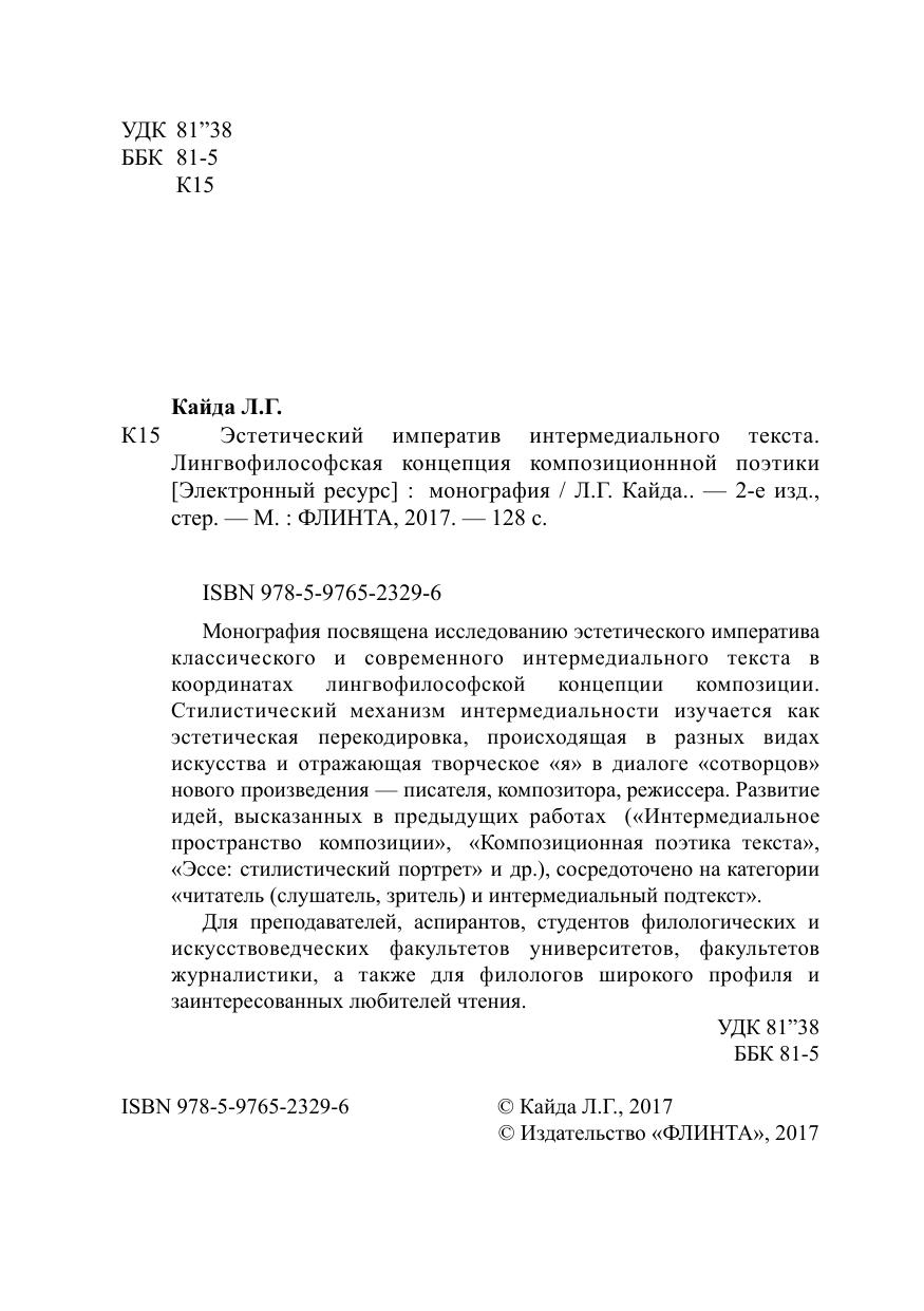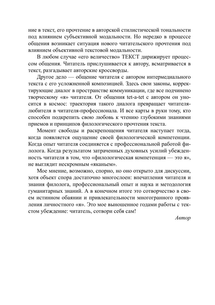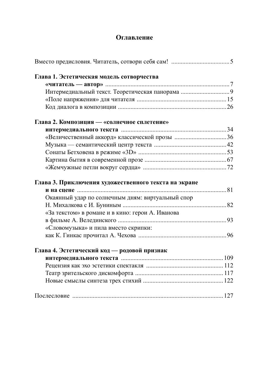 Монография посвящена исследованию эстетического императива классического и современного интермедиального текста в координатах лингвофилософской концепции композиции. Стилистический механизм интермедиальности изучается как эстетическая перекодировка, происходящая в разных видах искусства и отражающая творческое «я» в диалоге «сотворцов» нового произведения — писателя, композитора, режиссера. Развитие идей, высказанных в предыдущих работах («Интермедиальное пространство композиции», «Композиционная поэтика текста», «Эссе: стилистический портрет» и др.), сосредоточено на категории «читатель (слушатель, зритель) и интермедиальный подтекст».