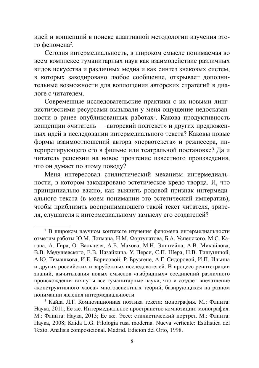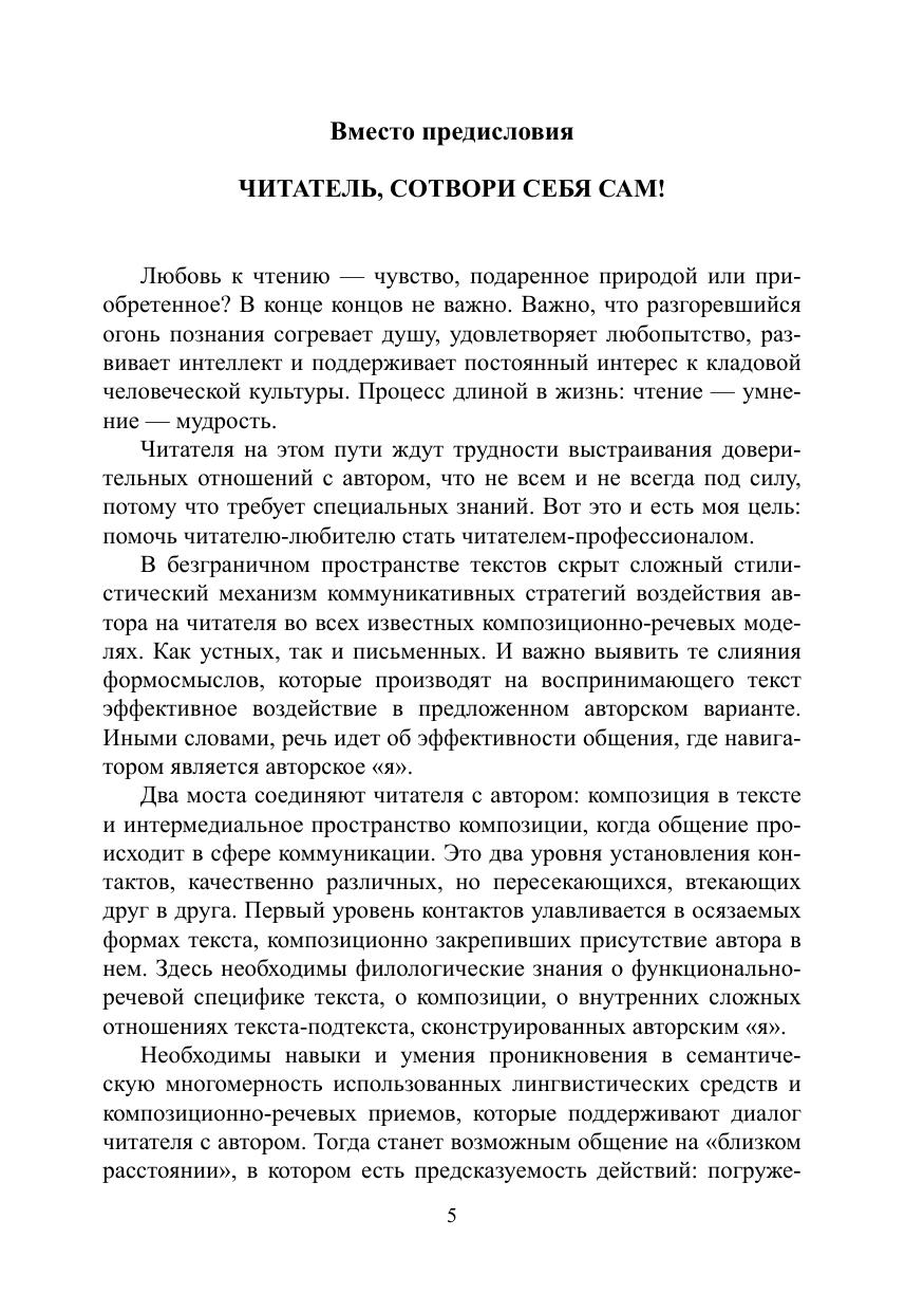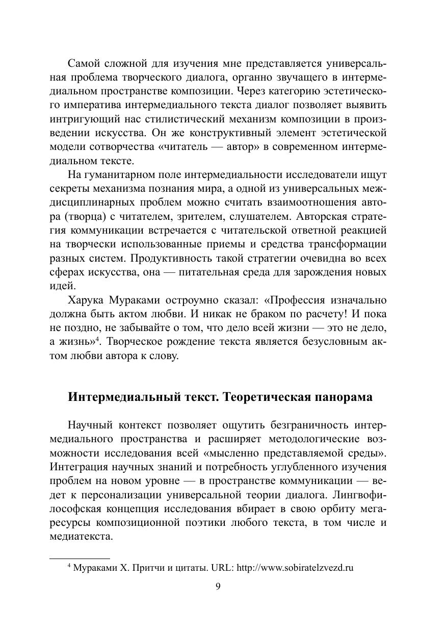 Монография посвящена исследованию эстетического императива классического и современного интермедиального текста в координатах лингвофилософской концепции композиции. Стилистический механизм интермедиальности изучается как эстетическая перекодировка, происходящая в разных видах искусства и отражающая творческое «я» в диалоге «сотворцов» нового произведения — писателя, композитора, режиссера. Развитие идей, высказанных в предыдущих работах («Интермедиальное пространство композиции», «Композиционная поэтика текста», «Эссе: стилистический портрет» и др.), сосредоточено на категории «читатель (слушатель, зритель) и интермедиальный подтекст».
