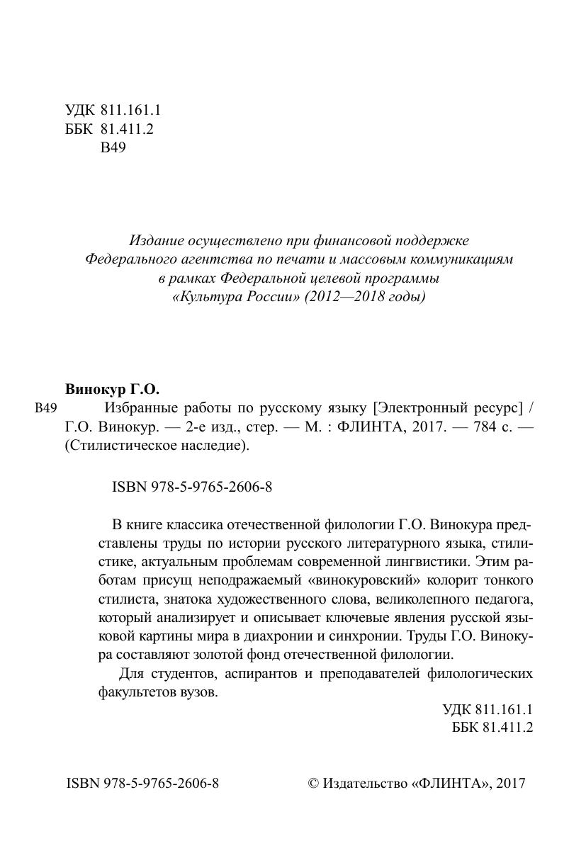 В книге классика отечественной филологии Г.О. Винокура представлены труды по истории русского литературного языка, стилистике, актуальным проблемам современной лингвистики. Этим работам присущ неподражаемый «винокуровский» колорит тонкого стилиста, знатока художественного слова, великолепного педагога, который анализирует и описывает ключевые явления русской языковой картины мира в диахронии и синхронии. Труды Г.О. Винокура составляют золотой фонд отечественной филологии.