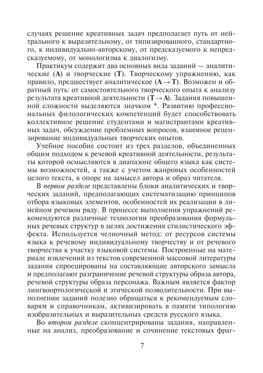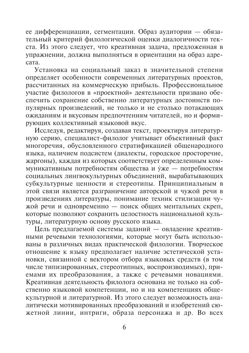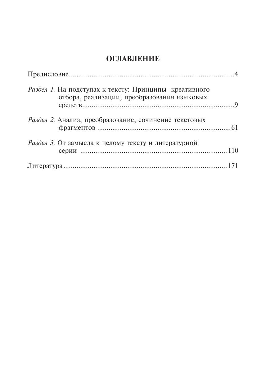 фессиональной деятельности филолога. Извлечения из текстов современной массовой литературы, составляющие основной языковой материал, позволяют обозначить путь от стандартного, формульного способа выражения составляющих замысла, к индивидуально-авторскому, от предсказуемого к непредсказуемому, от монологизма к диалогизму. Пособие состоит из трех разделов. Блоки аналитических и творческих заданий, предполагающих осмысление векторов отбора языковых элементов, особенностей их реализации в линейном речевом ряду, приемов преобразования речевых структур, а также оценку речевых новаций, представлены в первом разделе. Система заданий, направленных на анализ, трансформацию и сочинение текстовых фрагментов, обладающих и содержательной, и модальной определенностью, сконцентрированы во втором разделе. В третьем разделе объектом аналитической и творческой работы становятся отдельный текст и серия текстов. Особое внимание уделено разработке и реализации актуальных литературных проектов.