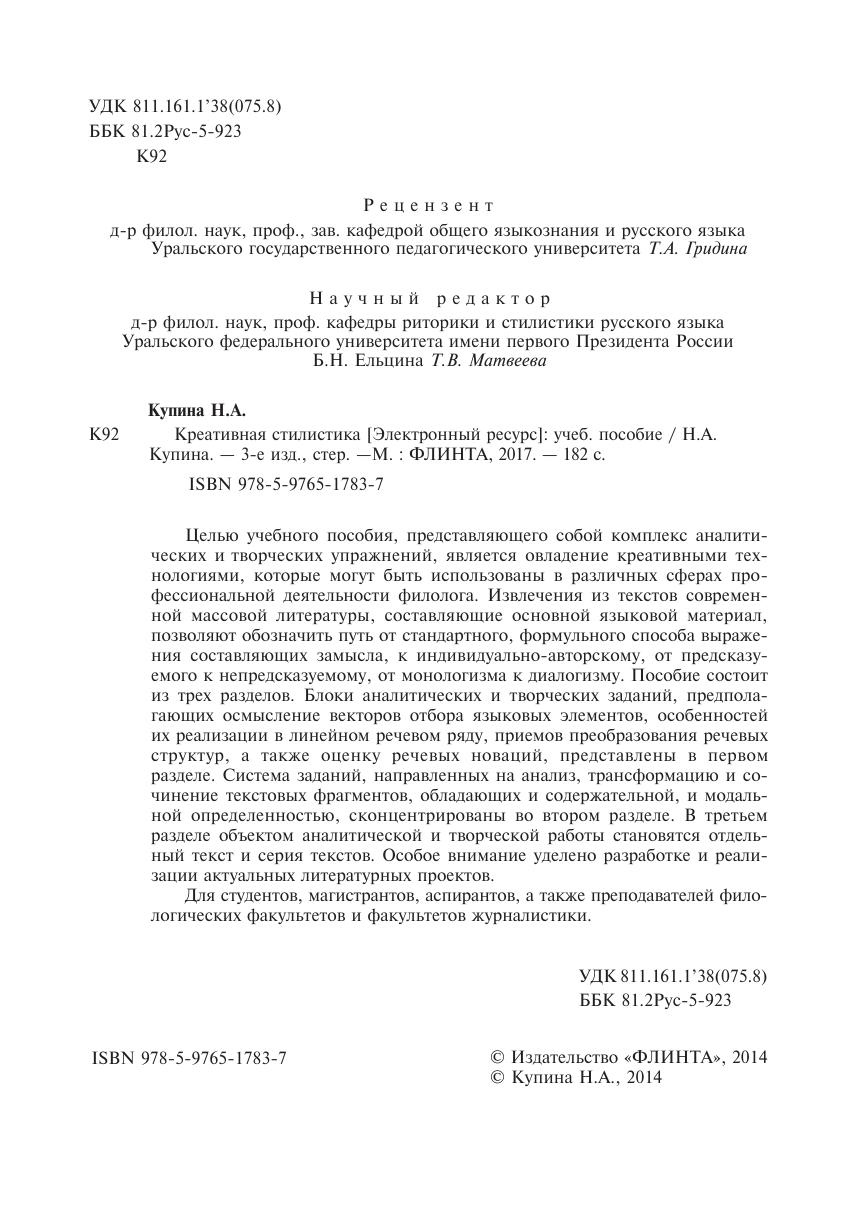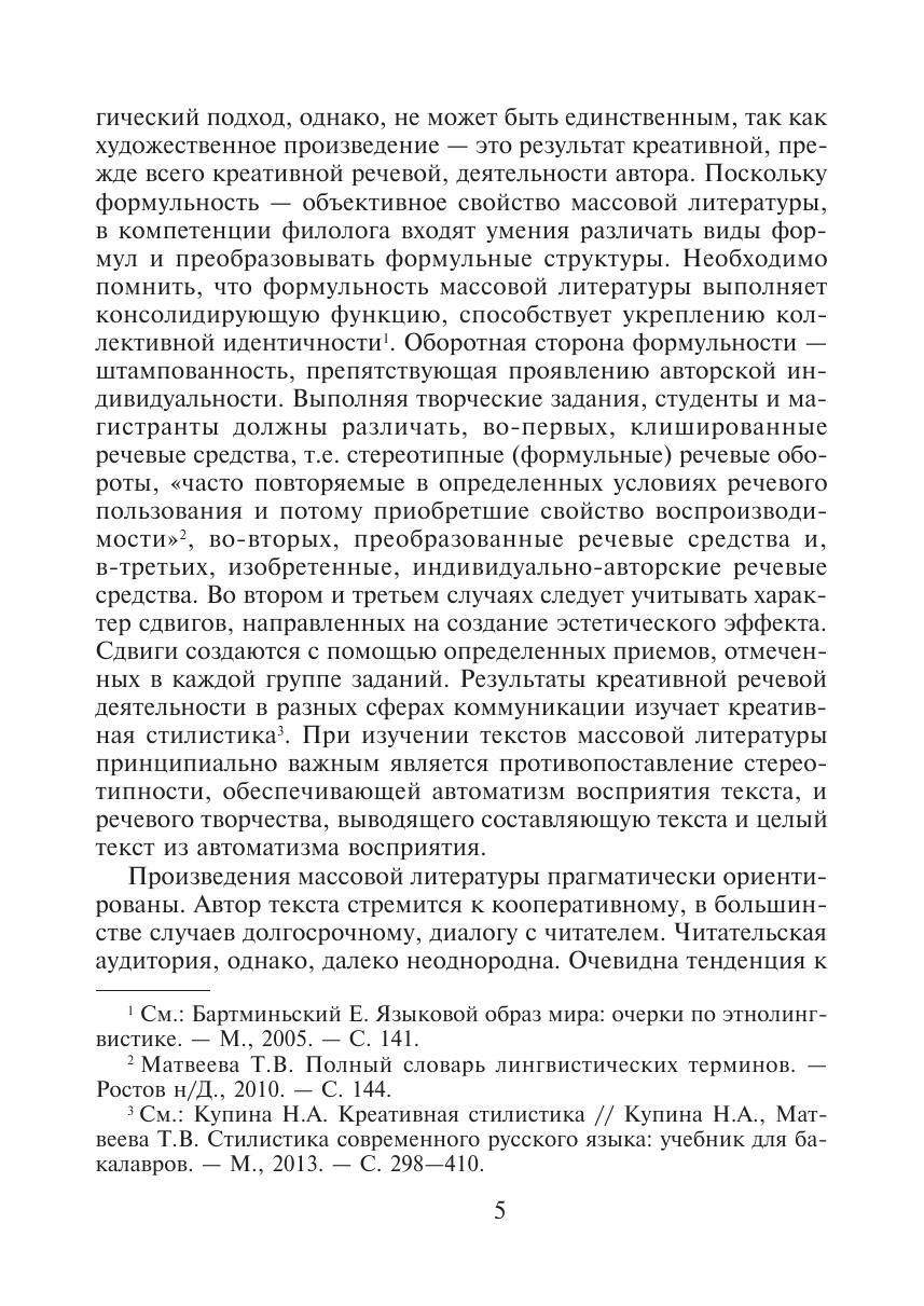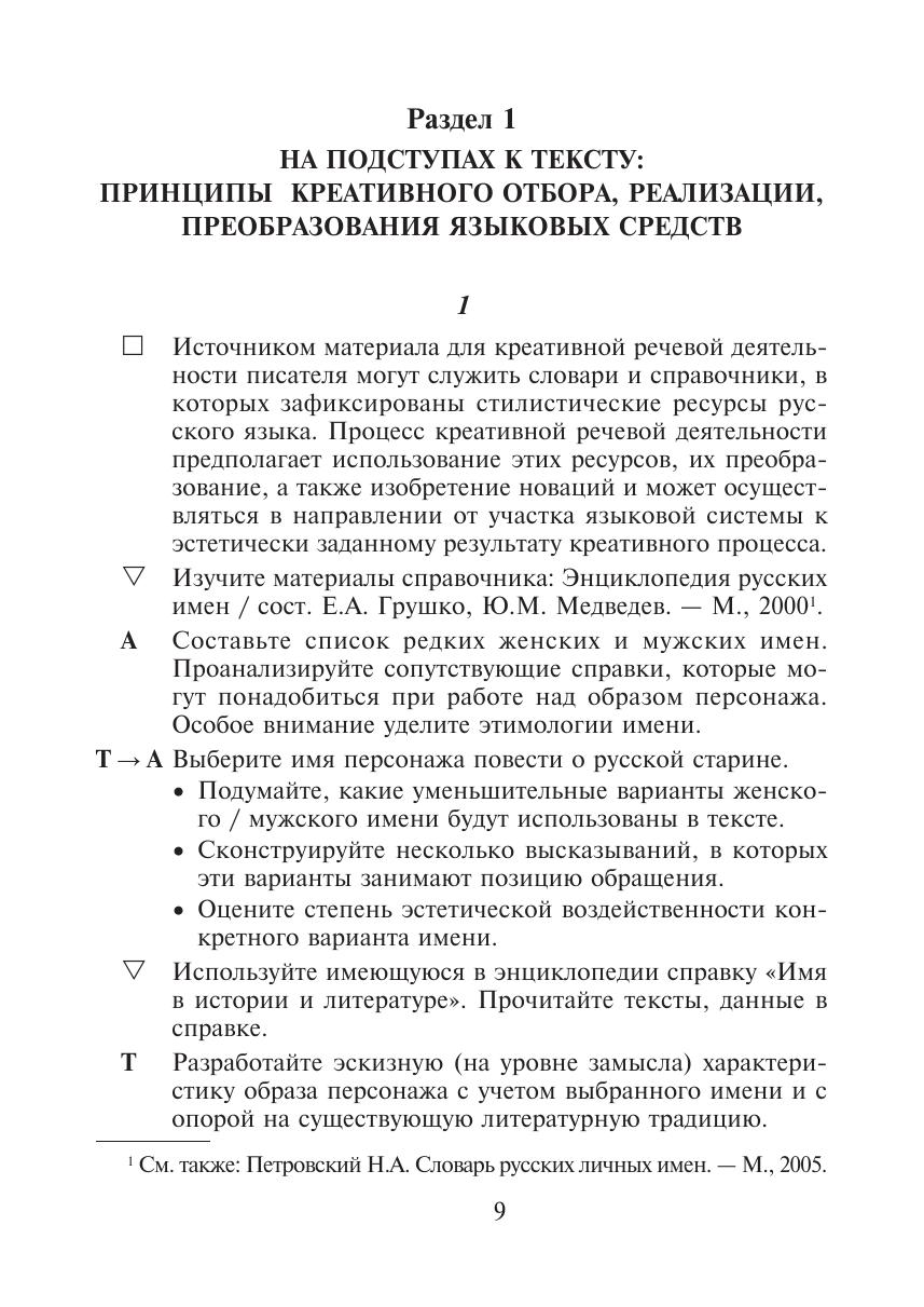 фессиональной деятельности филолога. Извлечения из текстов современной массовой литературы, составляющие основной языковой материал, позволяют обозначить путь от стандартного, формульного способа выражения составляющих замысла, к индивидуально-авторскому, от предсказуемого к непредсказуемому, от монологизма к диалогизму. Пособие состоит из трех разделов. Блоки аналитических и творческих заданий, предполагающих осмысление векторов отбора языковых элементов, особенностей их реализации в линейном речевом ряду, приемов преобразования речевых структур, а также оценку речевых новаций, представлены в первом разделе. Система заданий, направленных на анализ, трансформацию и сочинение текстовых фрагментов, обладающих и содержательной, и модальной определенностью, сконцентрированы во втором разделе. В третьем разделе объектом аналитической и творческой работы становятся отдельный текст и серия текстов. Особое внимание уделено разработке и реализации актуальных литературных проектов.