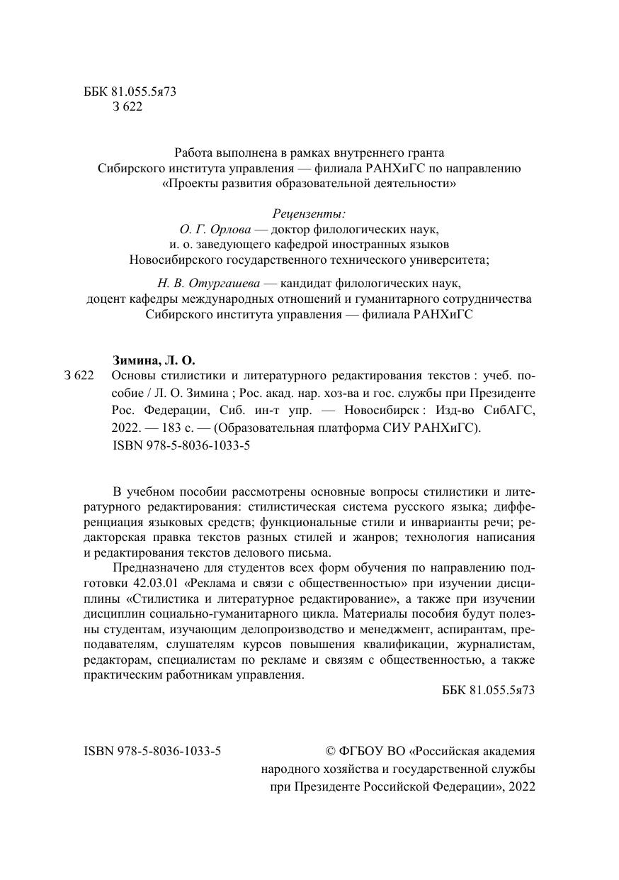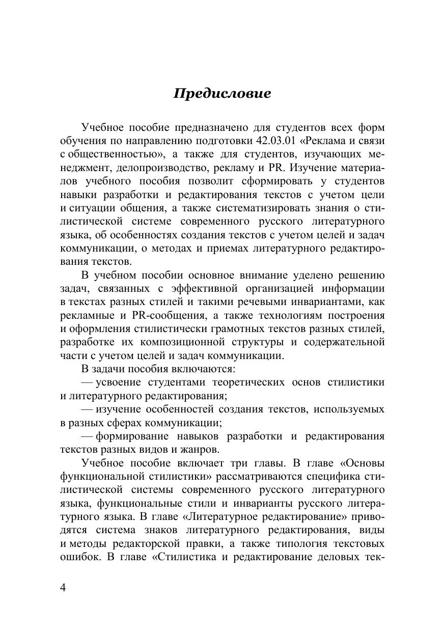 В учебном пособии рассмотрены основные вопросы стилистики и лите-ратурного редактирования: стилистическая система русского языка; диффе-ренциация языковых средств; функциональные стили и инварианты речи; ре-дакторская правка текстов разных стилей и жанров; технология написания и редактирования текстов делового письма. Предназначено для студентов всех форм обучения по направлению под-готовки 42.03.01 «Реклама и связи с общественностью» при изучении дисци-плины «Стилистика и литературное редактирование», а также при изучении дисциплин социально-гуманитарного цикла. Материалы пособия будут полез-ны студентам, изучающим делопроизводство и менеджмент, аспирантам, пре-подавателям, слушателям курсов повышения квалификации, журналистам, редакторам, специалистам по рекламе и связям с общественностью, а также практическим работникам управления.