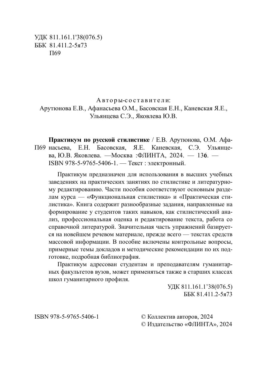 Практикум предназначен для использования в высших учебных заведениях на практических занятиях по стилистике и литературному редактированию. Части пособия соответствуют основным разделам курса — «Функциональная стилистика» и «Практическая стилистика». Книга содержит разнообразные задания, направленные на формирование у студентов таких навыков, как стилистический анализ, профессиональная оценка и редактирование текста, работа со справочной литературой. Значительная часть упражнений базируется на новейшем речевом материале, прежде всего — текстах средств массовой информации. В пособие включены контрольные вопросы, примерные темы докладов и методические рекомендации по их подготовке, подробная библиография. Практикум адресован студентам и преподавателям гуманитарных факультетов вузов, может применяться также в старших классах школ гуманитарного профиля.