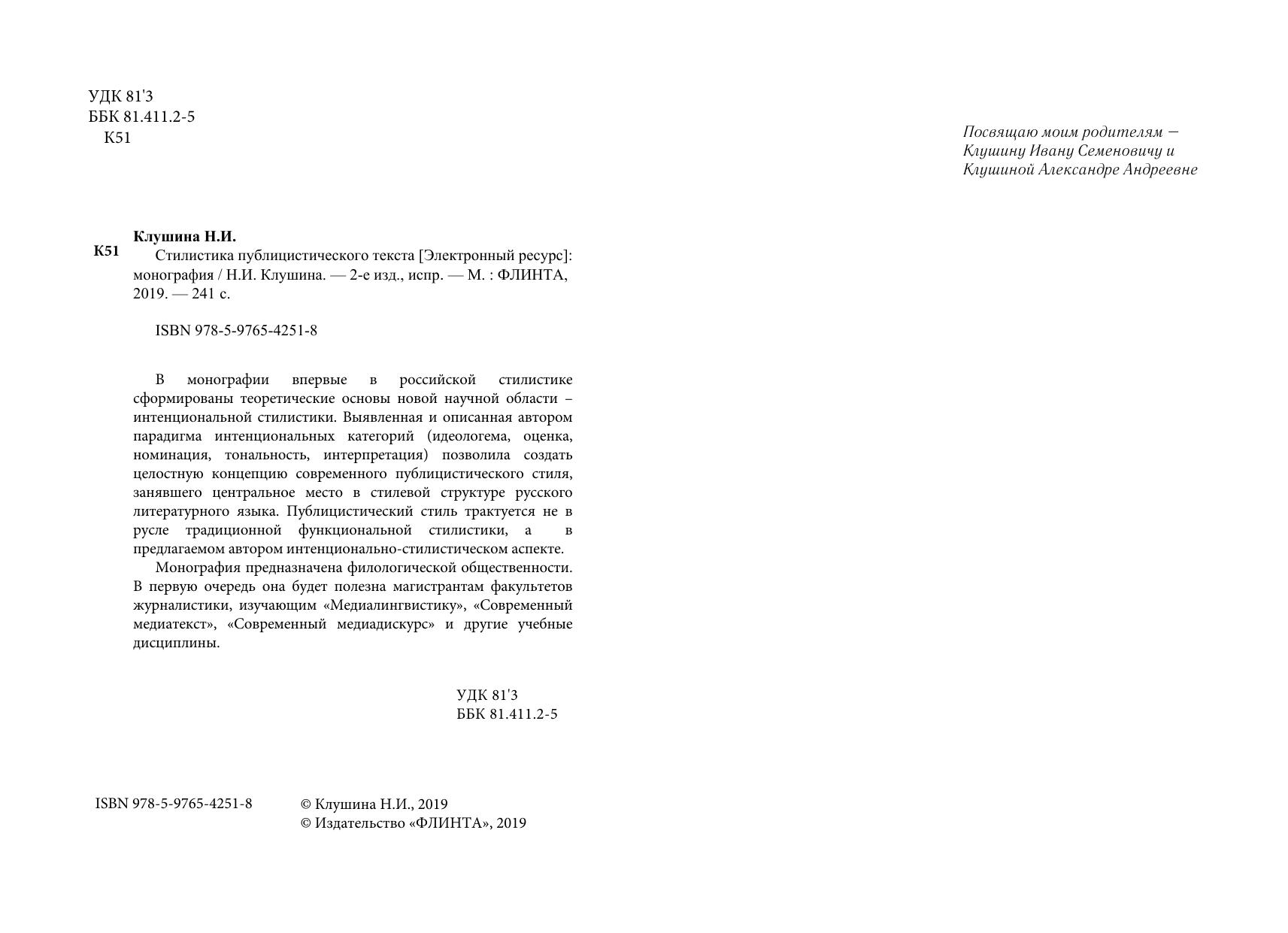 В монографии впервые в российской стилистике сформированы теоретические основы новой научной области – интенциональной стилистики. Выявленная и описанная автором парадигма интенциональных категорий (идеологема, оценка, номинация, тональность, интерпретация) позволила создать целостную концепцию современного публицистического стиля, занявшего центральное место в стилевой структуре русского литературного языка. Публицистический стиль трактуется не в русле традиционной функциональной стилистики, а в предлагаемом автором интенционально-стилистическом аспекте.