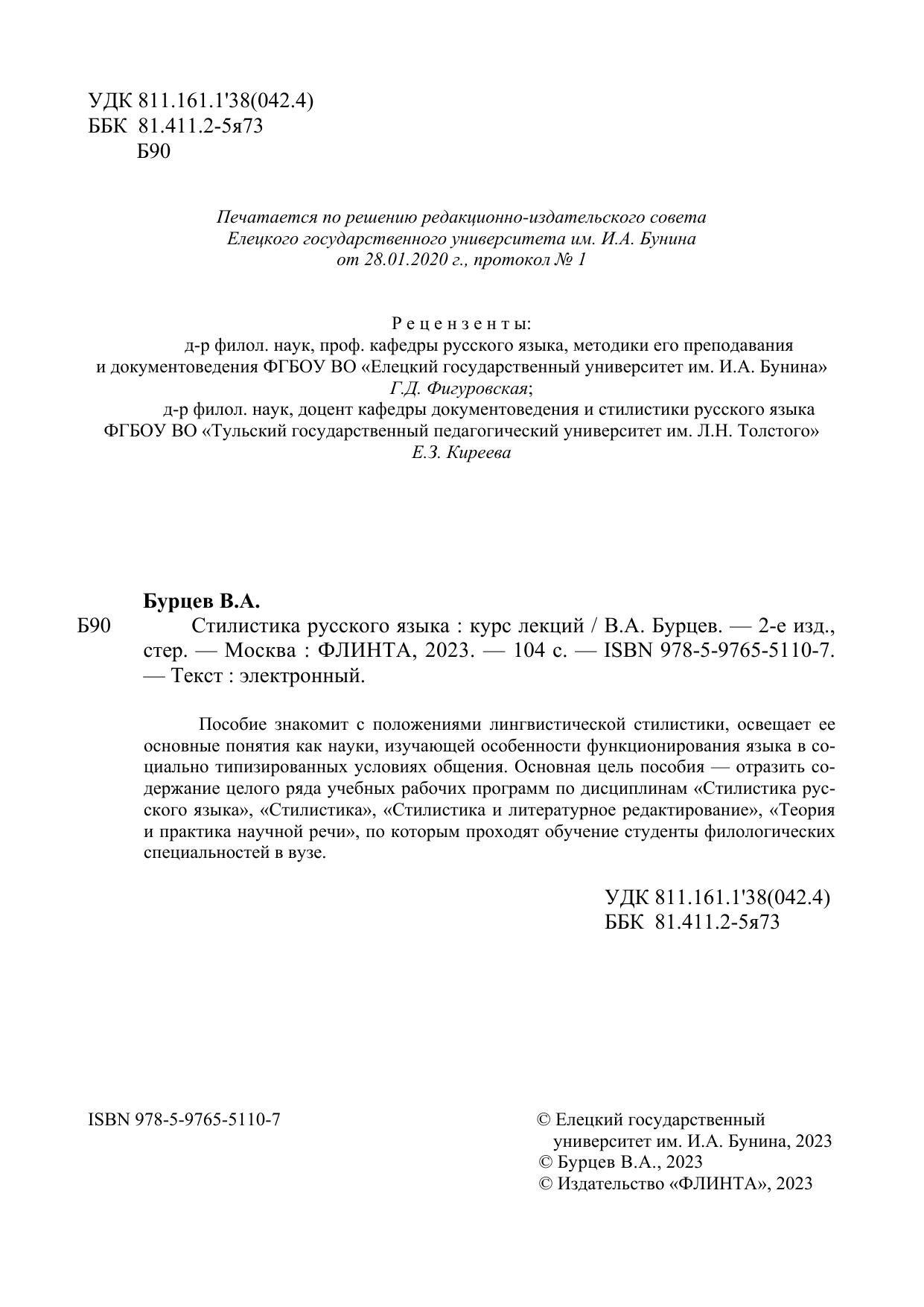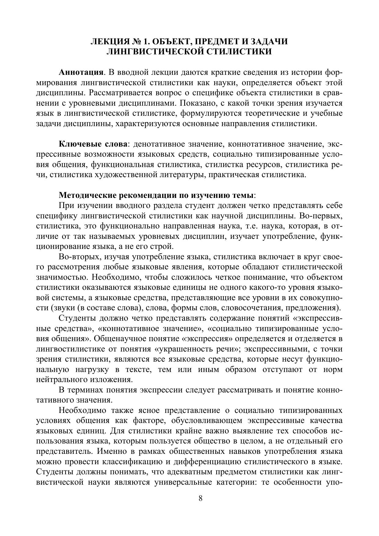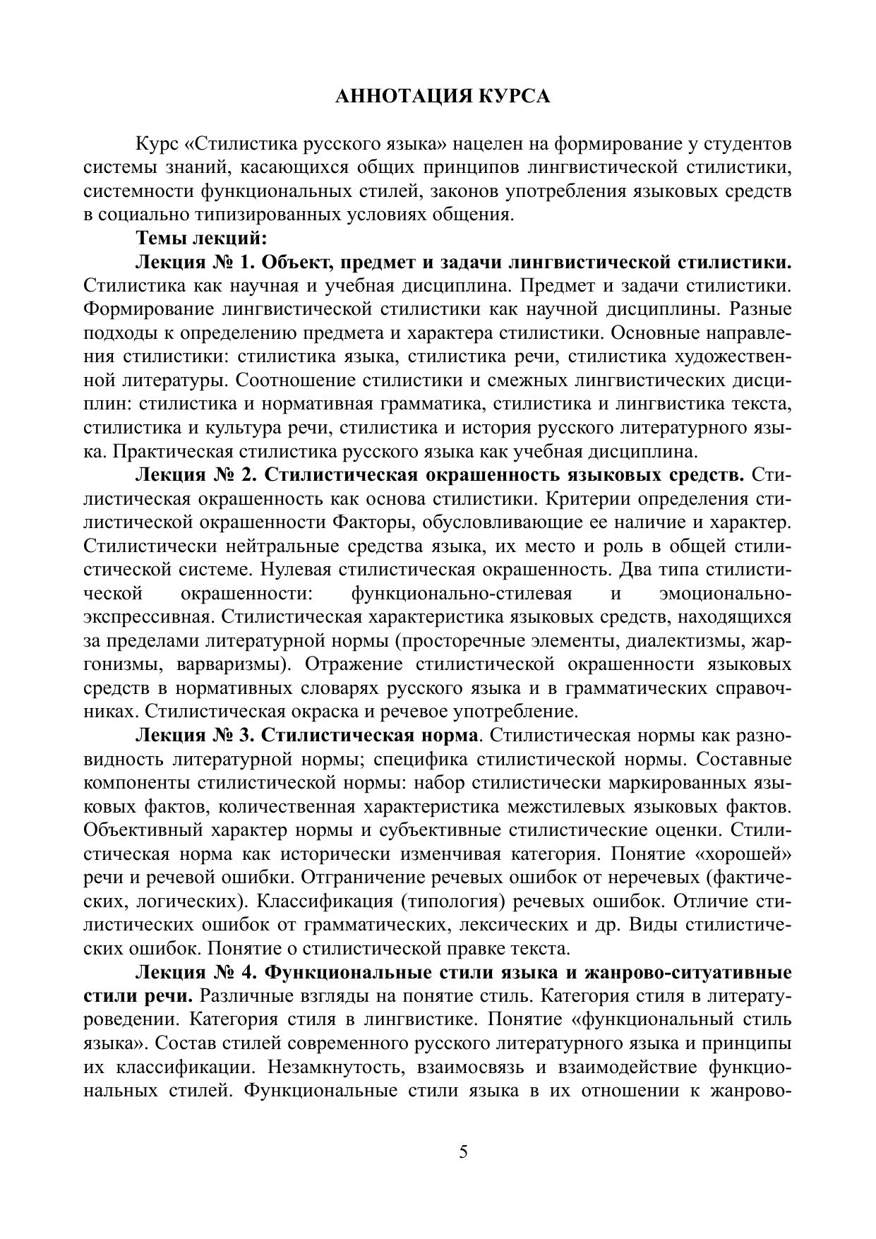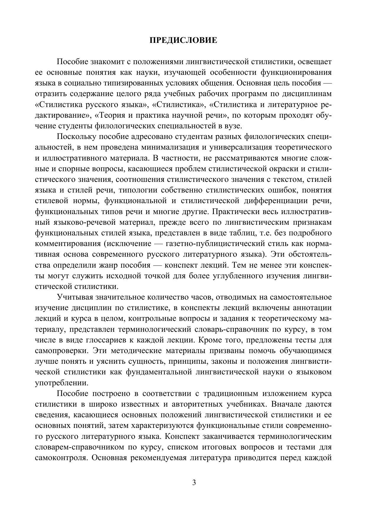 Пособие знакомит с положениями лингвистической стилистики, освещает ее основные понятия как науки, изучающей особенности функционирования языка в со-циально типизированных условиях общения. Основная цель пособия — отразить содержание целого ряда учебных рабочих программ по дисциплинам «Стилистика русского языка», «Стилистика», «Стилистика и литературное редактирование», «Теория и практика научной речи», по которым проходят обучение студенты филологических специальностей в вузе.