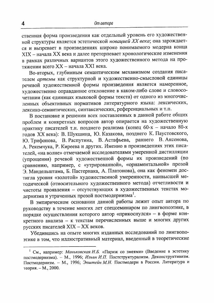 В монографии декларируется и на фактах истории русской литературы ХХ века доказывается положение о том, что в художественной структуре литературного произведения (в контексте общехудожественного направления – модернизма) зарождается и вызревает новая, дополнительная строевая часть (уровень) – т.н. речевая художественная форма, отдельная от содержания, собственно литературной формы и языковой «упаковки» произведения. Как таковая, речевая художественная составляет предмет особой филологической дисциплины – лингвопоэтики.